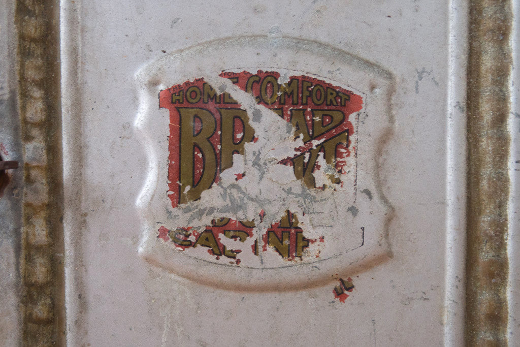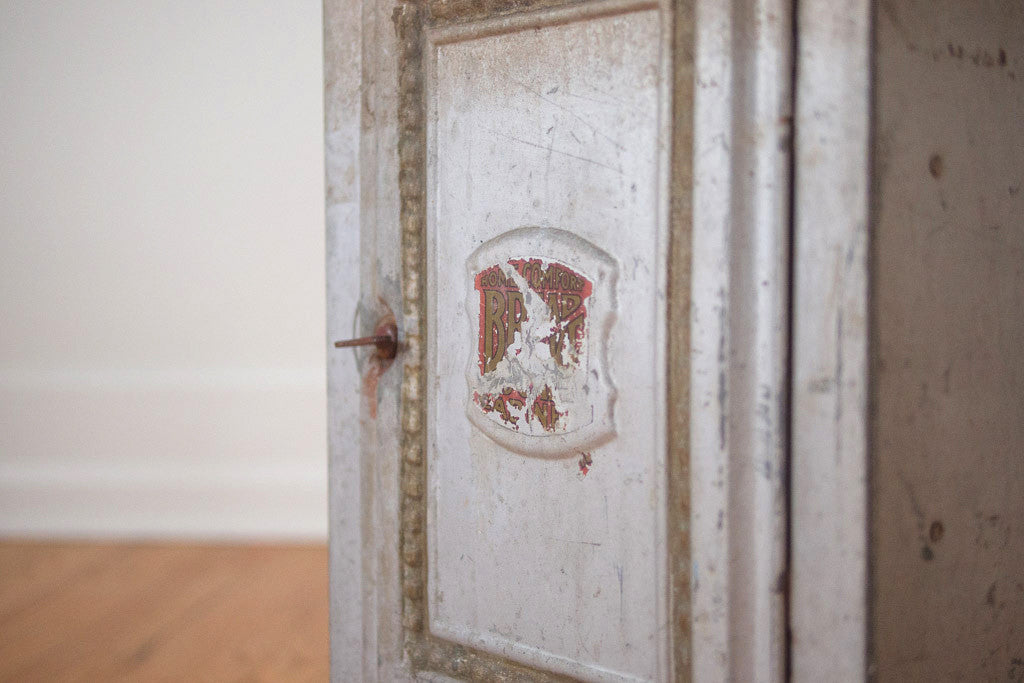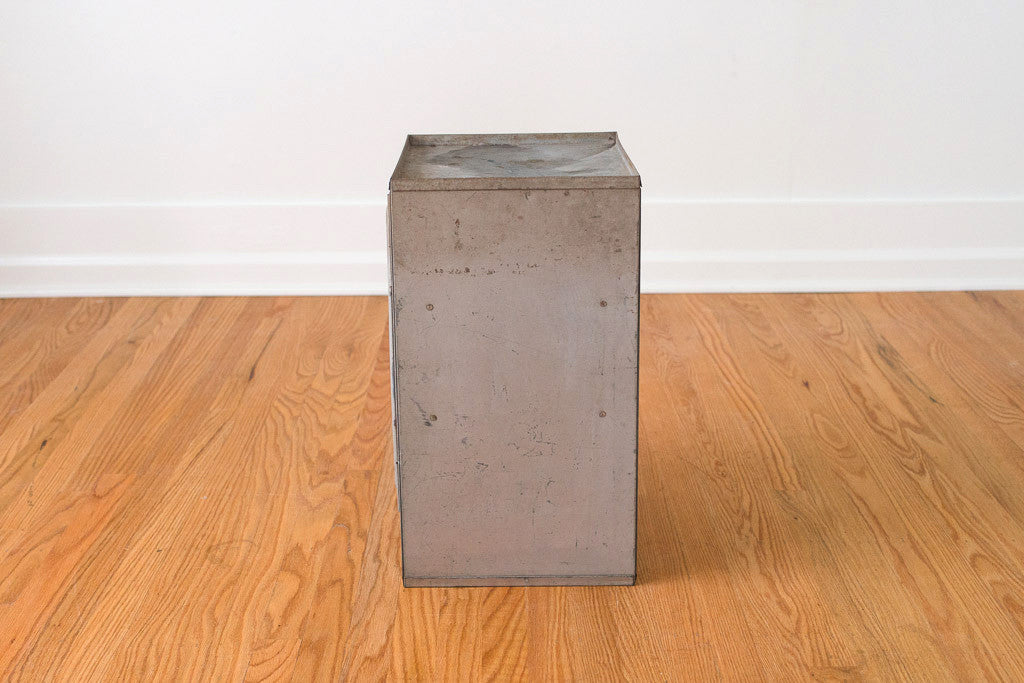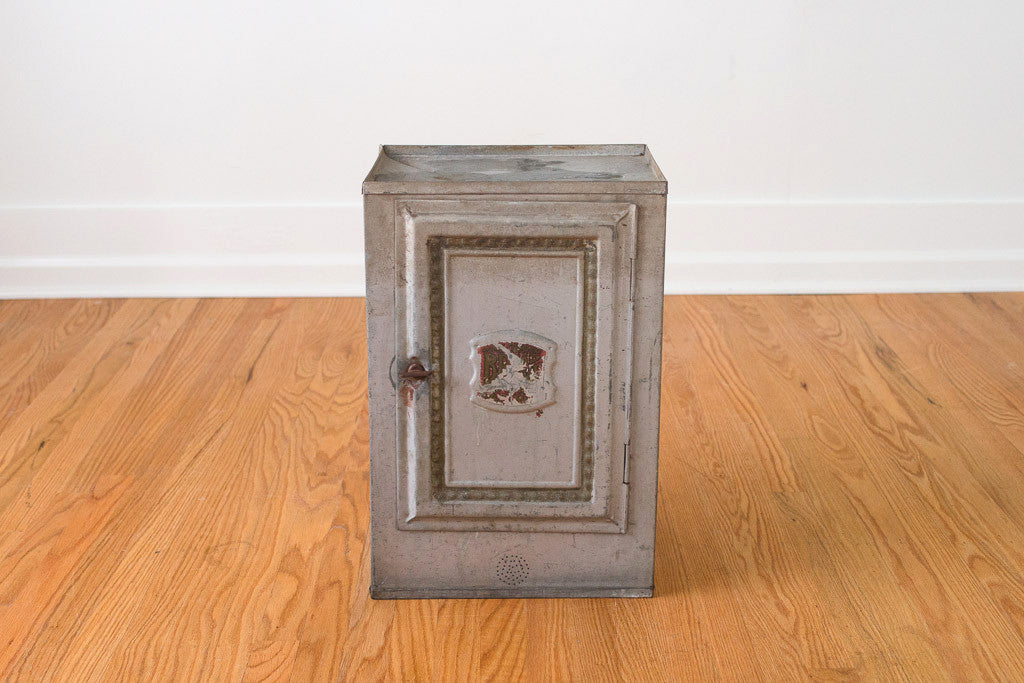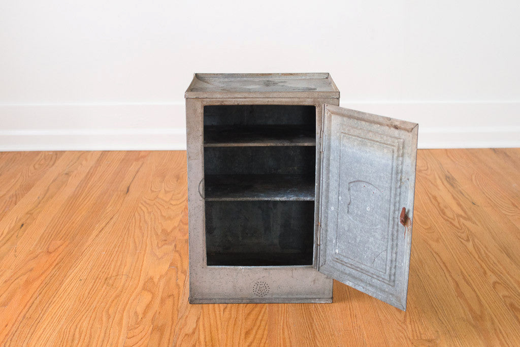 This vintage metal bread box has a hinged door and two interior shelves. It's the perfect size to be used as a side table or night stand. It could also be mounted on the wall or used on the counter for extra storage.