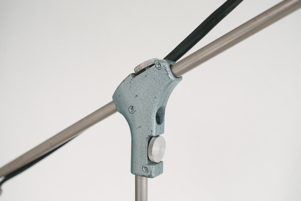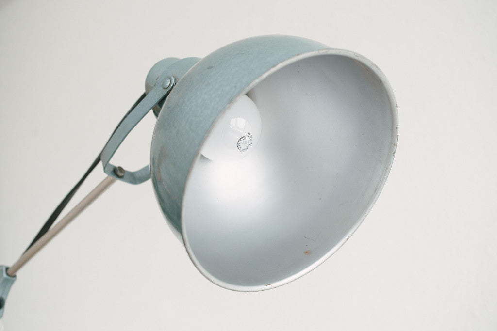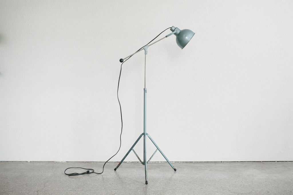style: Mid Century, industrial, spotlight, floor lamp, blue/silver