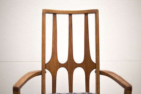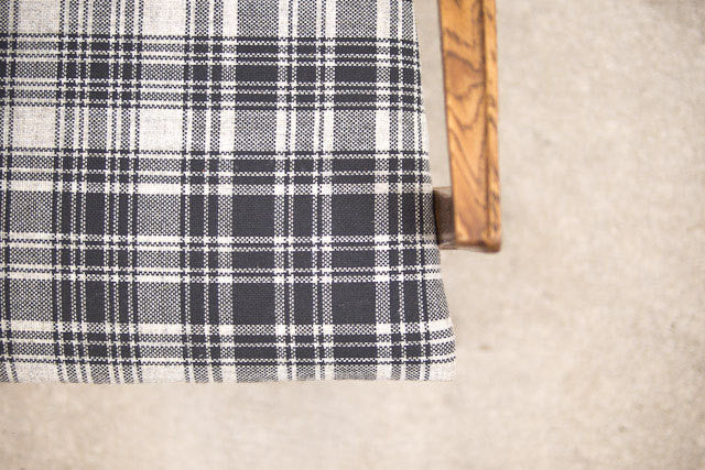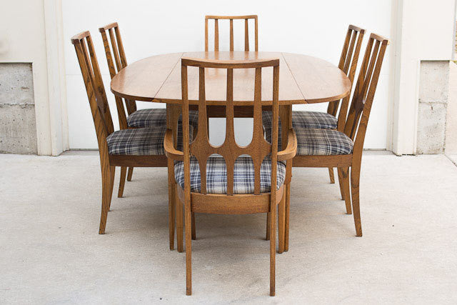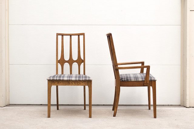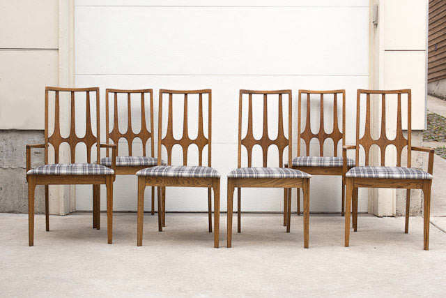 Custom upholstered set of six oak Mid Century Brasilia dining chairs. There are two arm chairs and four basic chairs. They are covered in a vintage, period appropriate dark gray on light gray plaid tweed material. These chairs are in overall excellent condition. We are selling the matching oval dining table separately if you are interested in the complete set.