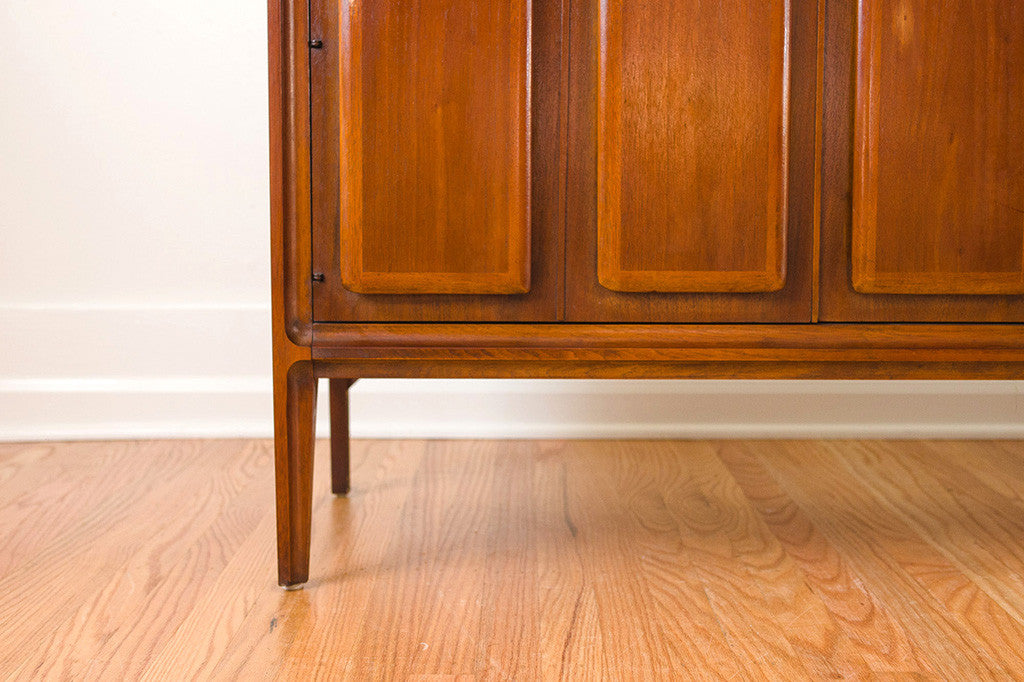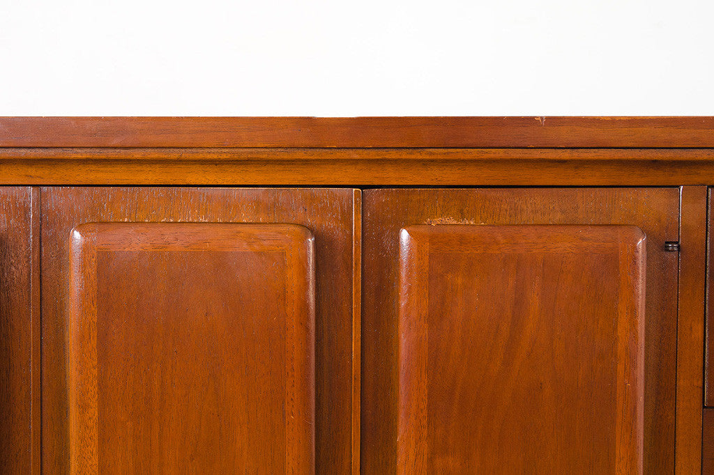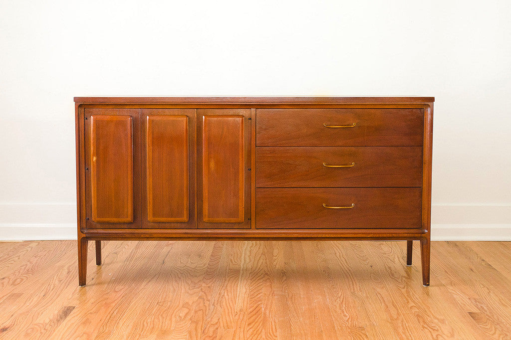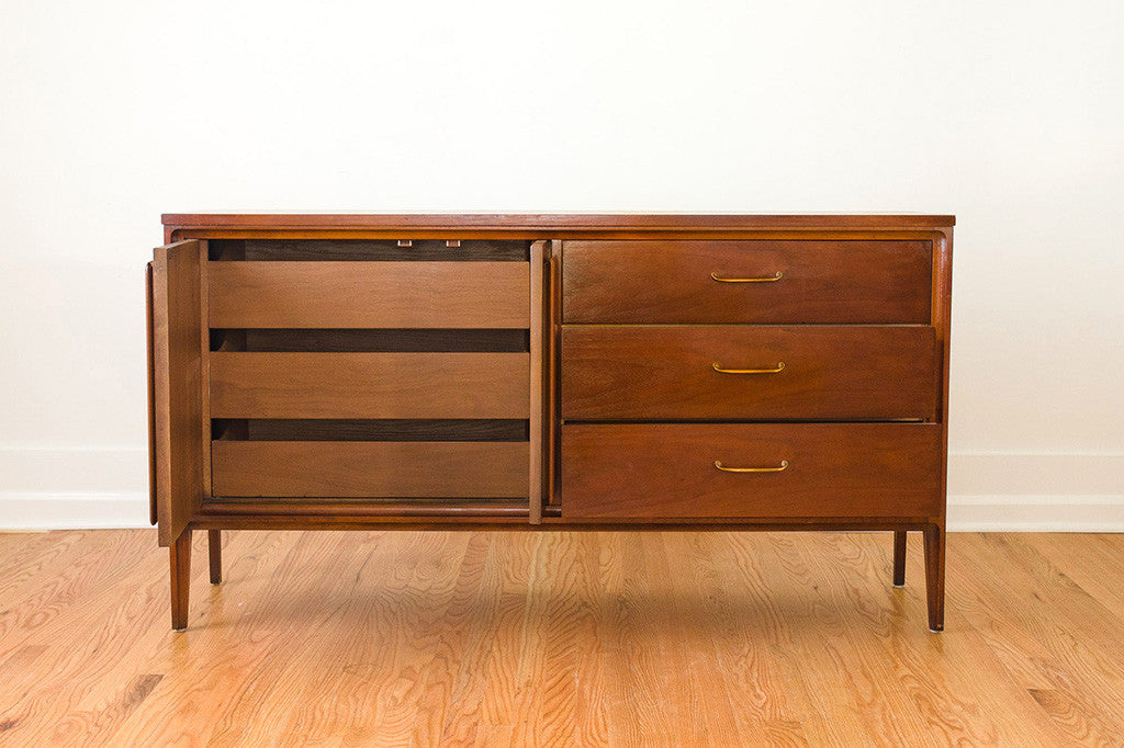 This vintage Mid Century dresser was manufactured by Broyhill as part of their "Forward 70" line. It's a six drawer lowboy style with a generous amount of storage space. It has three traditional drawers and three drawers hidden behind two doors. This piece has a solid wood top, brass handles and is in overall great shape with some light age related wear. It could also be used as a credenza, sideboard or buffet in a dining room. Please see pictures for detailed condition of this piece.