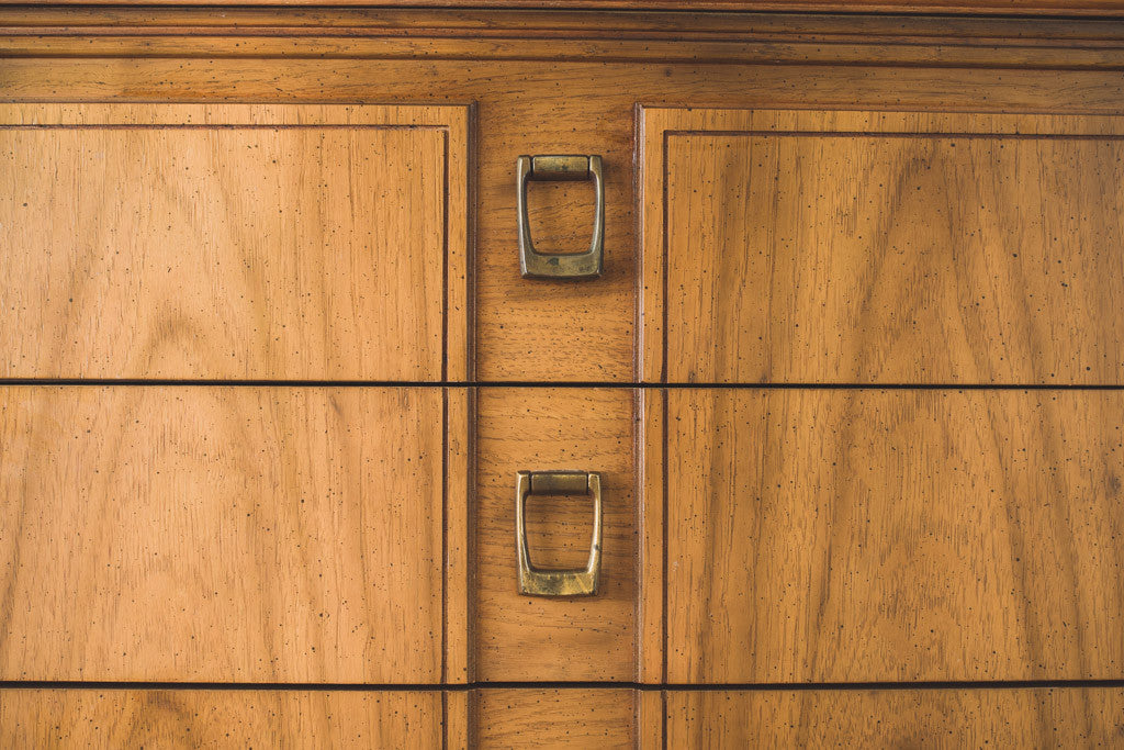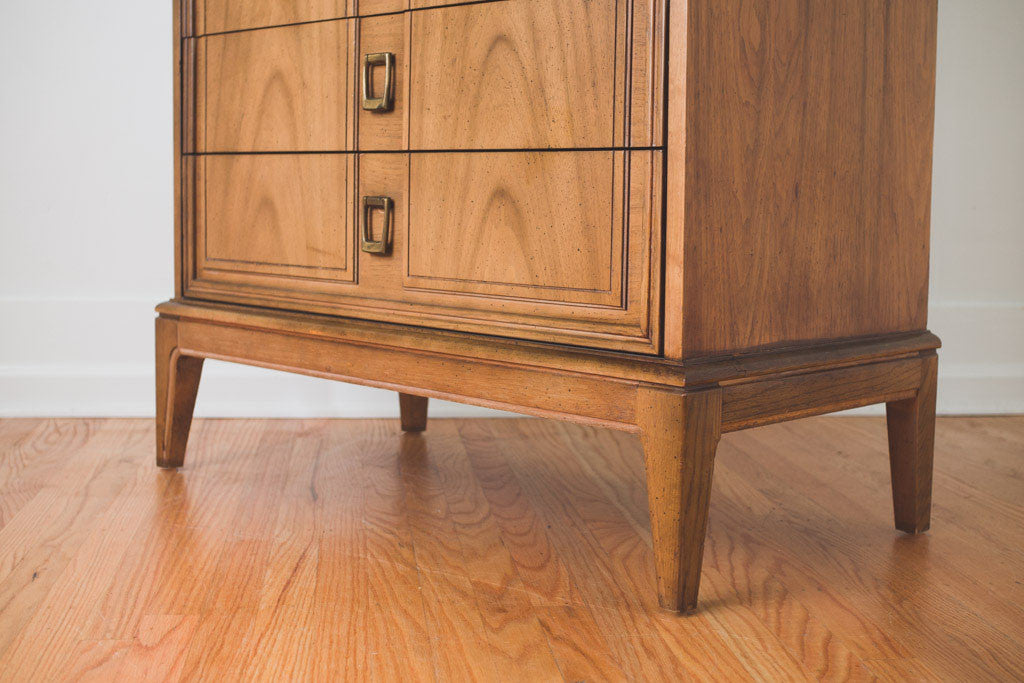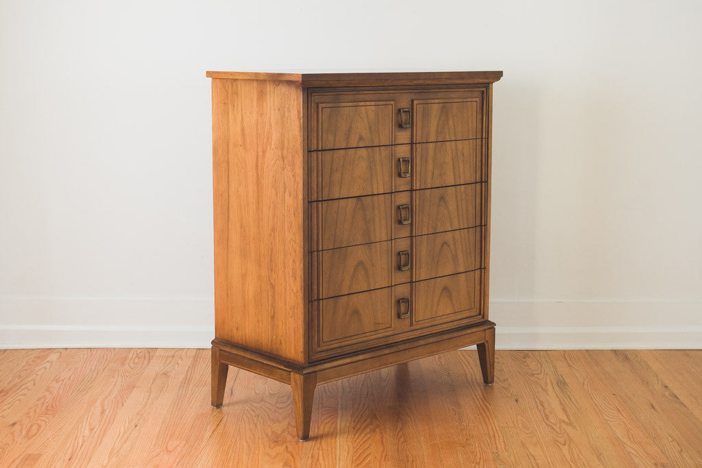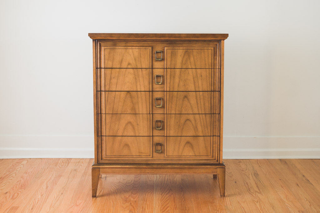This Mid Century five drawer highboy dresser has square brass pulls and a wood top. It's in good shape with age related wear. See pictures for detailed condition.