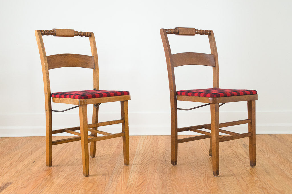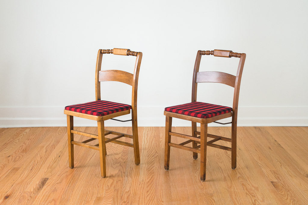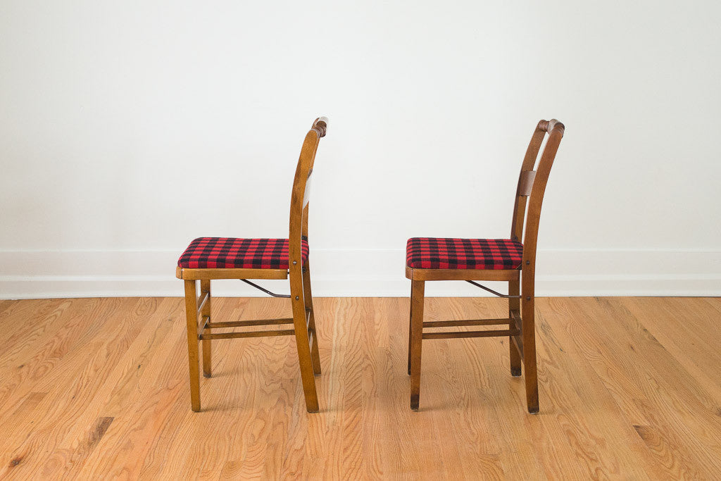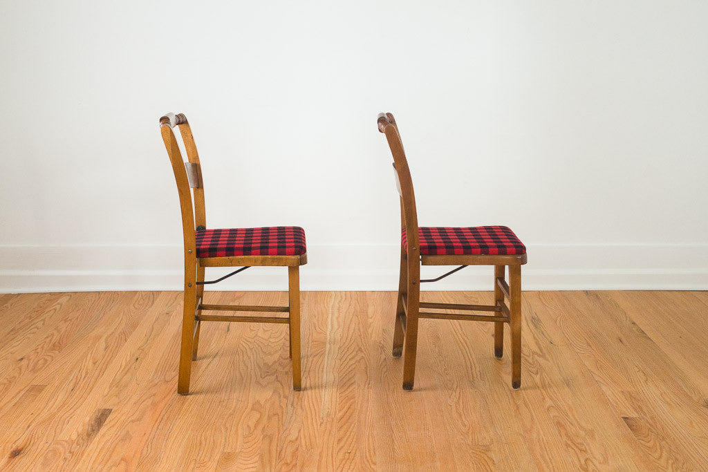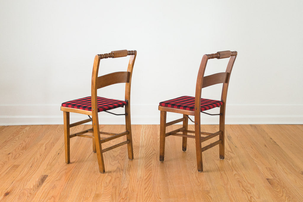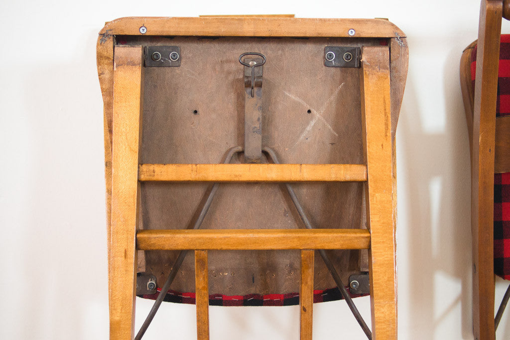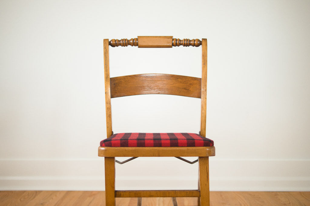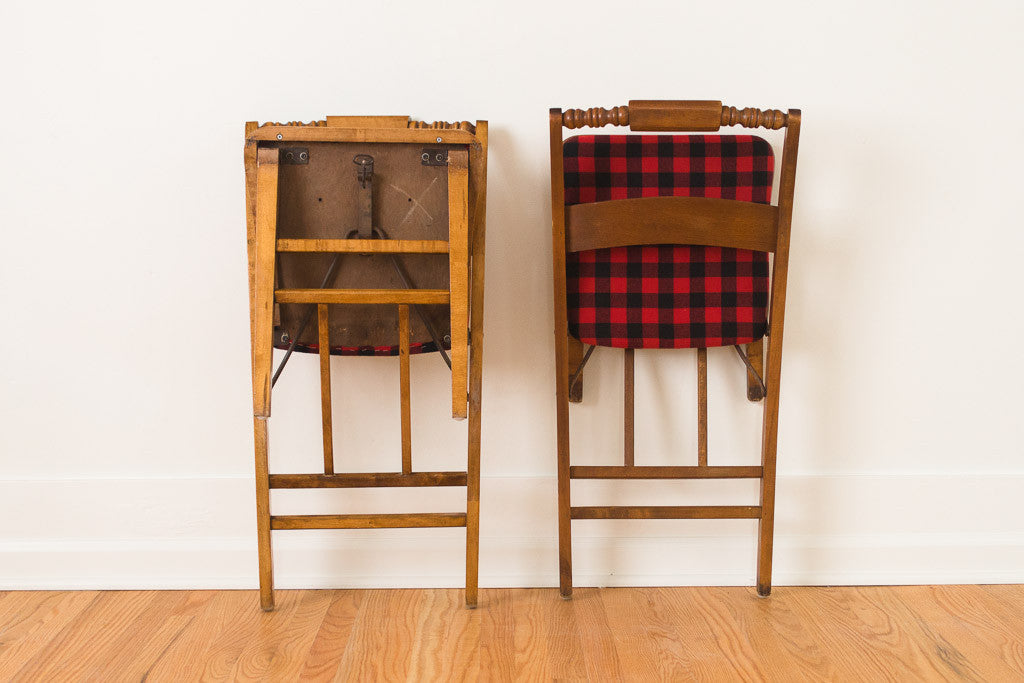Pair of custom upholstered vintage wood folding camp chairs. The wood frames and folding mechanisms were recently tightened and re-glued. These chairs are very sturdy for folding chairs. They are upholstered in a black and red wool buffalo check fabric that is in perfect condition. Great for extra seating or to take camping.