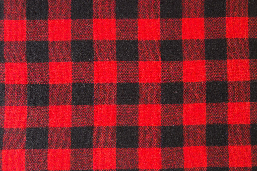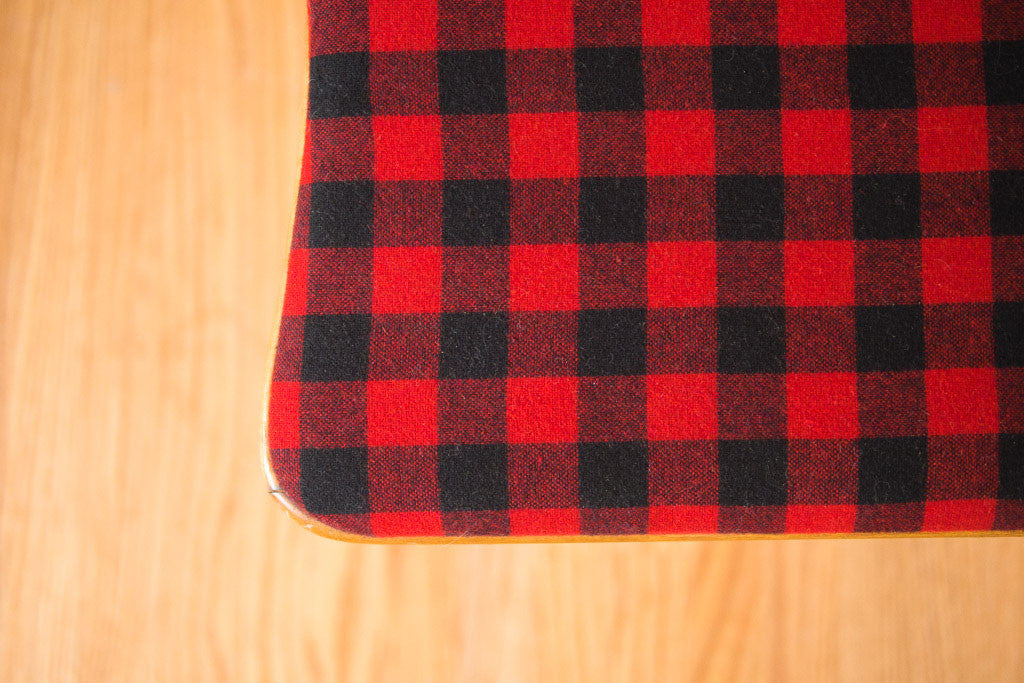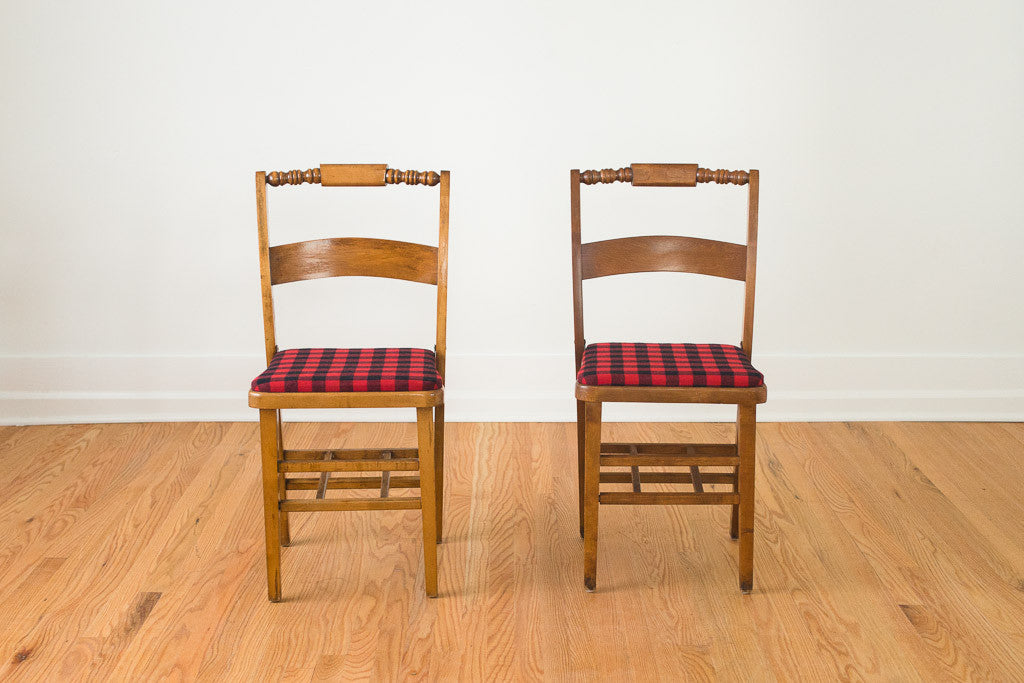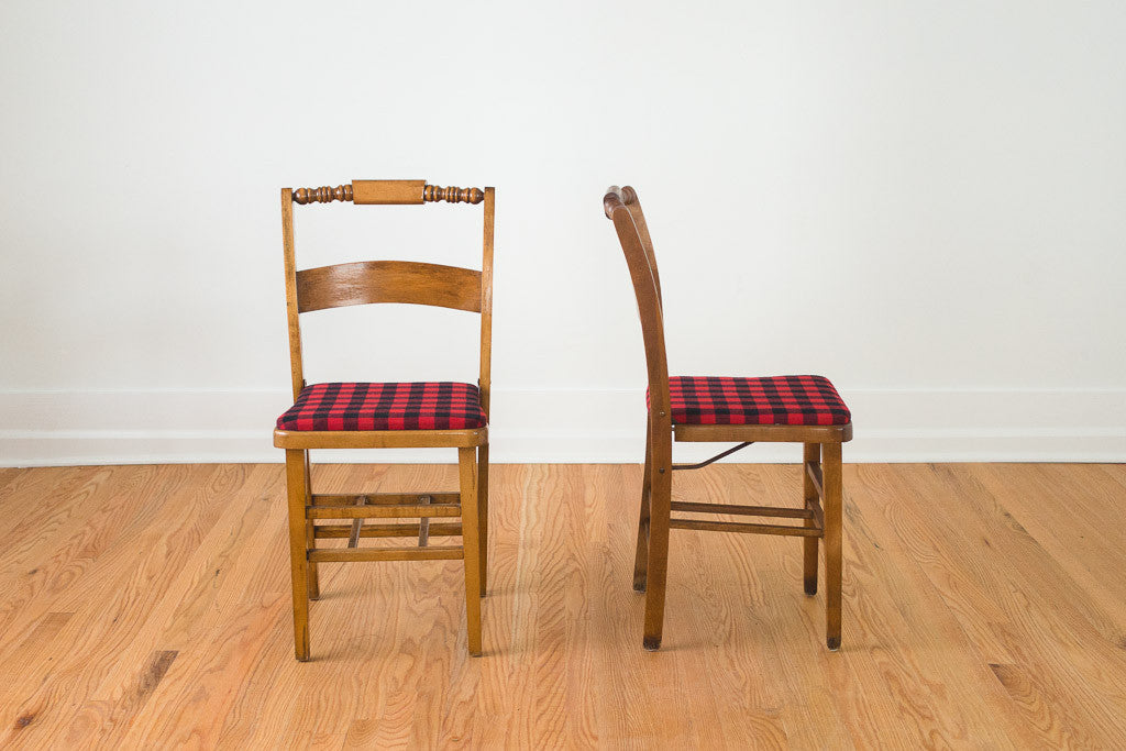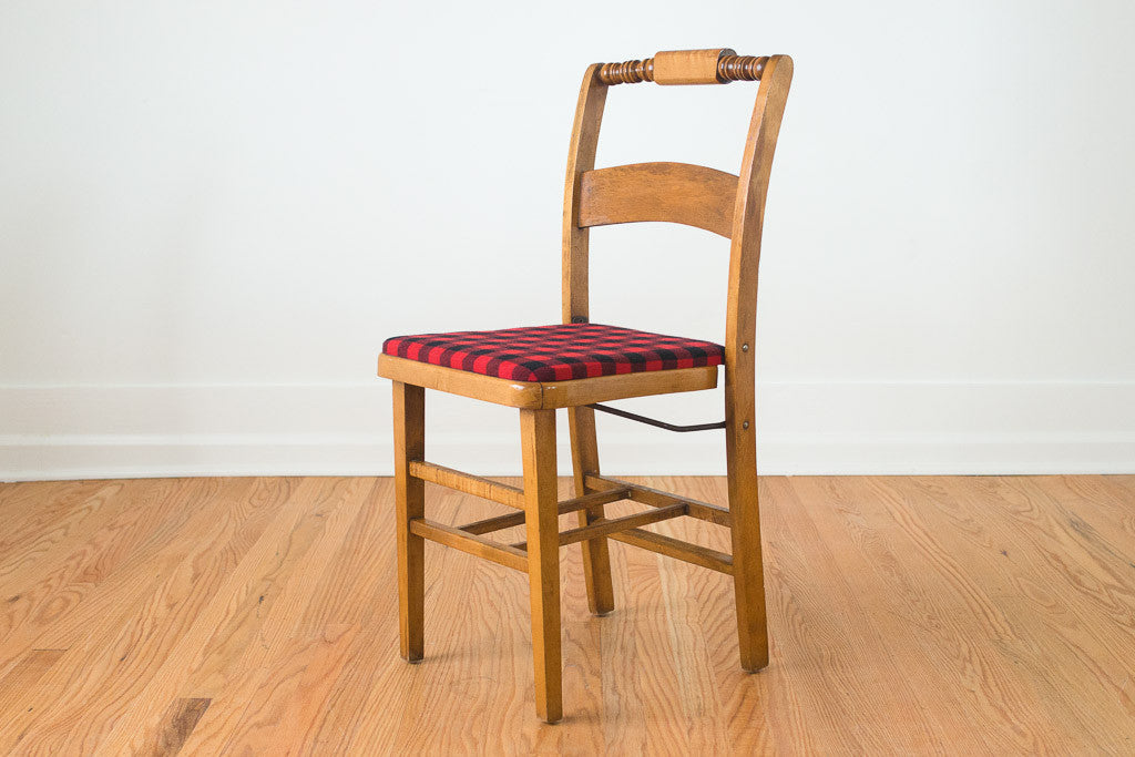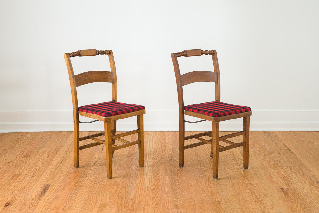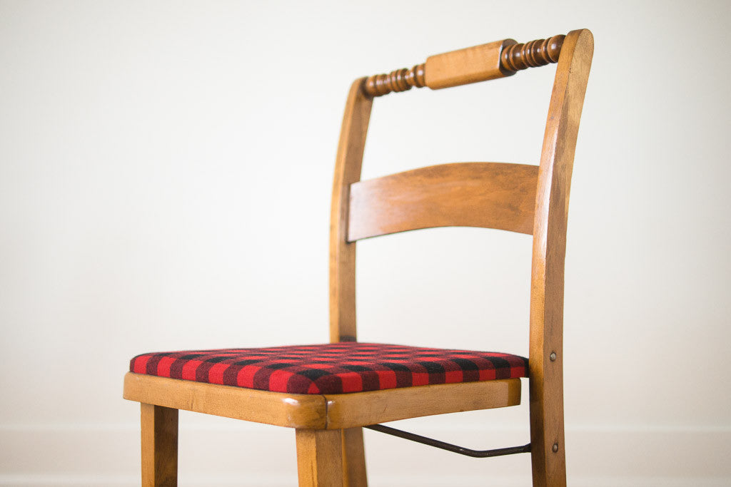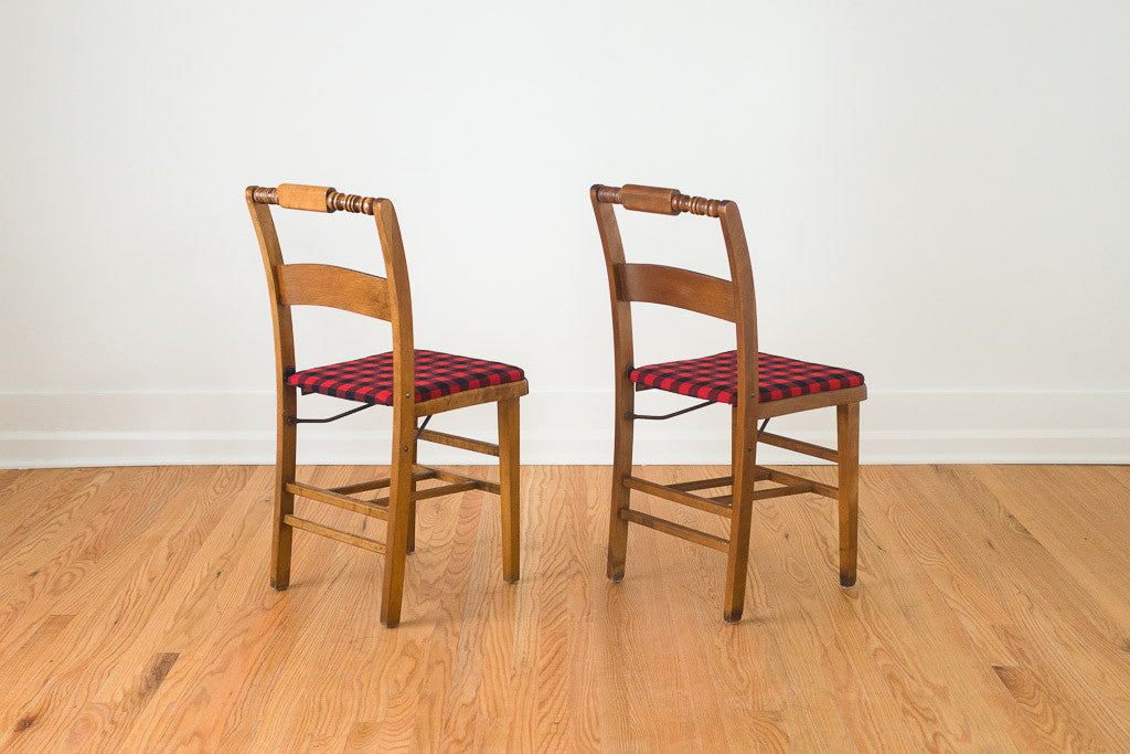 Pair of custom upholstered vintage wood folding camp chairs. The wood frames and folding mechanisms were recently tightened and re-glued. These chairs are very sturdy for folding chairs. They are upholstered in a black and red wool buffalo check fabric that is in perfect condition. Great for extra seating or to take camping.