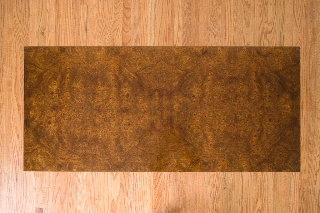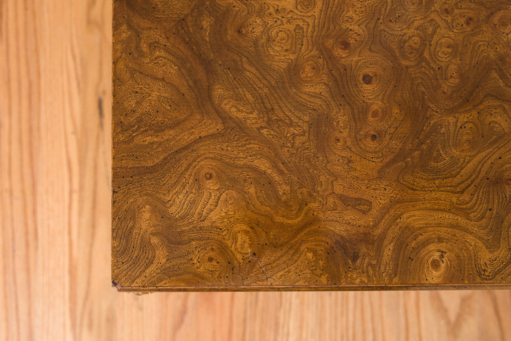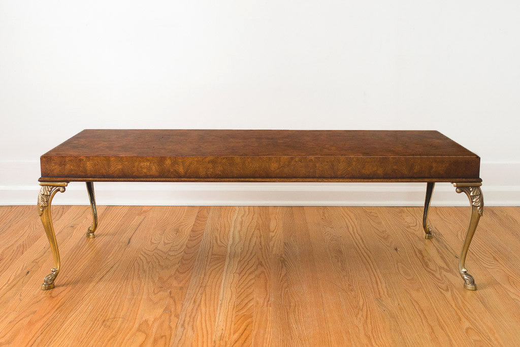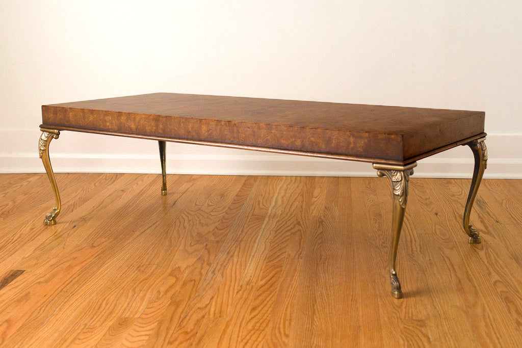 This vintage Hollywood Regency style coffee table has a burl wood veneer top and solid brass cabriole (or queen anne) style legs. We can't find any information on the manufacturer or age. Obviously a stunning, high-end piece. Shows some light signs of wear.