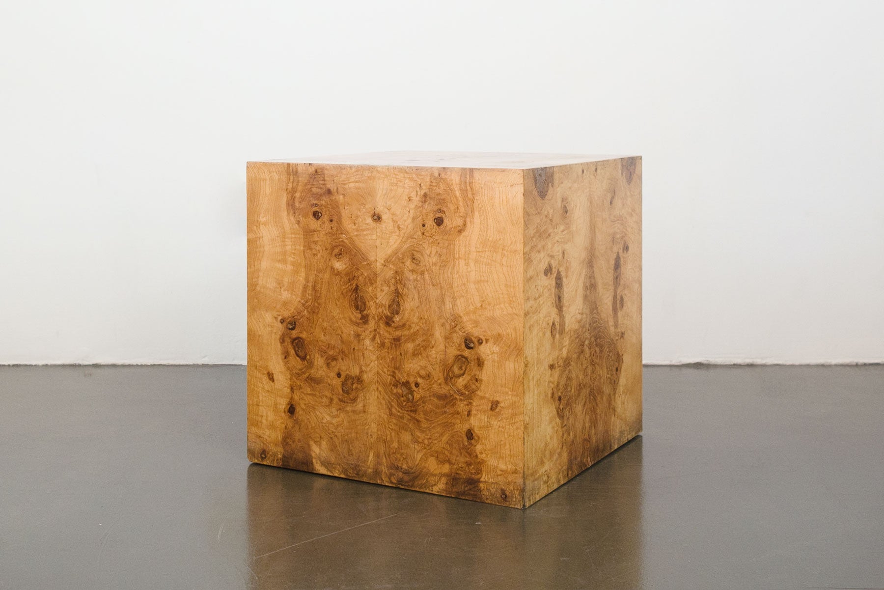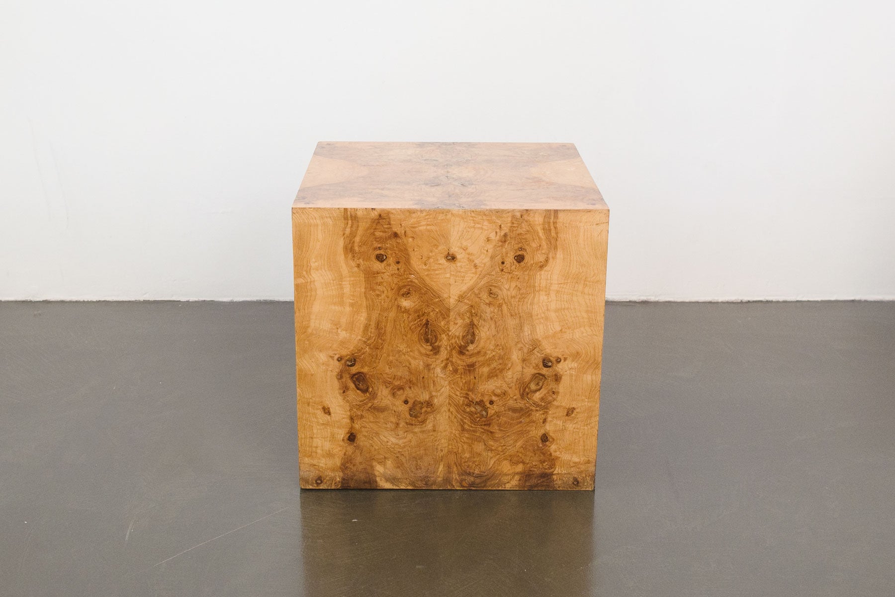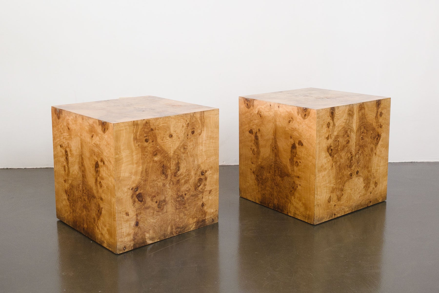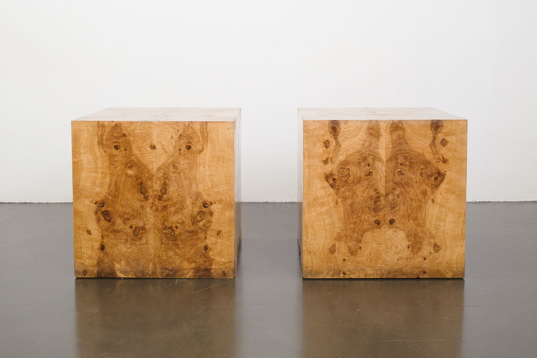 style: pair, modern, cube, side / end / coffee table, nightstands material: burlwood brand: Intrex age: vintage, Mid Century condition: good, age related wear - see pictures