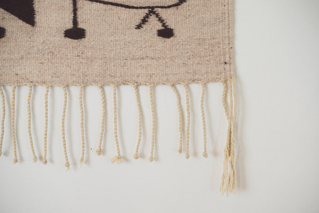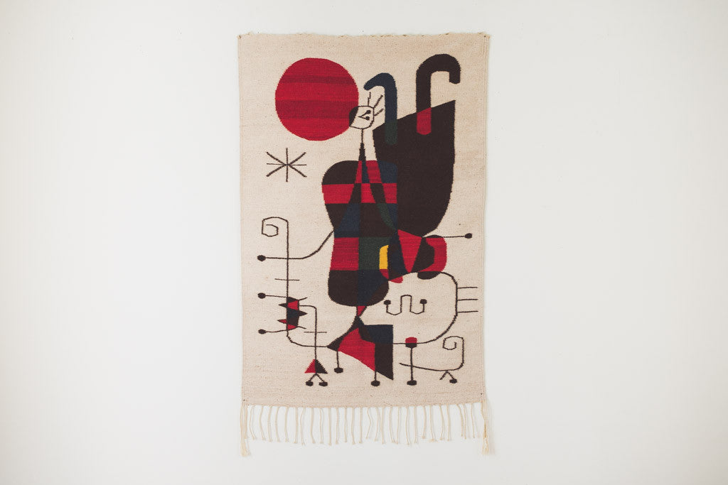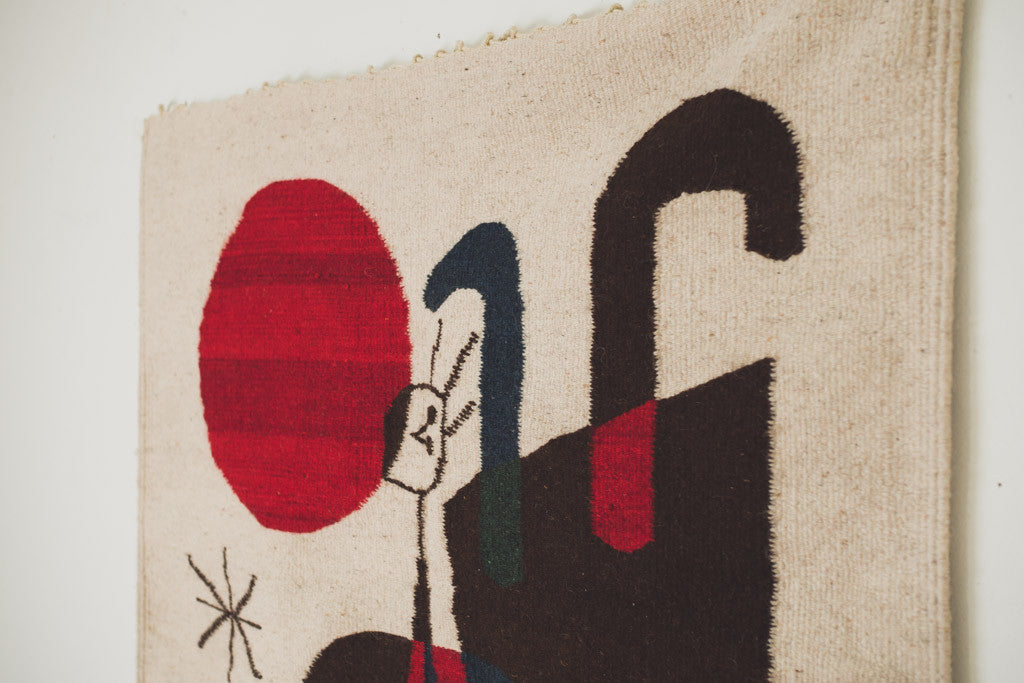 This Mid Century handwoven wool rug is of the Joan Miro painting, "Figures and Dog in Front of the Sun" from 1949. It has an abstract design with an off-white base, red, green, blue, brown and yellow accents. It's in great shape with age related wear. It could also be used as a rug. See pictures for detailed condition.