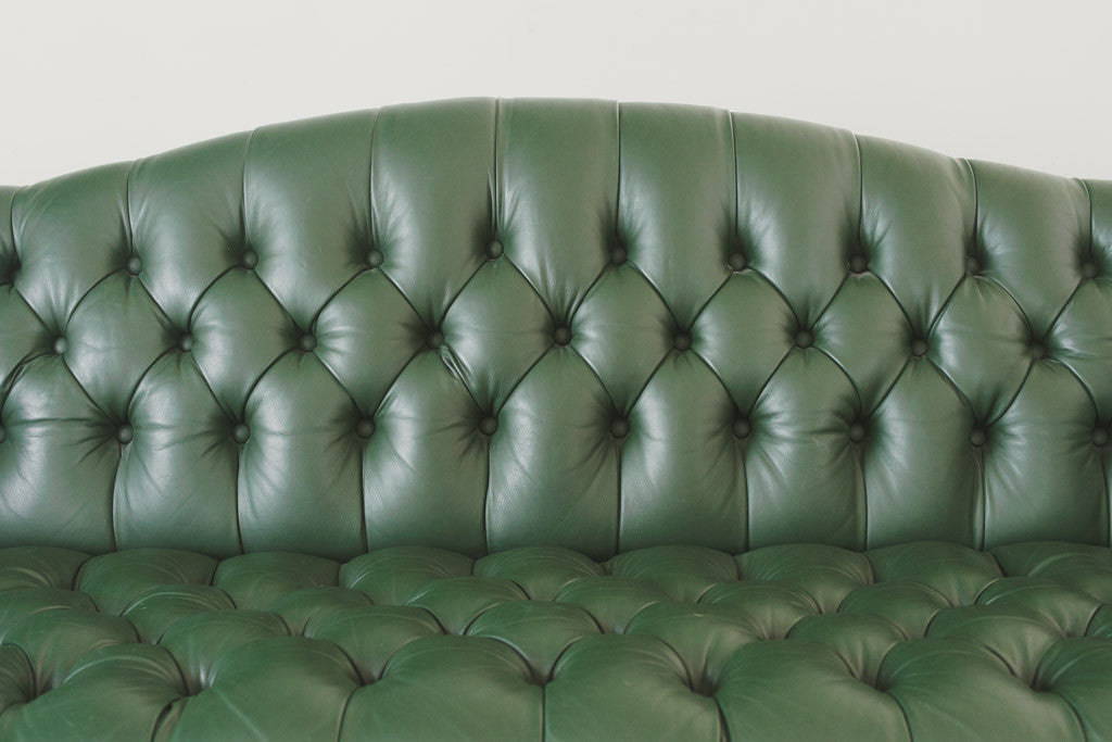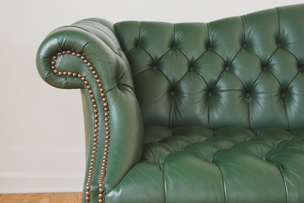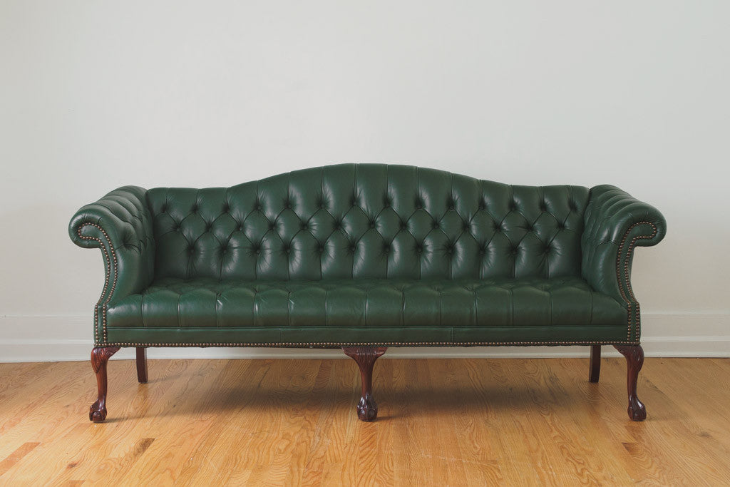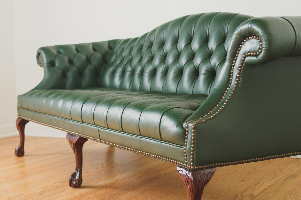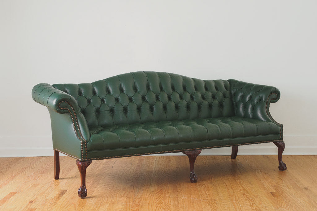 This green leather camelback chesterfield was manufactured by Classic Leather in Hickory, North Carolina. It has an attached tufted seat, brass nailhead trim and wood clawfoot cabriole legs. It's comfortable, long enough to nap on and in excellent shape with a small chip on the middle foot as the only issue to note. Please see pictures for detailed condition.