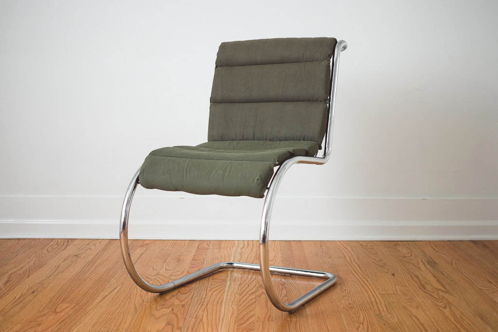 This Mid Century chrome cantilevered chair is upholstered in vintage military canvas. It's in great shape with age related wear. See pictures for detailed condition.