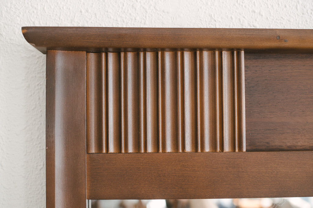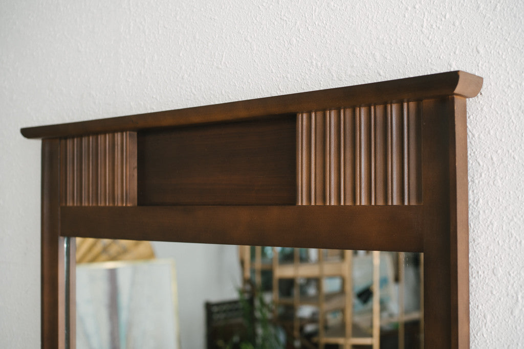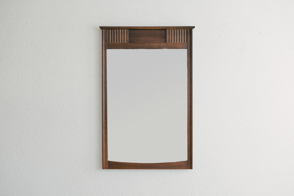 style: Mid Century, walnut trim, mirror, wall mountmaterial: carved wood, glassbrand: Wardage: vintage condition: good, age related wear - see pictures