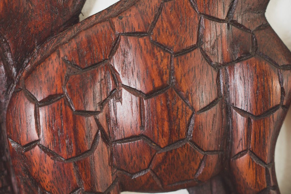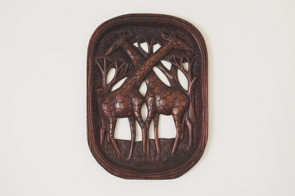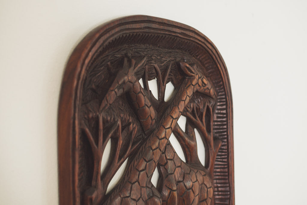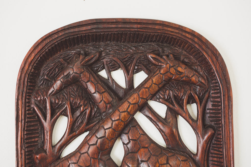 This vintage wall hanging is solid wood with carved giraffes and trees. It's in good shape with age related wear. See pictures for detailed condition.