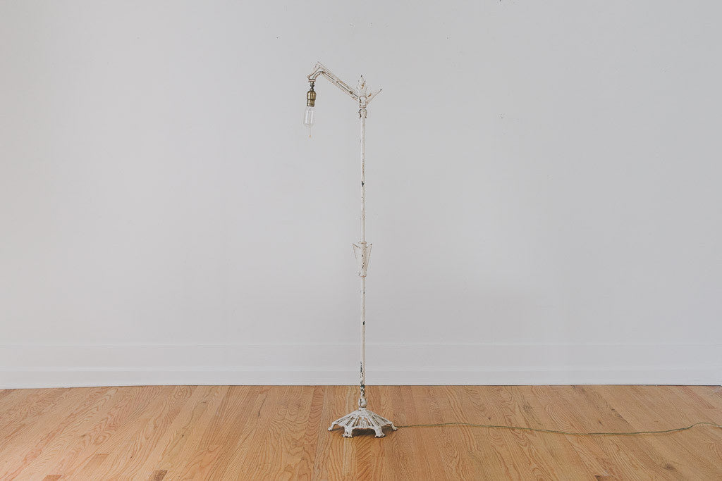 This cast iron Art Deco floor lamp has distressed white paint. It was recently rewired, has a pull chain and comes with an Edison bulb. It’s in great shape with age related wear. Please see pictures for detailed condition.