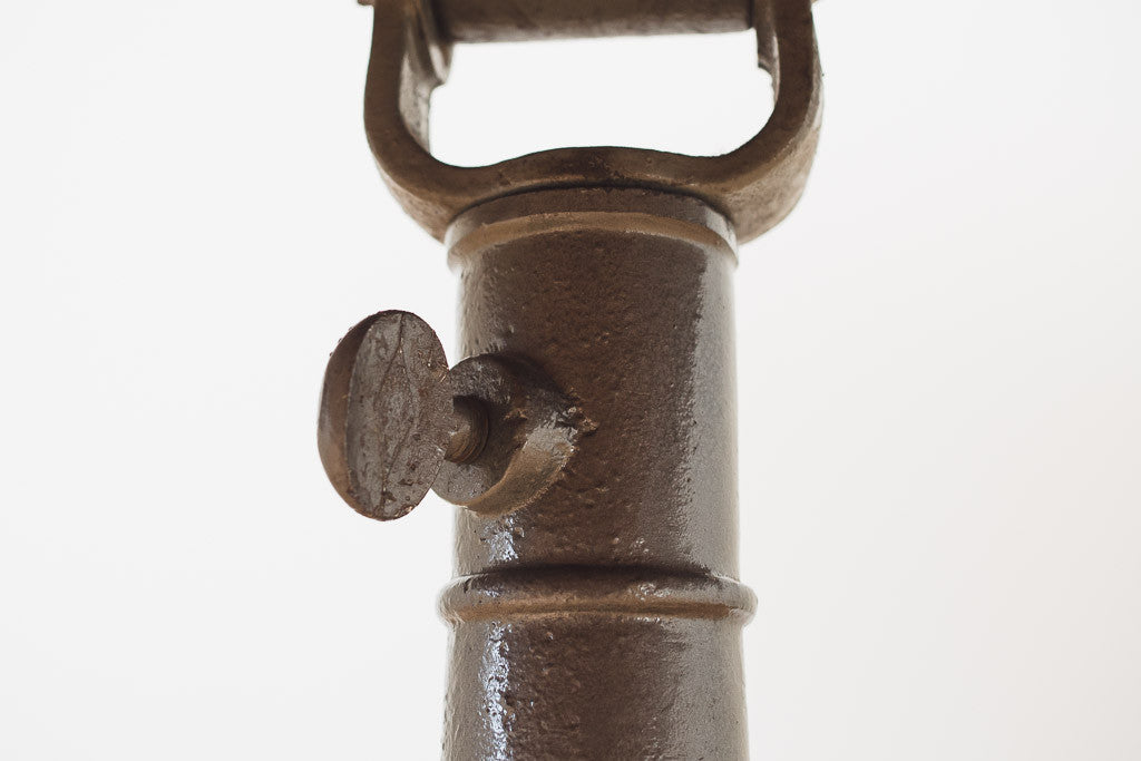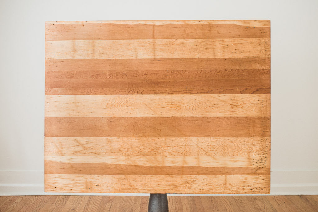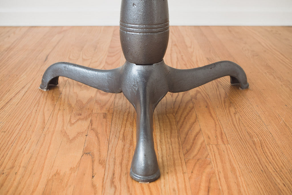This vintage drafting table has an adjustable height cast iron base and wood top. It's in good shape with age related wear. See pictures for detailed condition.
