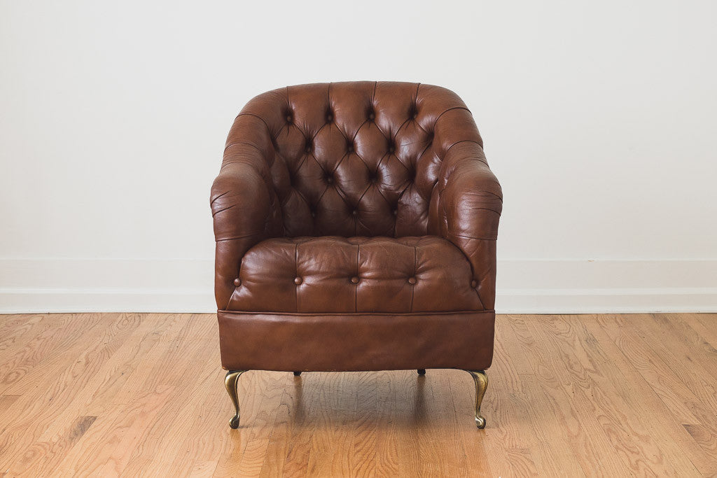This vintage tufted leather barrel chair has brass cabriole legs. It's in good shape with age related wear. See pictures for detailed condition.