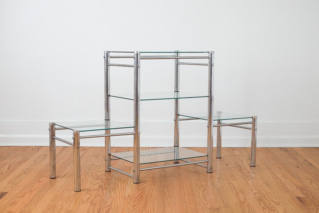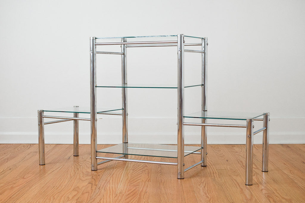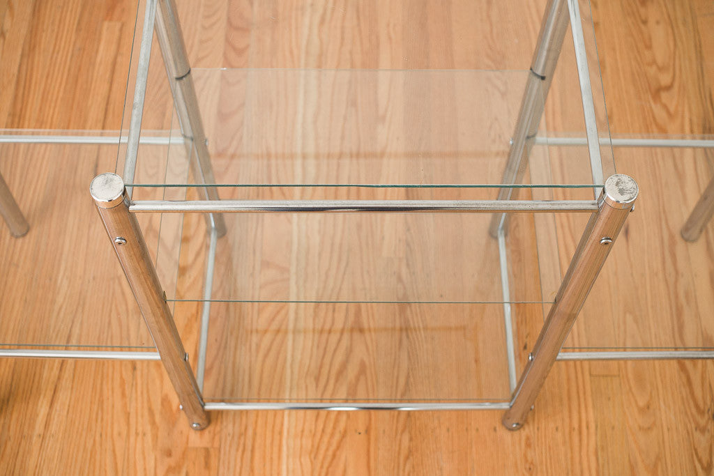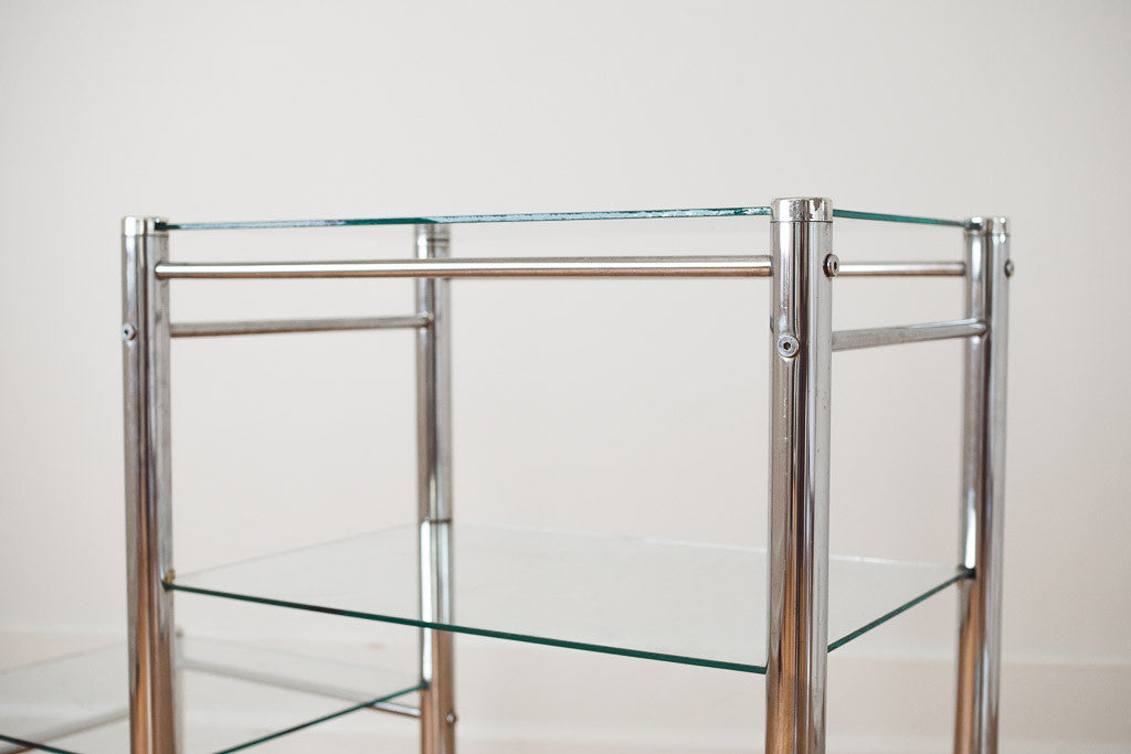 This vintage chrome and glass shelf could be used as a bookcase, credenza, media stand or sofa table. It's in good shape with age related wear. See pictures for detailed condition.