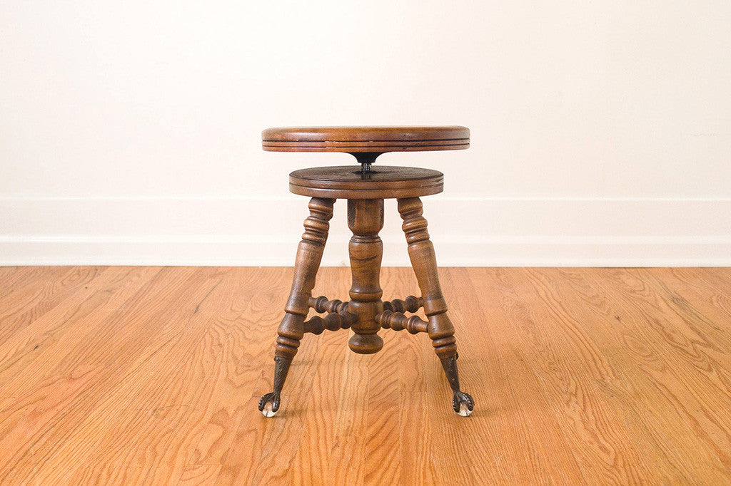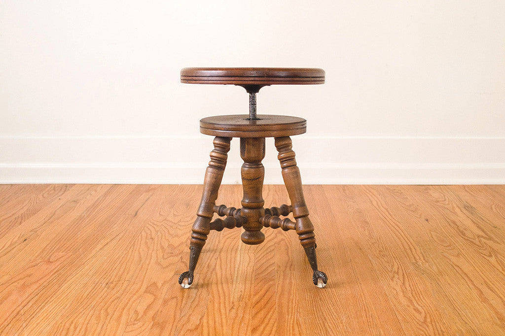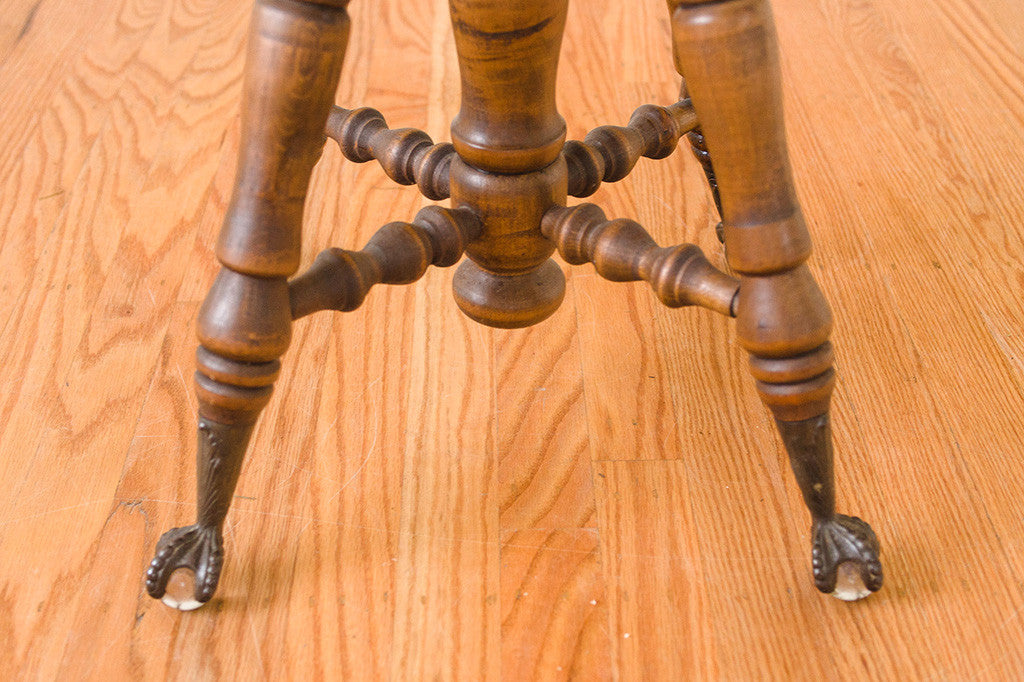 This vintage piano stool has a carved wood claw foot base and adjustable height wood seat. It would be perfect at drafting table or a kitchen island and could also be used as a plant stand or side table. It's in excellent shape with age appropriate wear. Please see pictures for detailed condition of this piece.