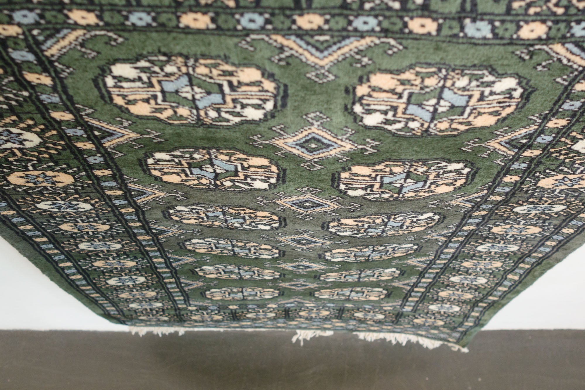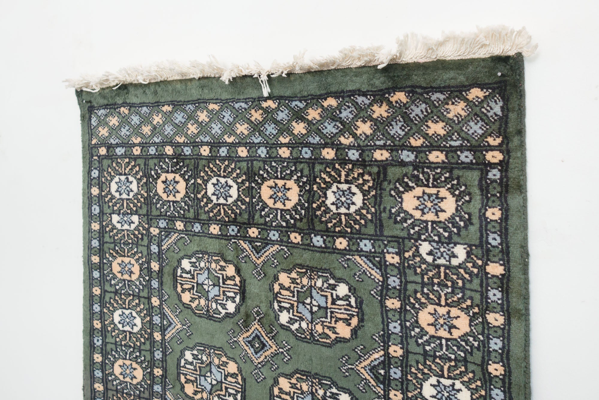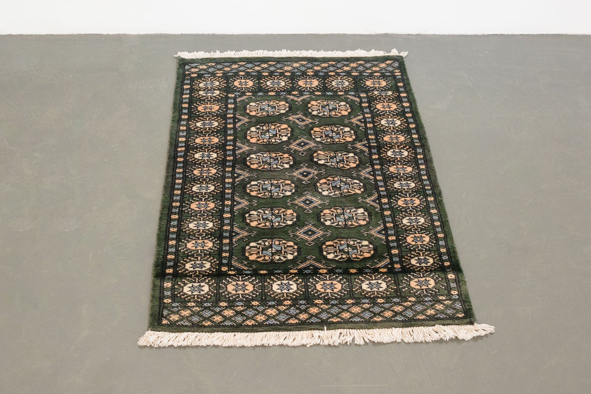 name: Zimriorigin: Pakistan, Peshawar Bokhara style: rug, carpetmaterial: hand woven woolcolors: green, black, cream, gray, yellow age: vintagecondition: good, age related wear - see picturesappraised value: $712
