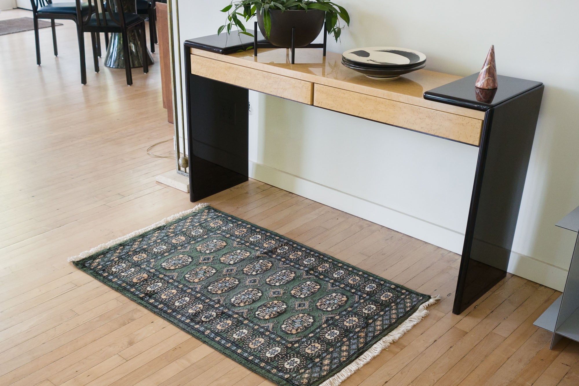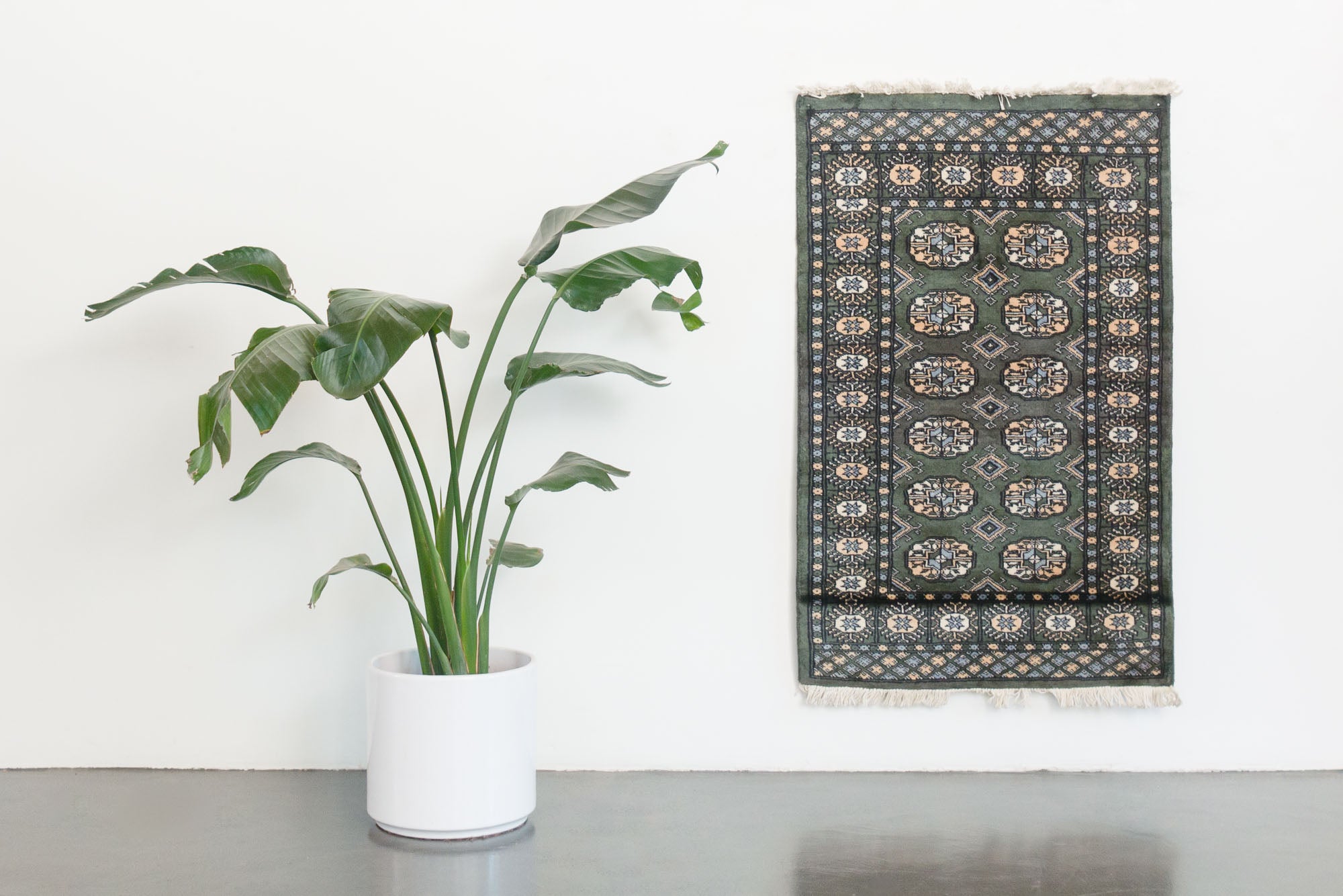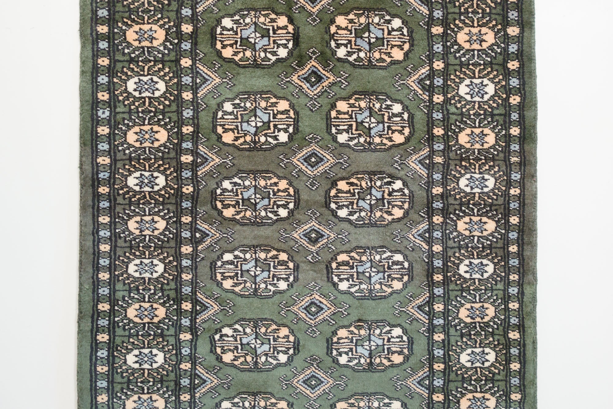 name: Zimriorigin: Pakistan, Peshawar Bokhara style: rug, carpetmaterial: hand woven woolcolors: green, black, cream, gray, yellow age: vintagecondition: good, age related wear - see picturesappraised value: $712