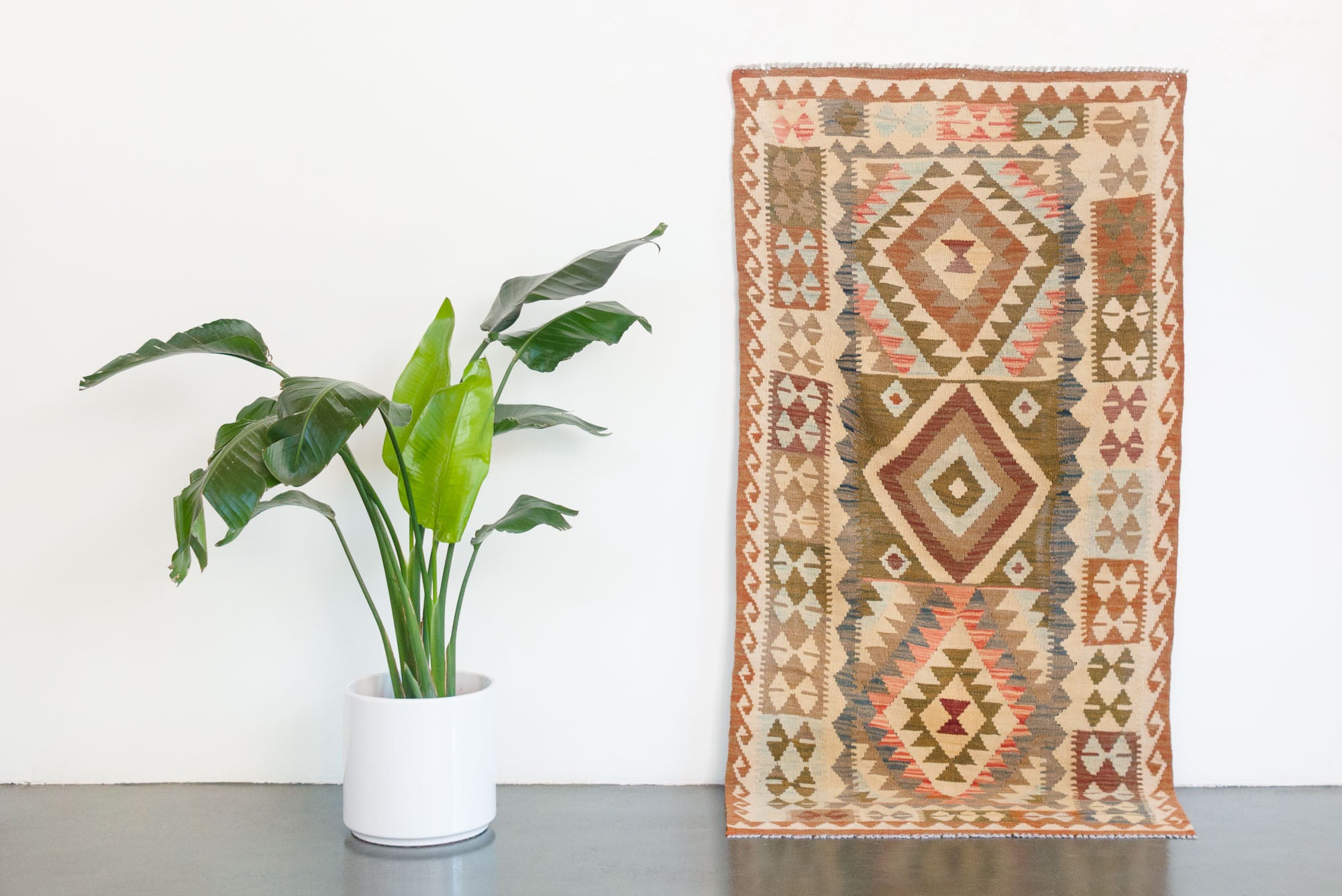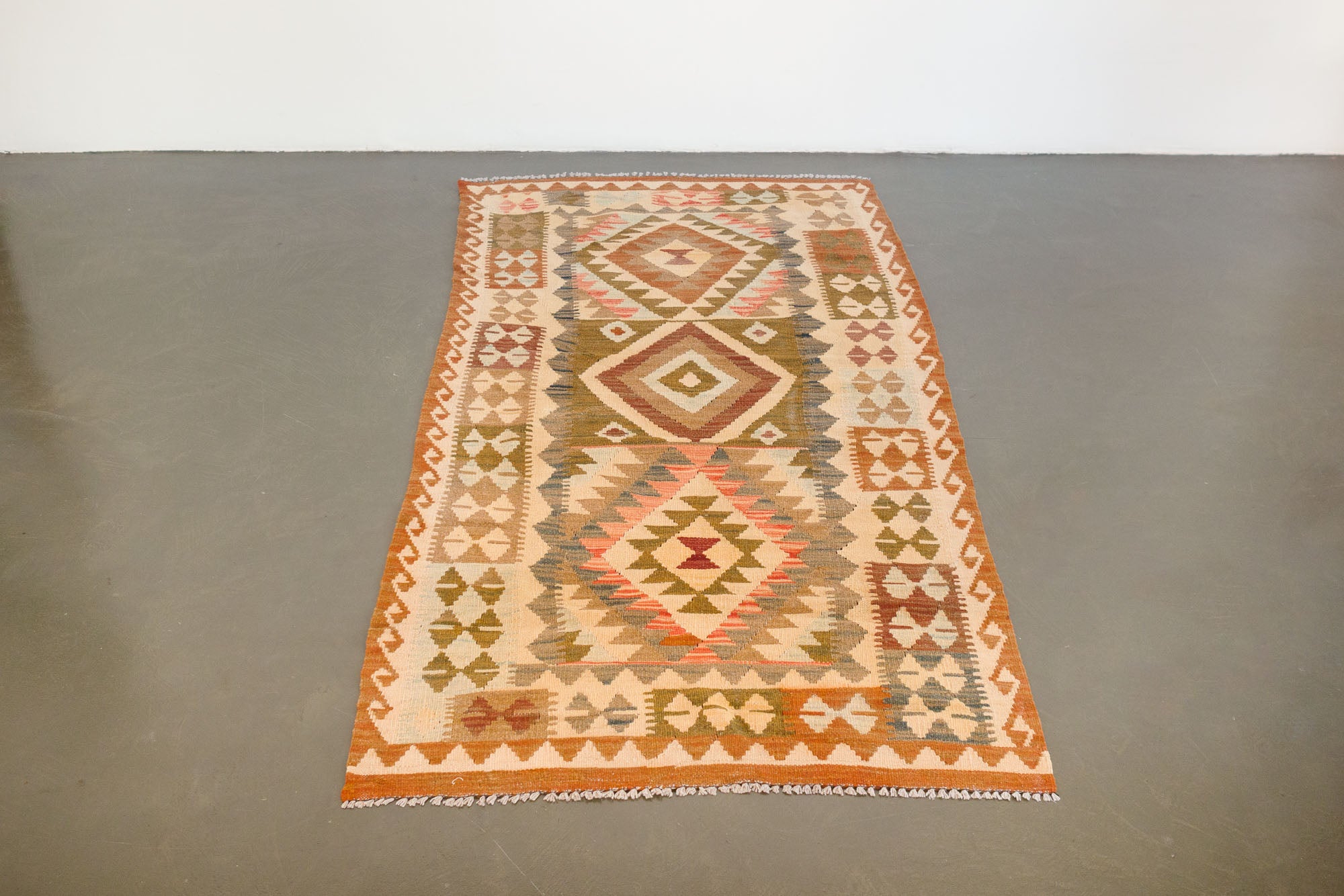 name: Aydinorigin: Turkeystyle: flat weave, kilim, sivas, rug, carpet, flat-weavematerial: hand woven woolcolor: browns, greens, orangeage: vintage (1940 - 1969)condition: good, age related wear - see picturesappraised value: $712