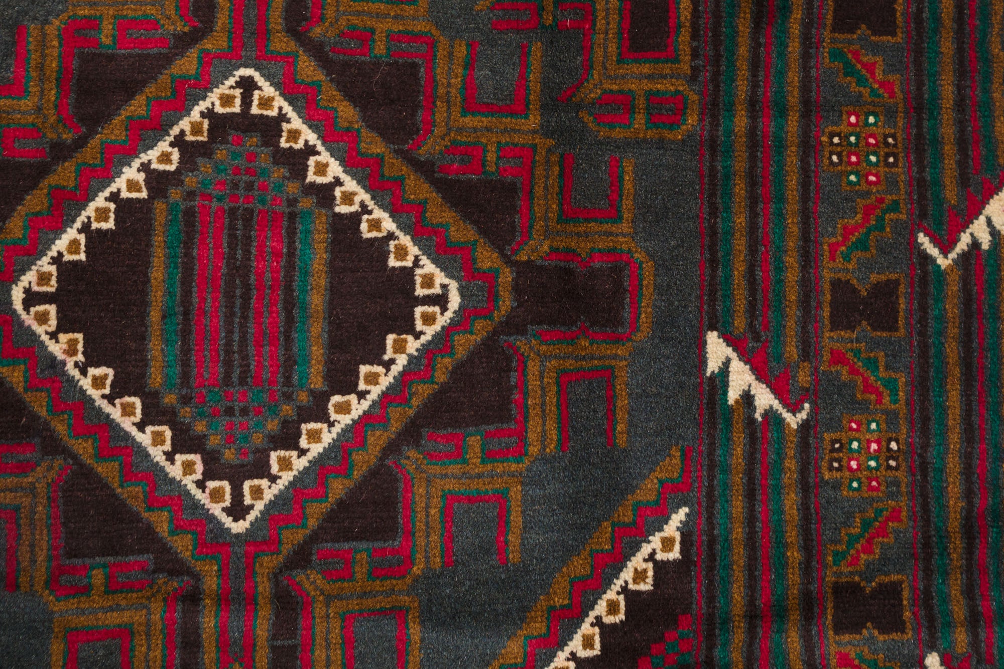 name: Bahramorigin: Afghanistanstyle: Rizbaft, geometric, rug, carpetmaterial: hand knotted woolcolor: reds, blues, browns, green, cream, mustardage: vintage (1940-1969)condition: good, age related wear - see picturesappraised value: $1092