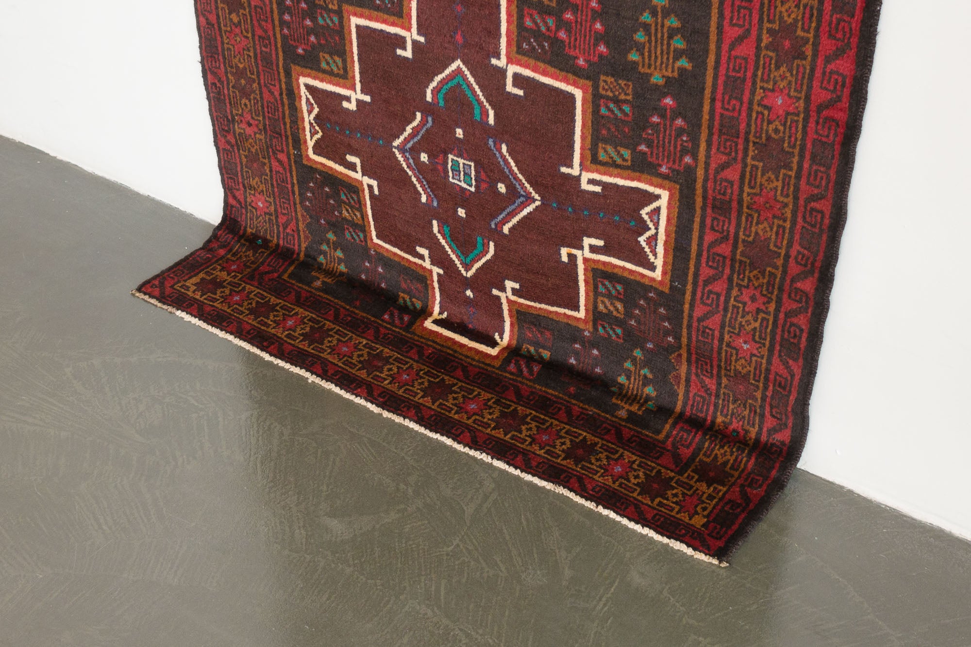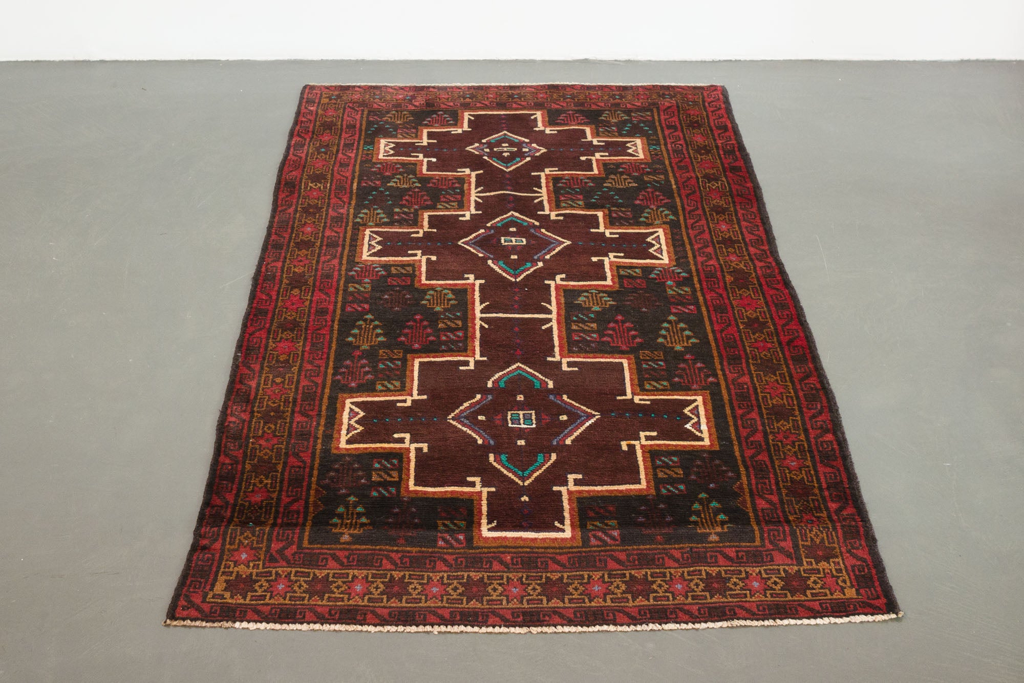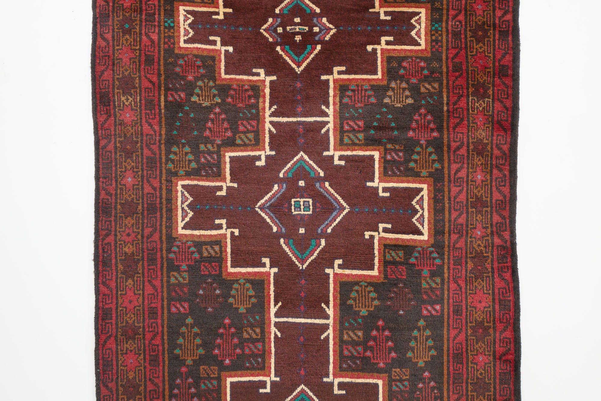 name: Navidorigin: Afghanistanstyle: Teimani, geometric, rug, carpetmaterial: hand knotted woolcolor: red, browns, burgundy, cream, blue, tealage: vintage (1940-1969)condition: good, age related wear - see picturesappraised value: $1,016