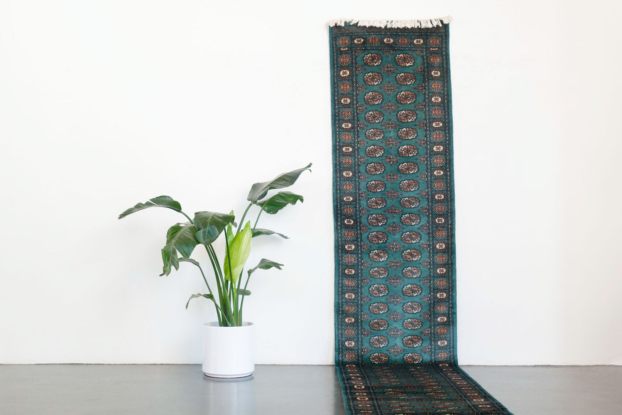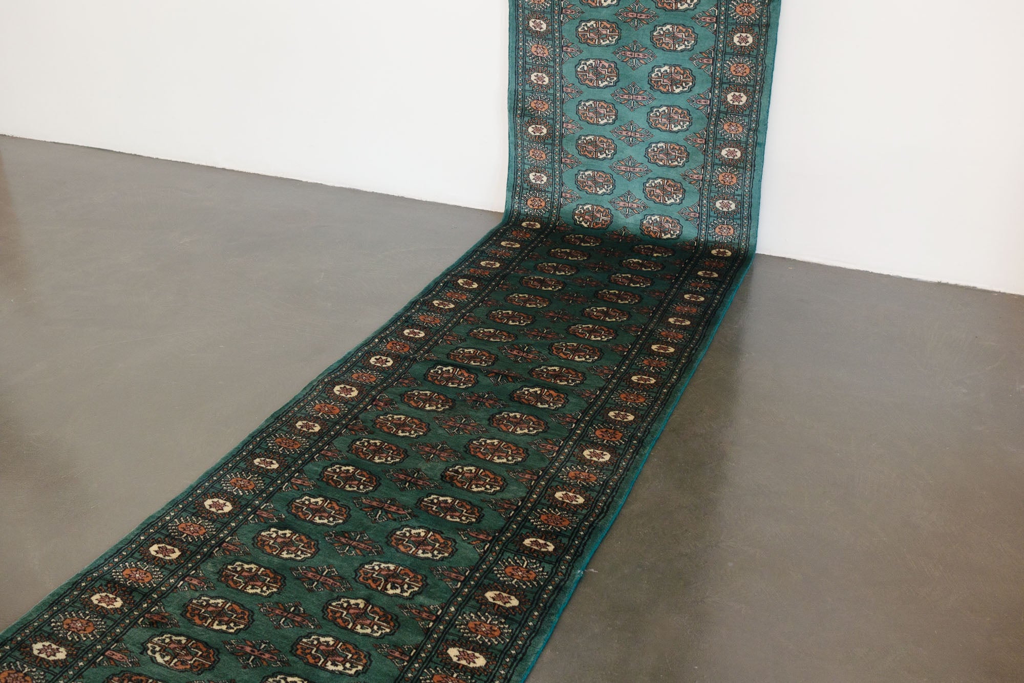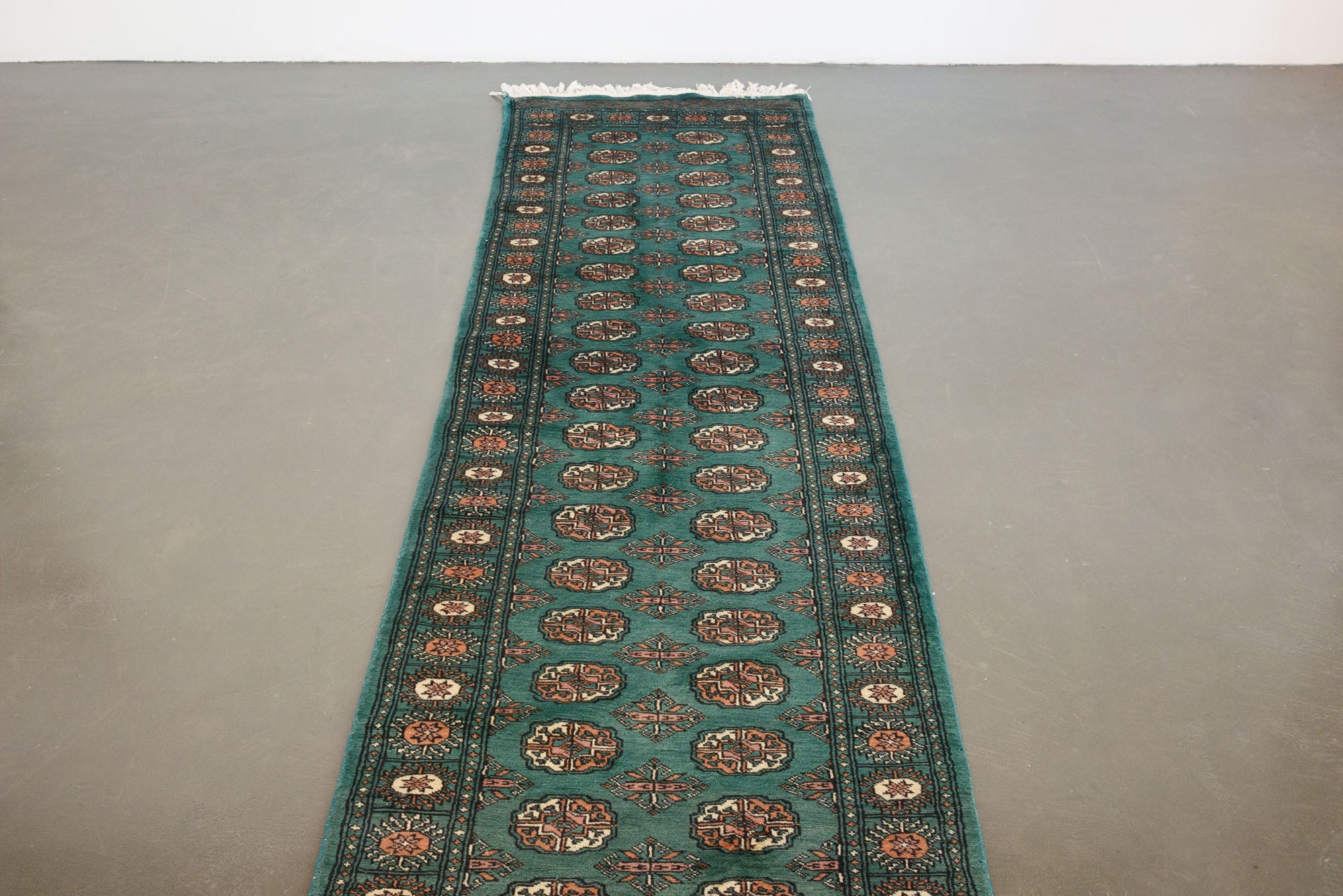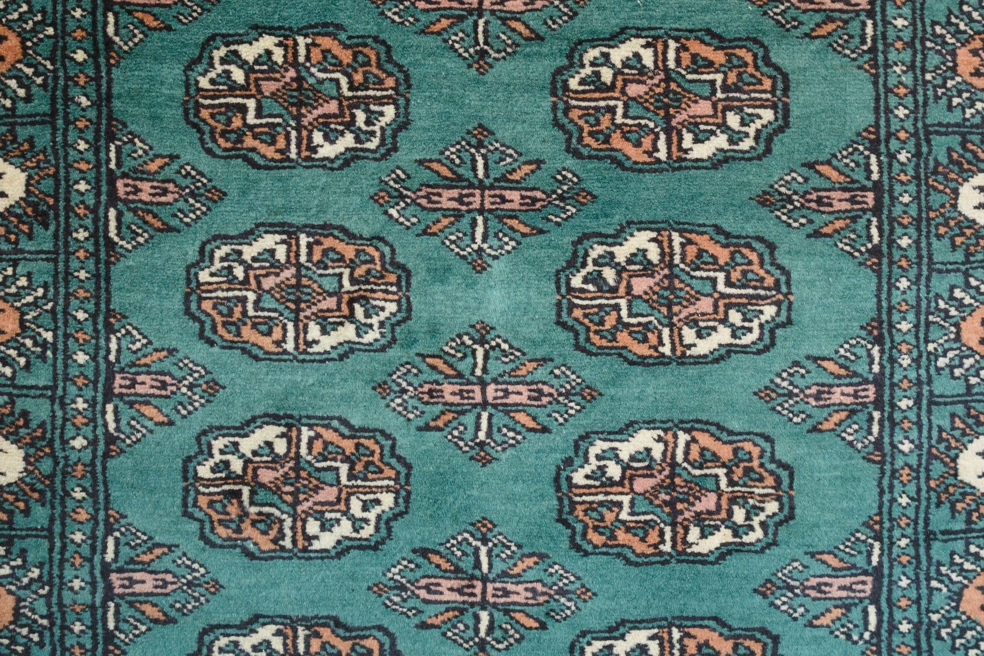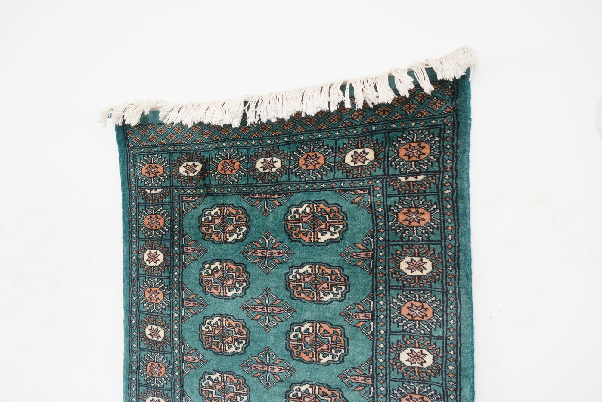 name: Ayalporigin: Pakistanstyle: Peshwar Bokhara, rug, carpetmaterial: hand woven wool color: green, orange, pink, cream, blackage: vintage (1940-1969)condition: good, age related wear - see picturesappraised value: $1,816
