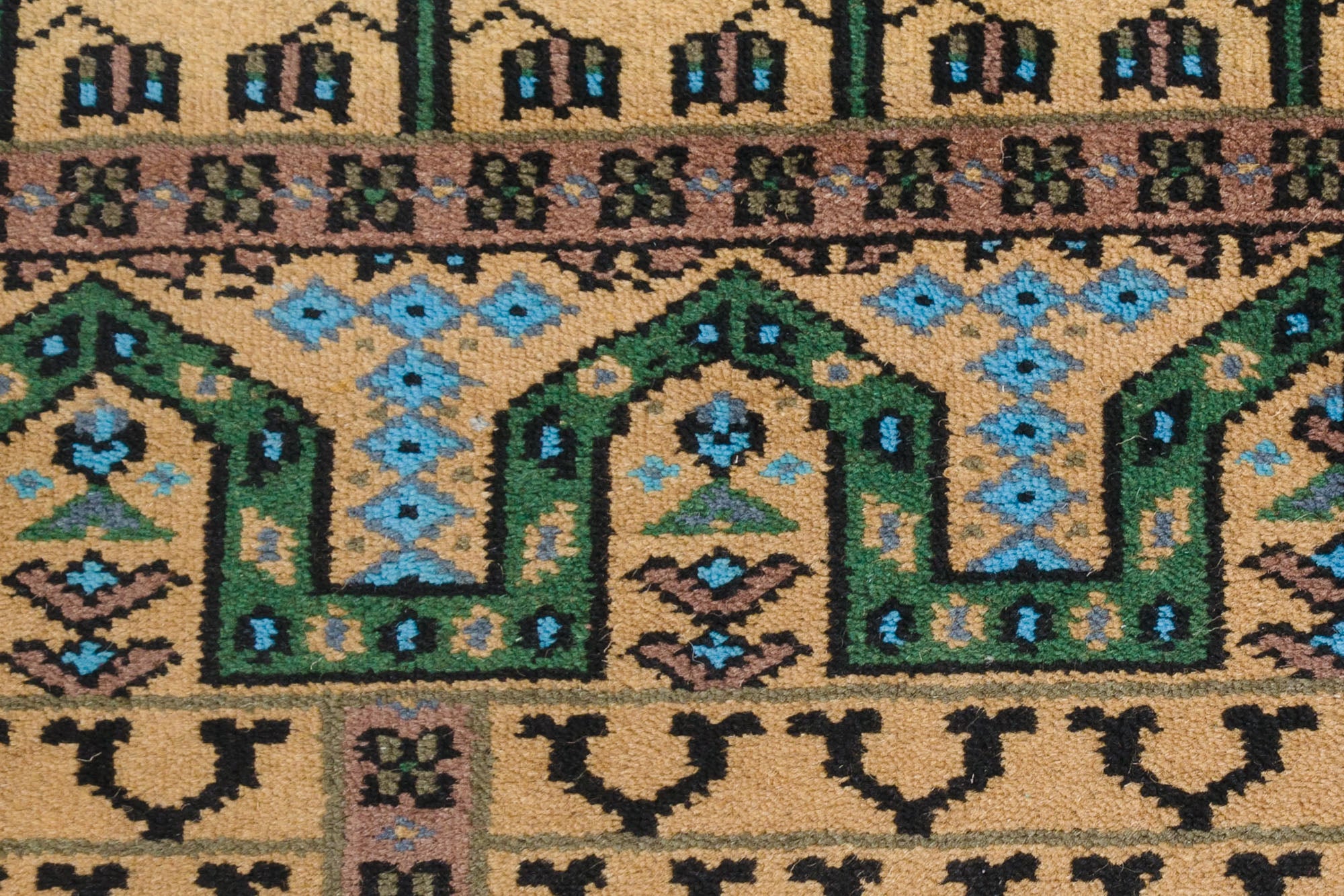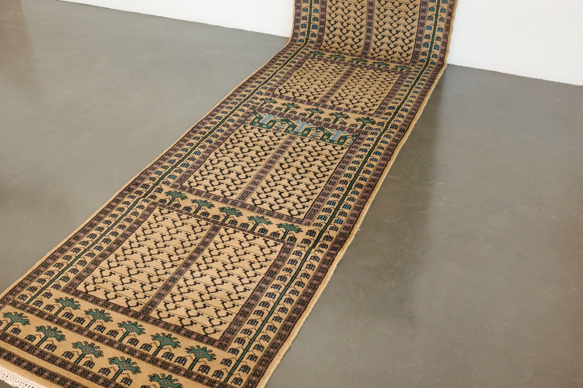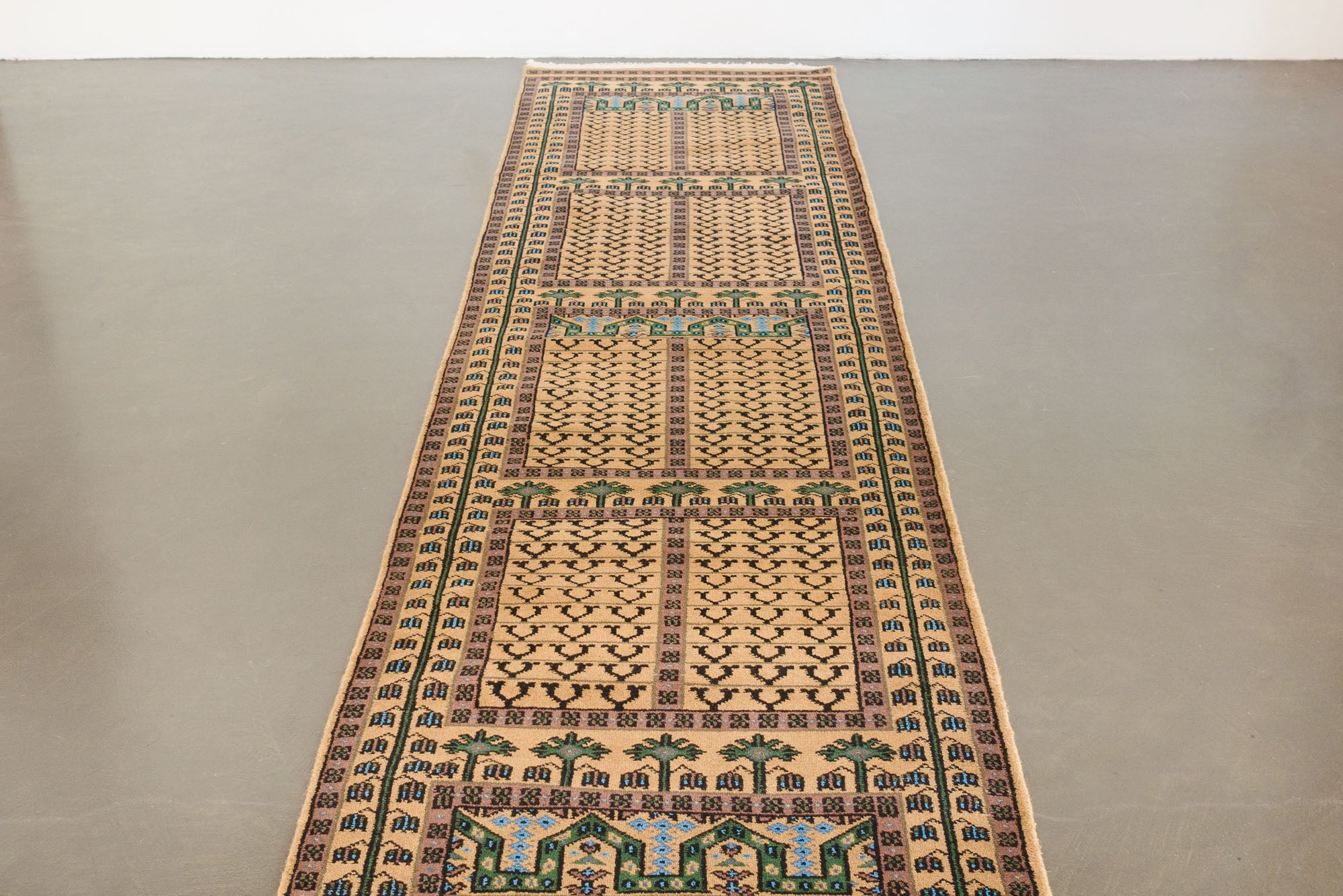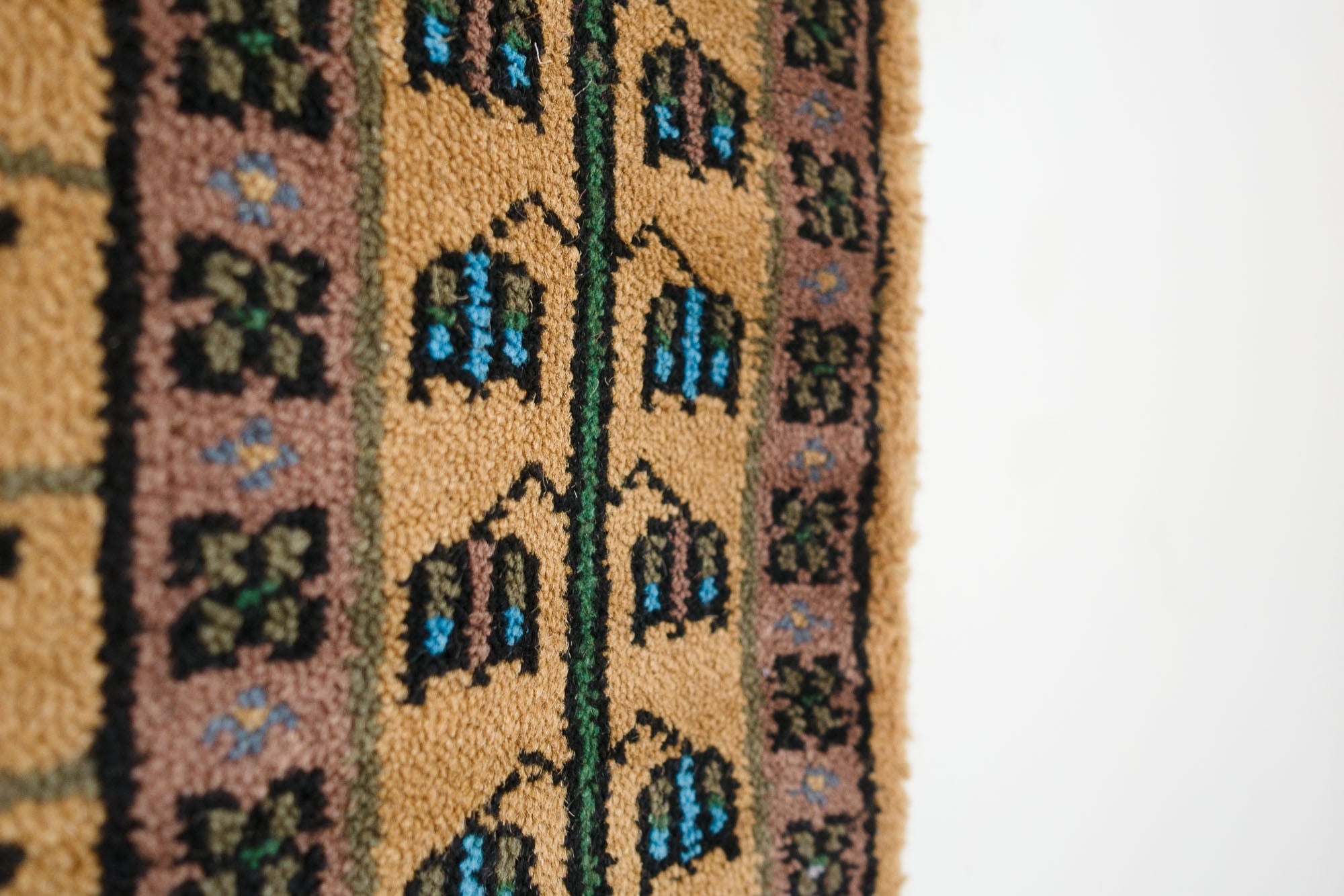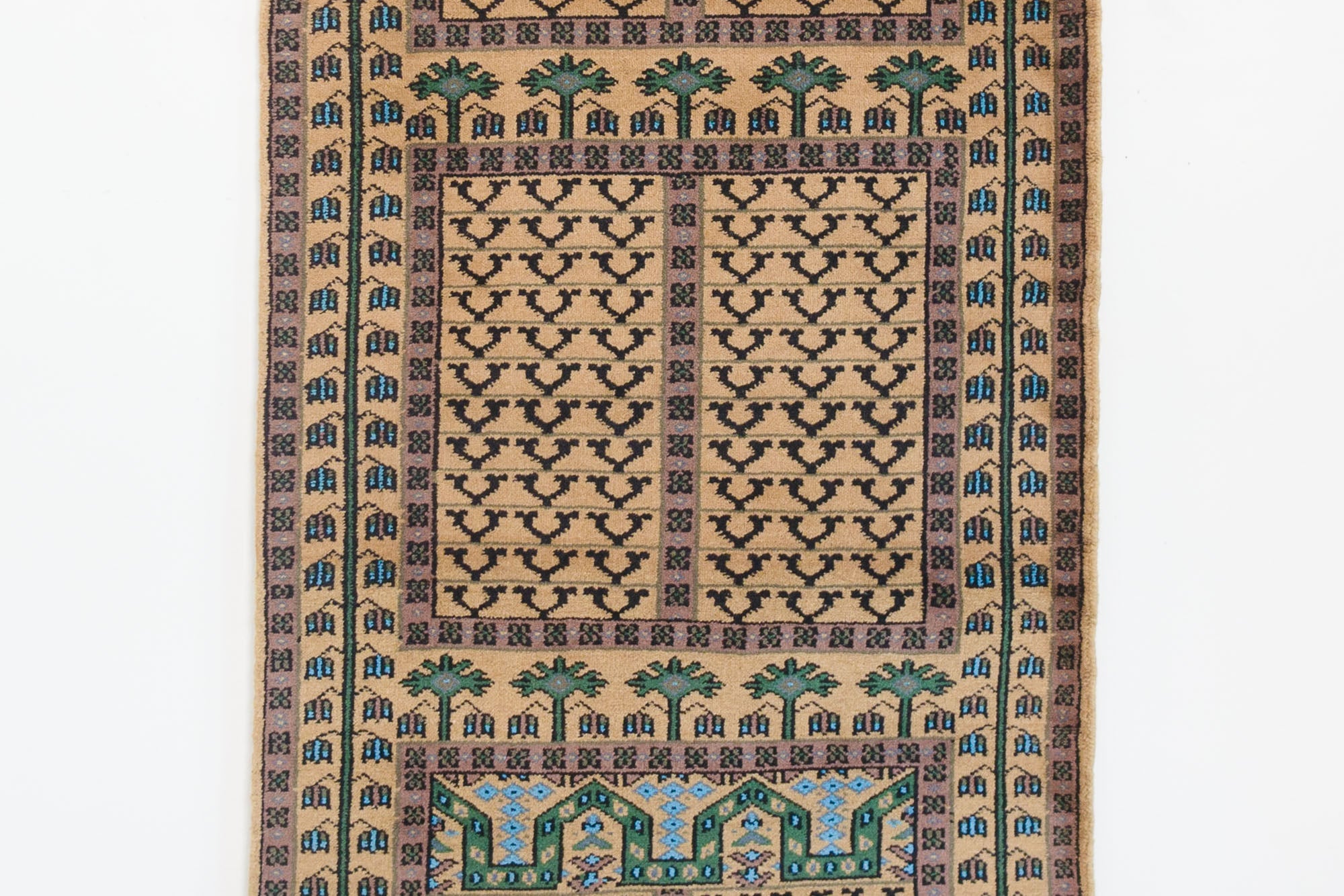 name: Erturkorigin: Pakistanstyle: peshwar bokhara, rug, carpetmaterial: hand woven wool color: tan, mauve, green, blue, blackage: vintage (1940-1969)condition: good, age related wear - see picturesappraised value: $1,368