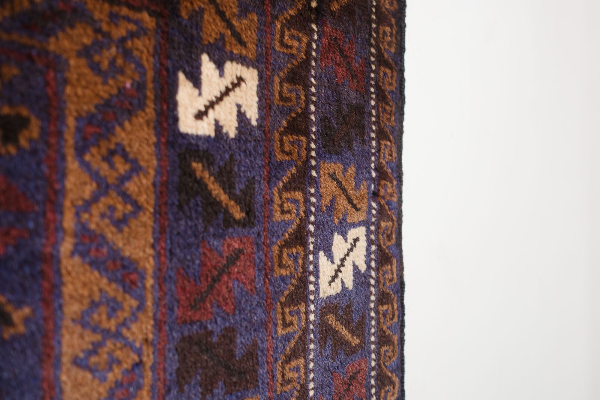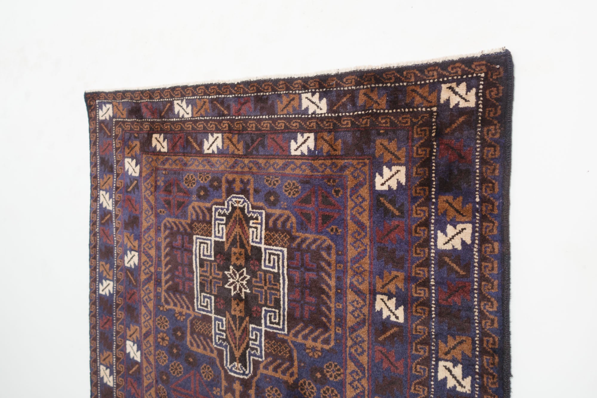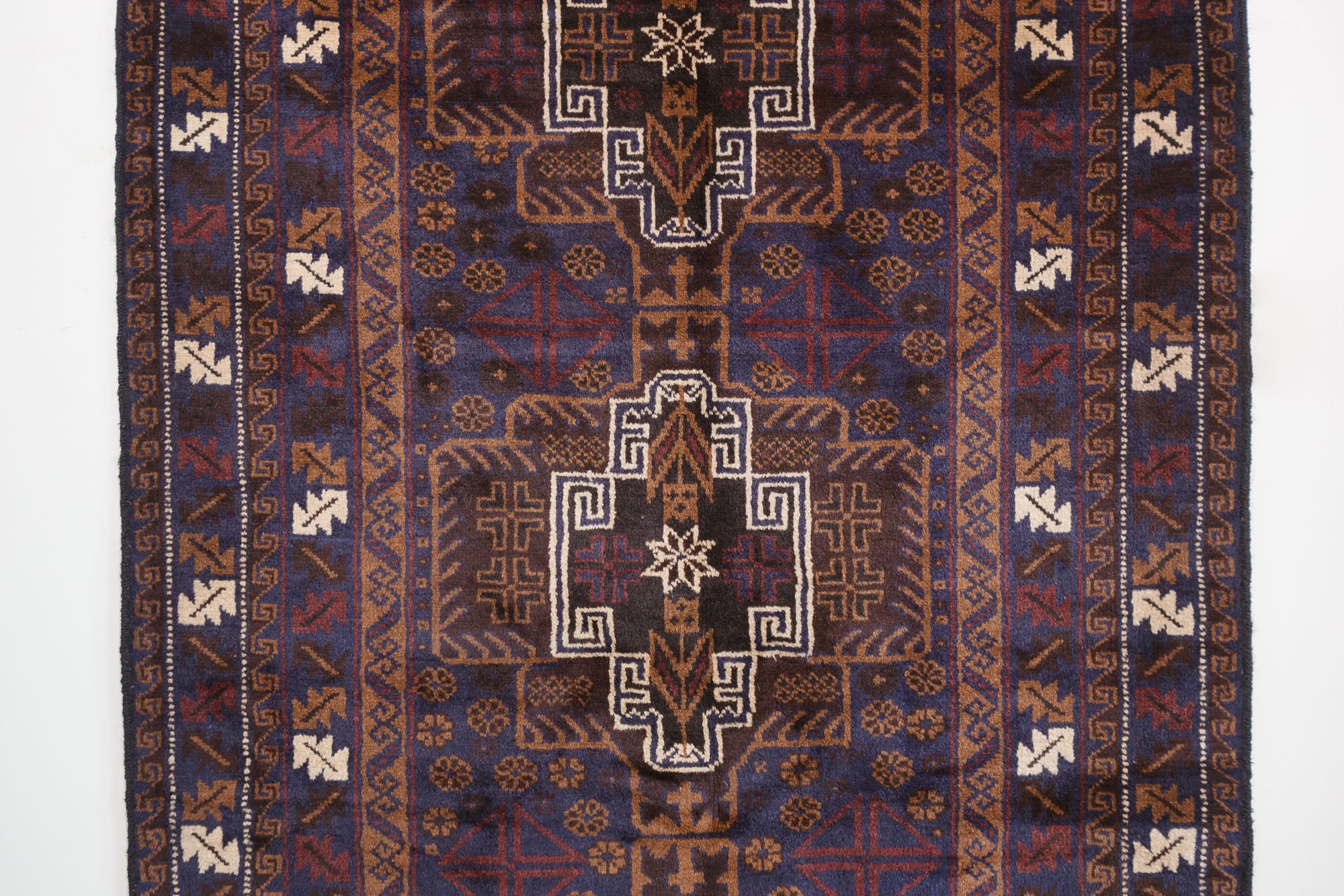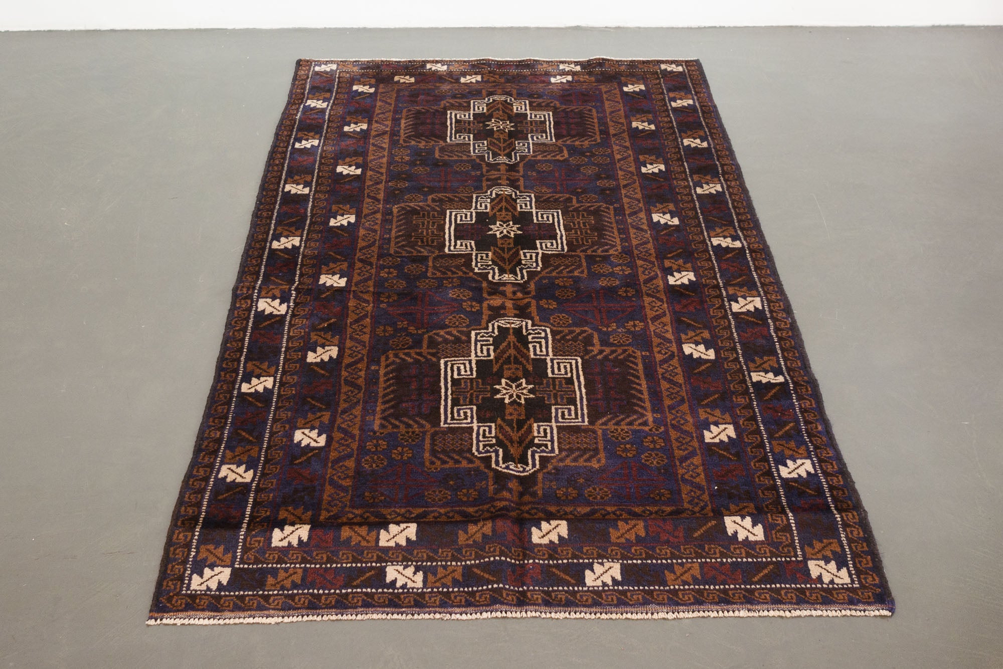 name: Farzeenorigin: Afghanistanstyle: Teimani, geometric, rug, carpetmaterial: hand knotted woolcolor: blues, black, browns, cream, dark redage: vintage (1940-1969)condition: good, age related wear - see picturesappraised value: $952