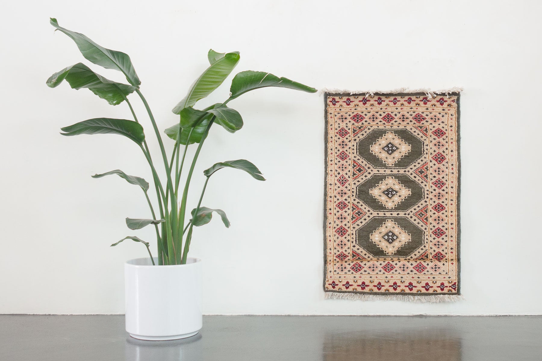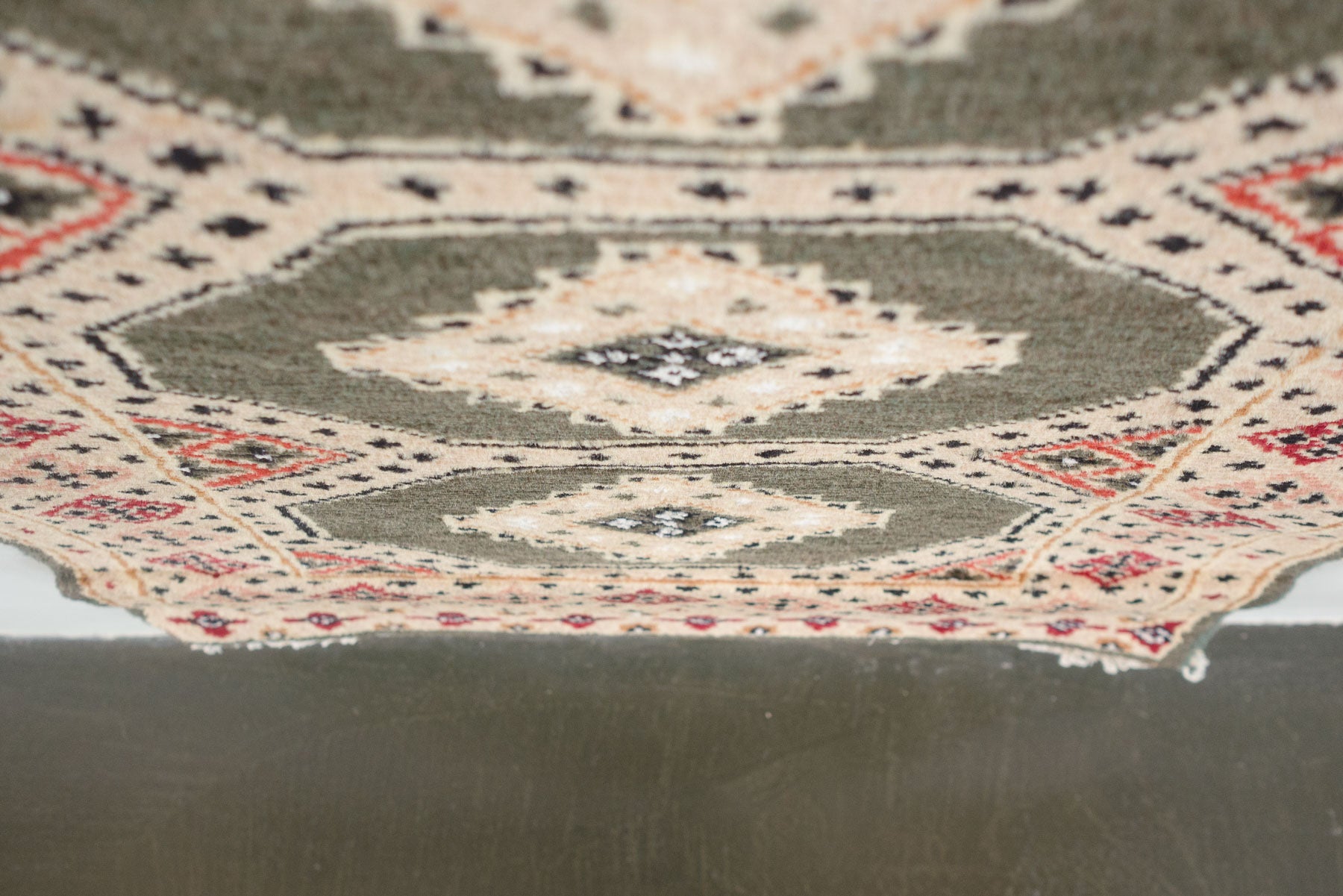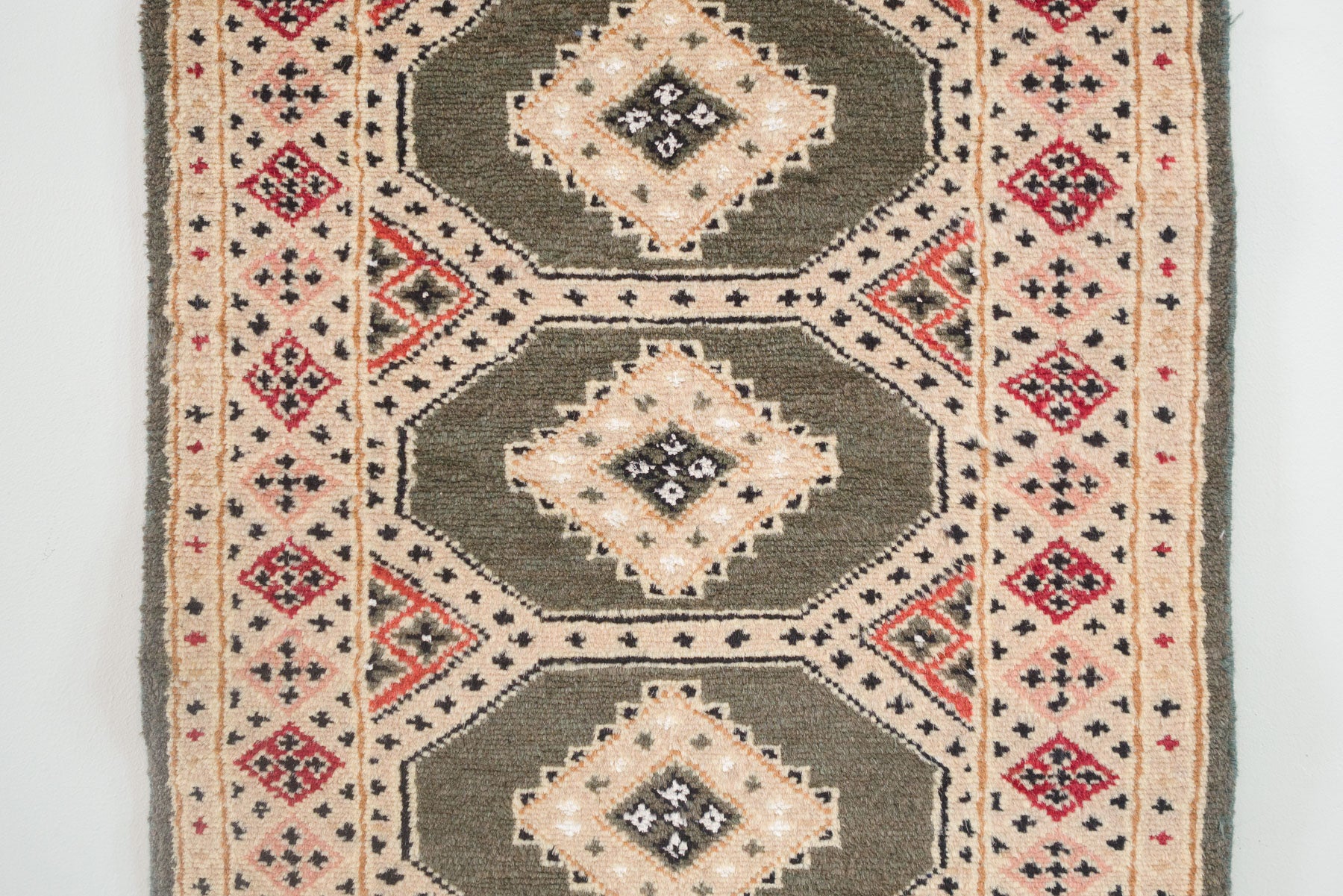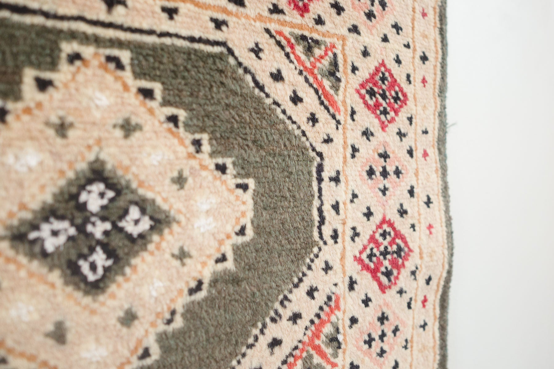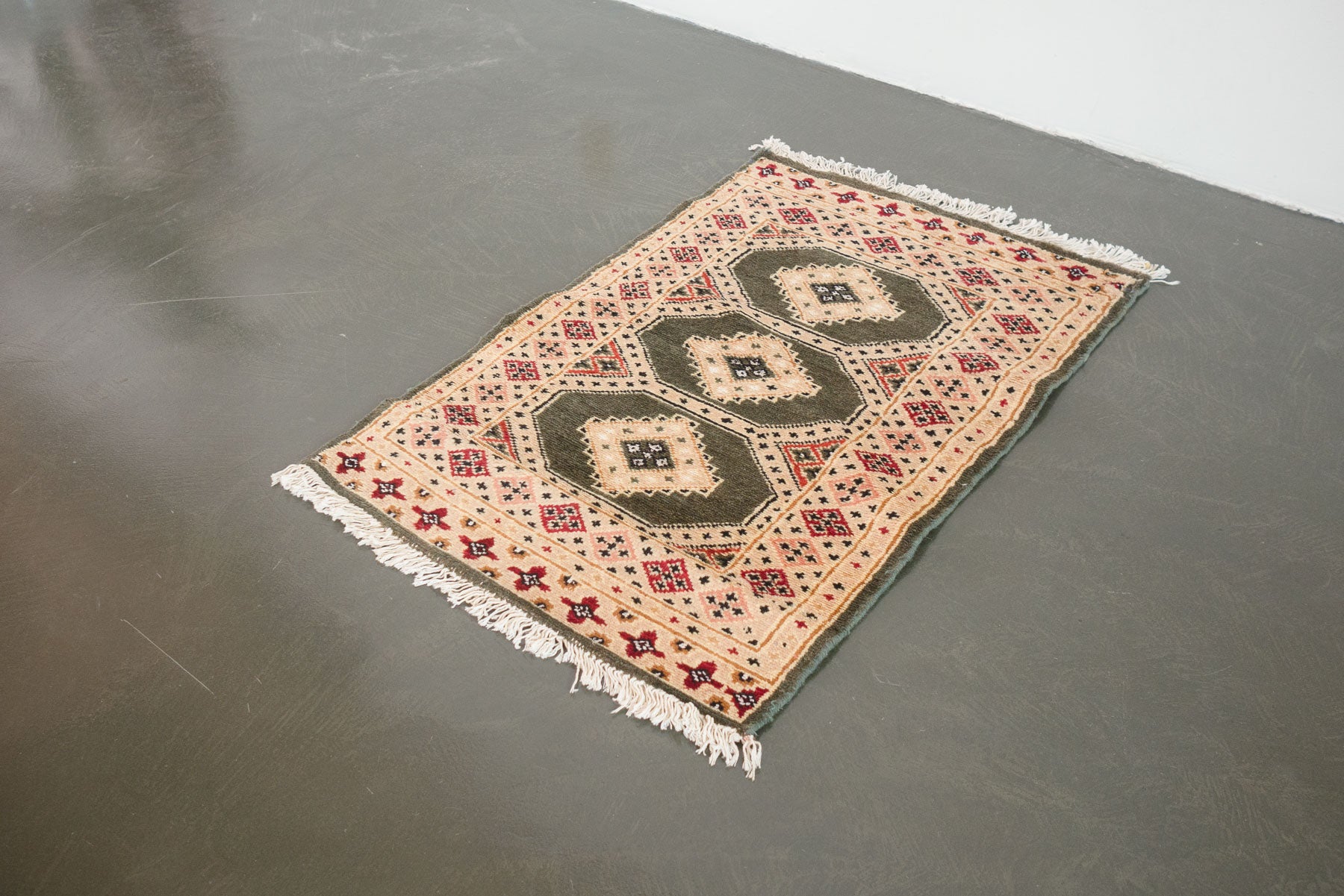 name: Jarmilorigin: Pakistan, Peshawar Bokharastyle: rug, carpetmaterial: hand knotted woolcolors: green, pink, red, orange, camel, black, creamage: newcondition: good, age related wear - see picturesappraised value: $41226"x 41" (closest standard rug size is 2x3.5)