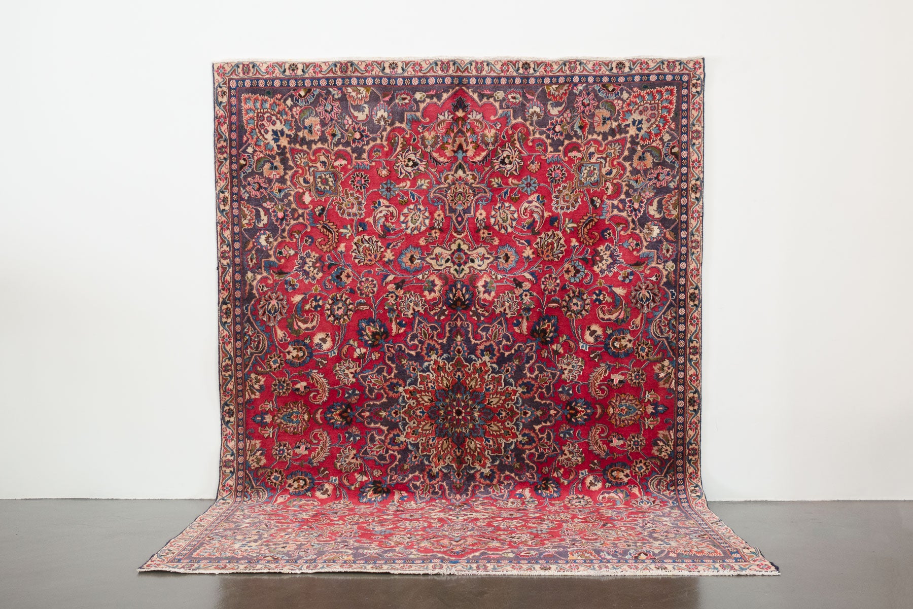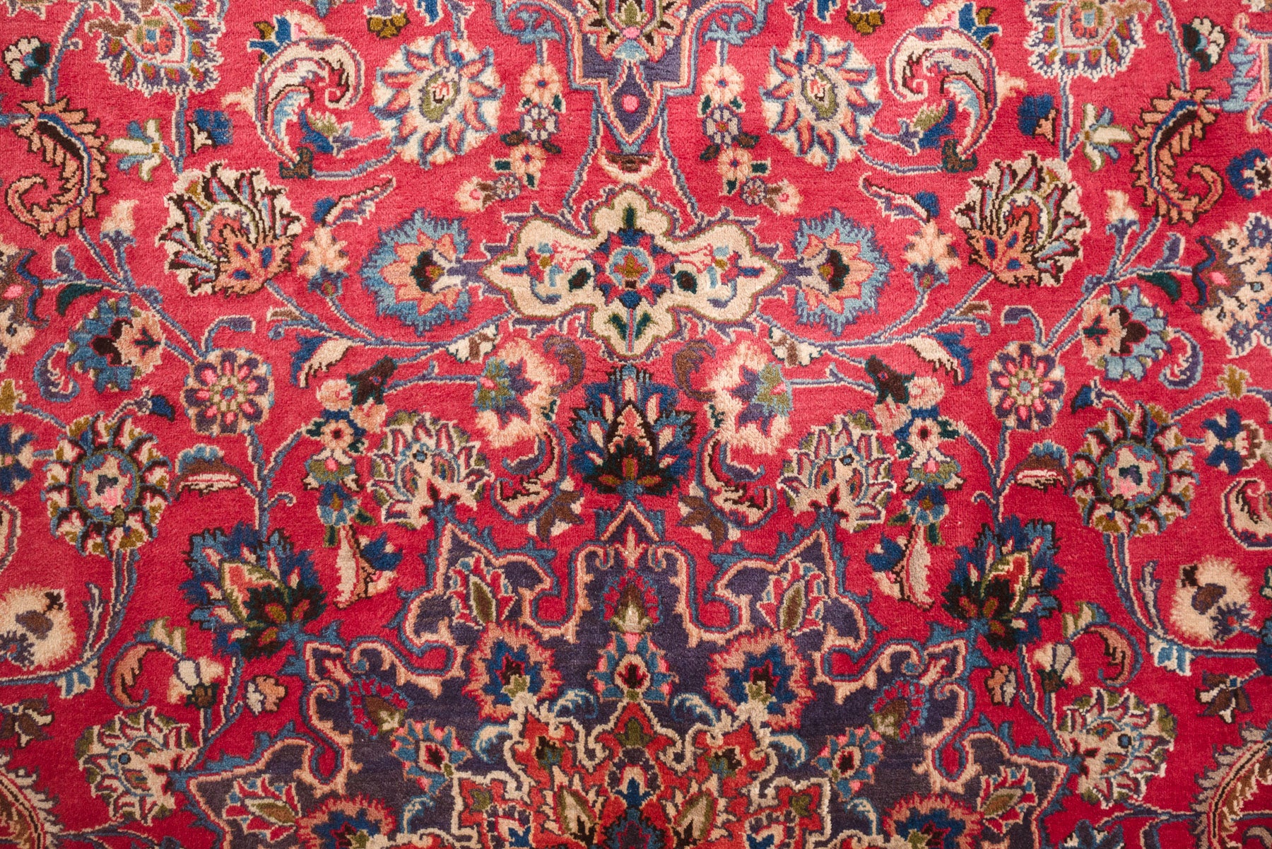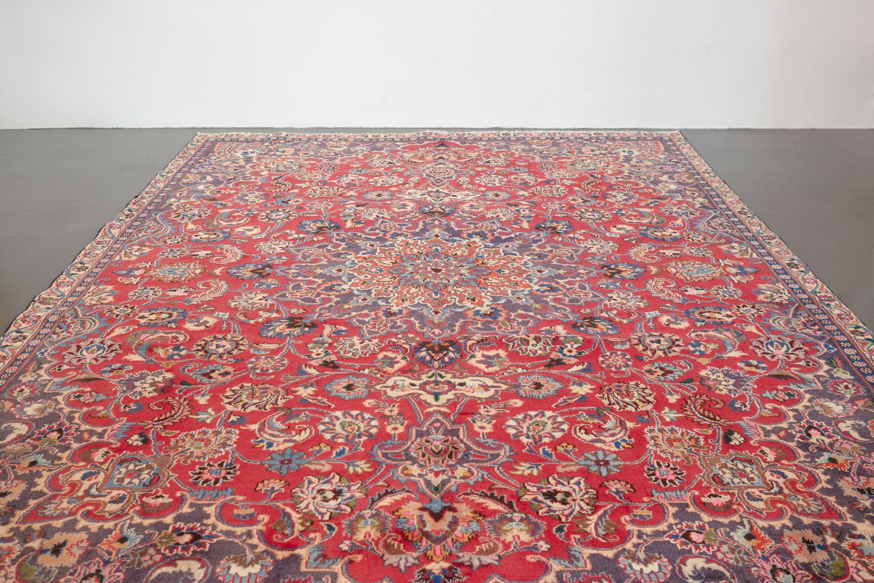name: Sorena origin: Iran (Persian), Mashadstyle: rug, carpetmaterial: hand knotted woolcolors: red, black, brown, pink, blue, orange, green, cream, blackage: vintage, 1940-1970condition: good, age related wear - see pictures
