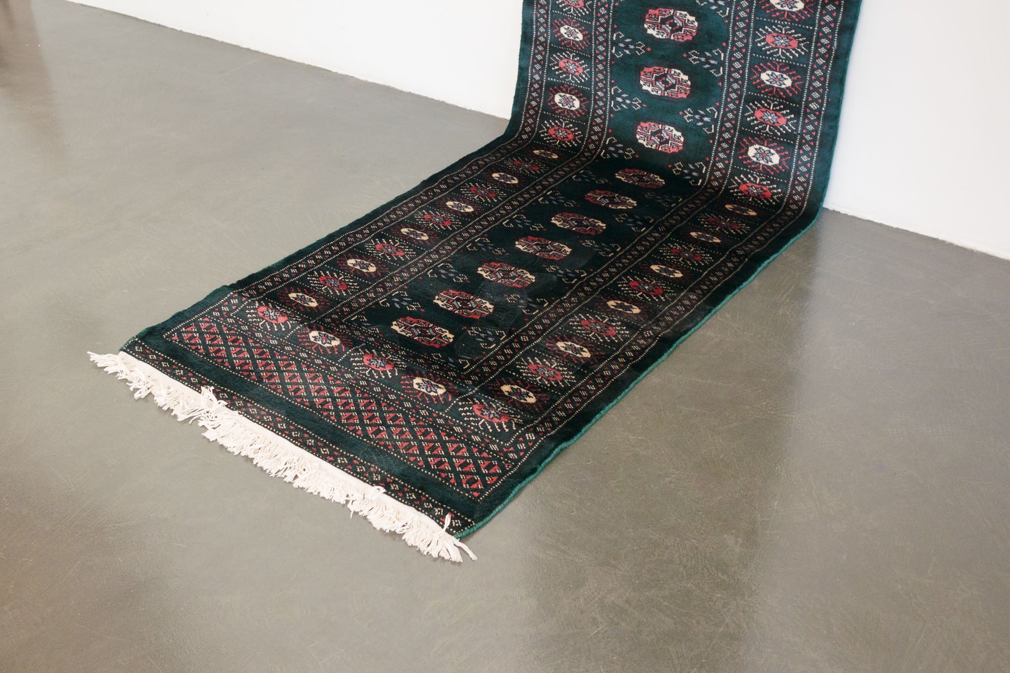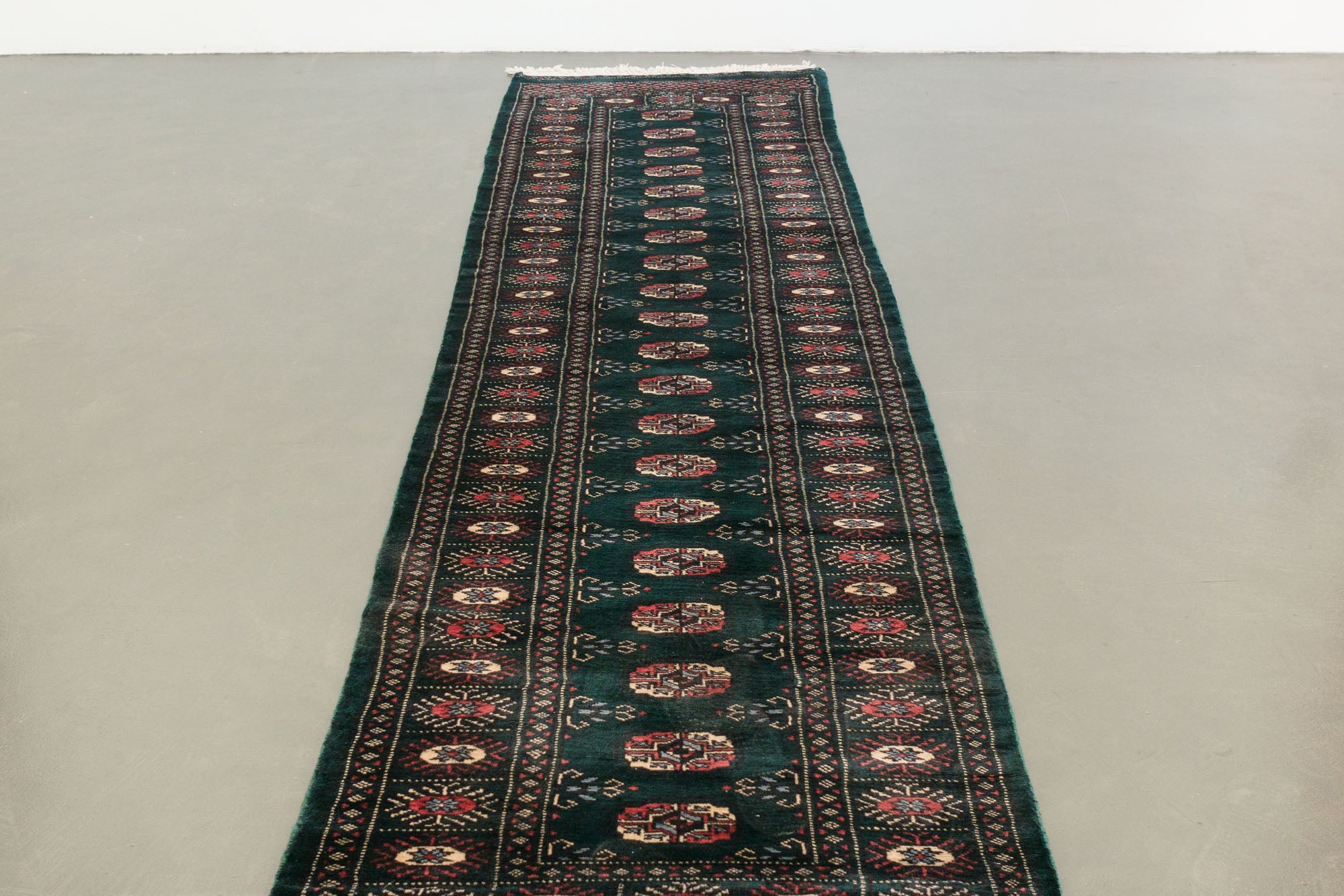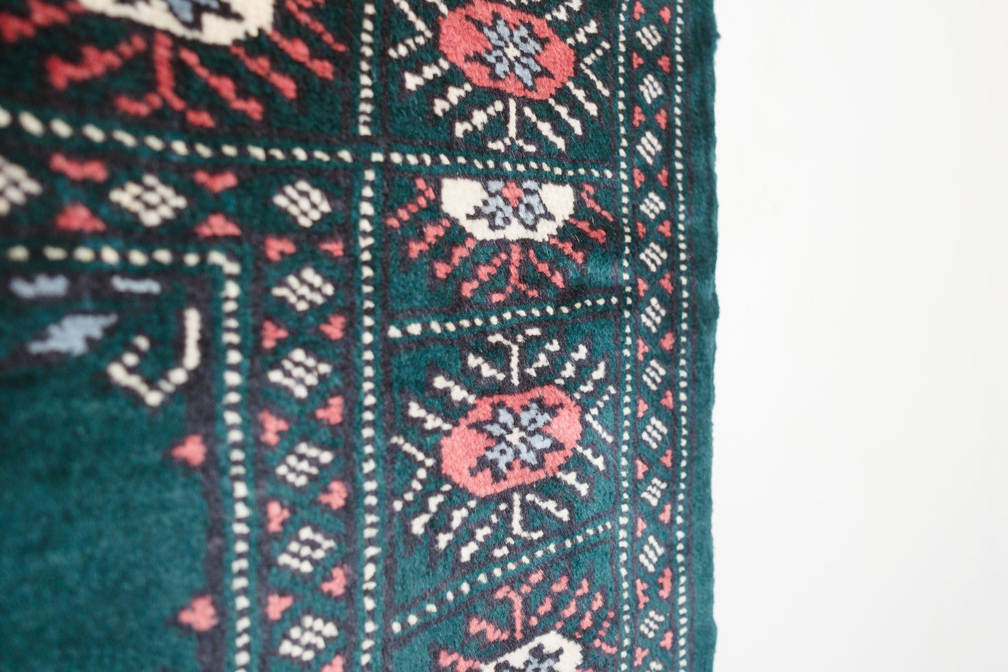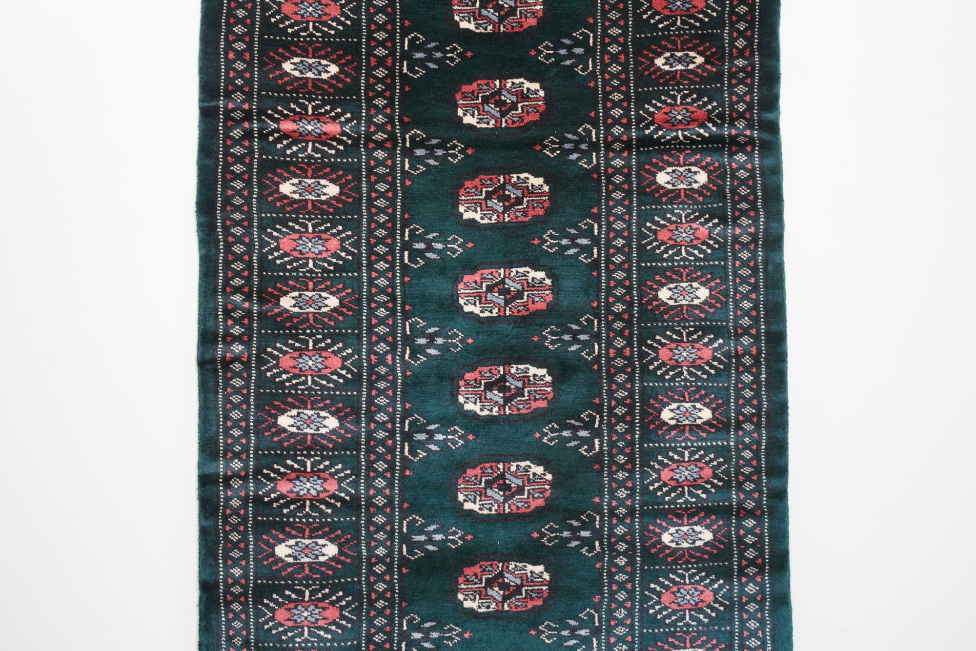 name: Tutkinorigin: Pakistan, Peshawar Bokhara style: runner, rug, carpetmaterial: hand woven woolcolors: green, teal, pink, reds, black, cream, lt blueage: vintagecondition: good, age related wear - see picturesappraised value: $1,108