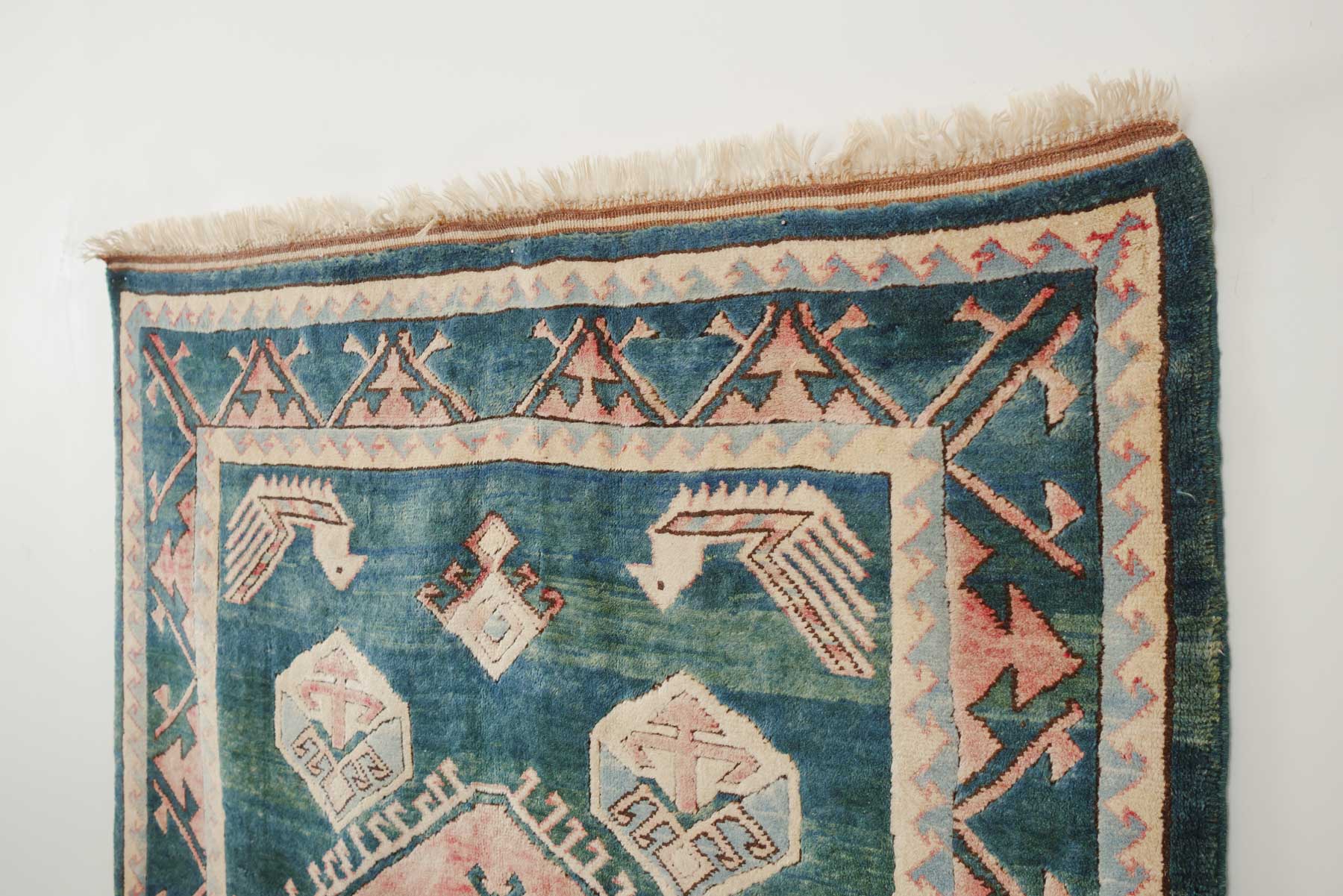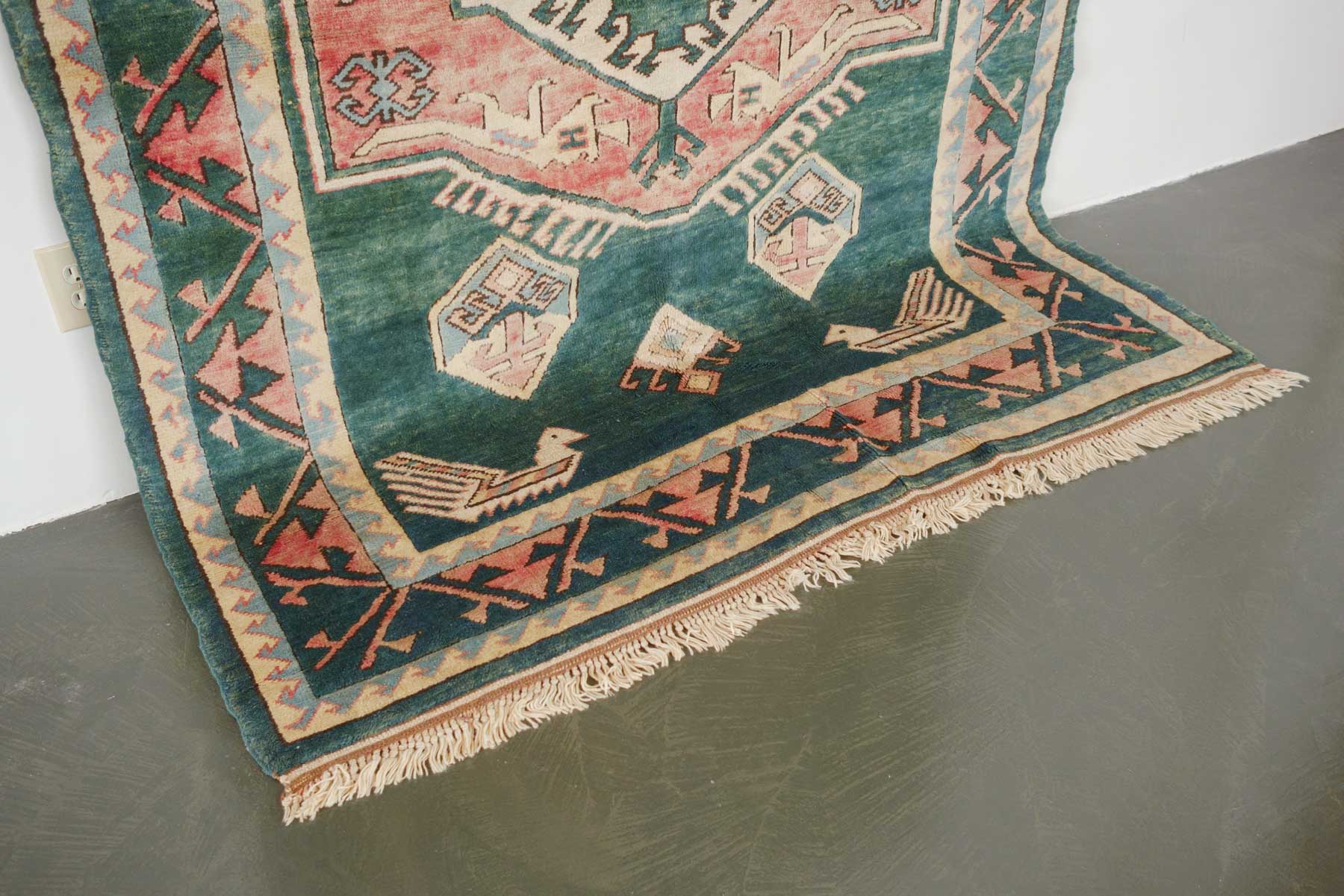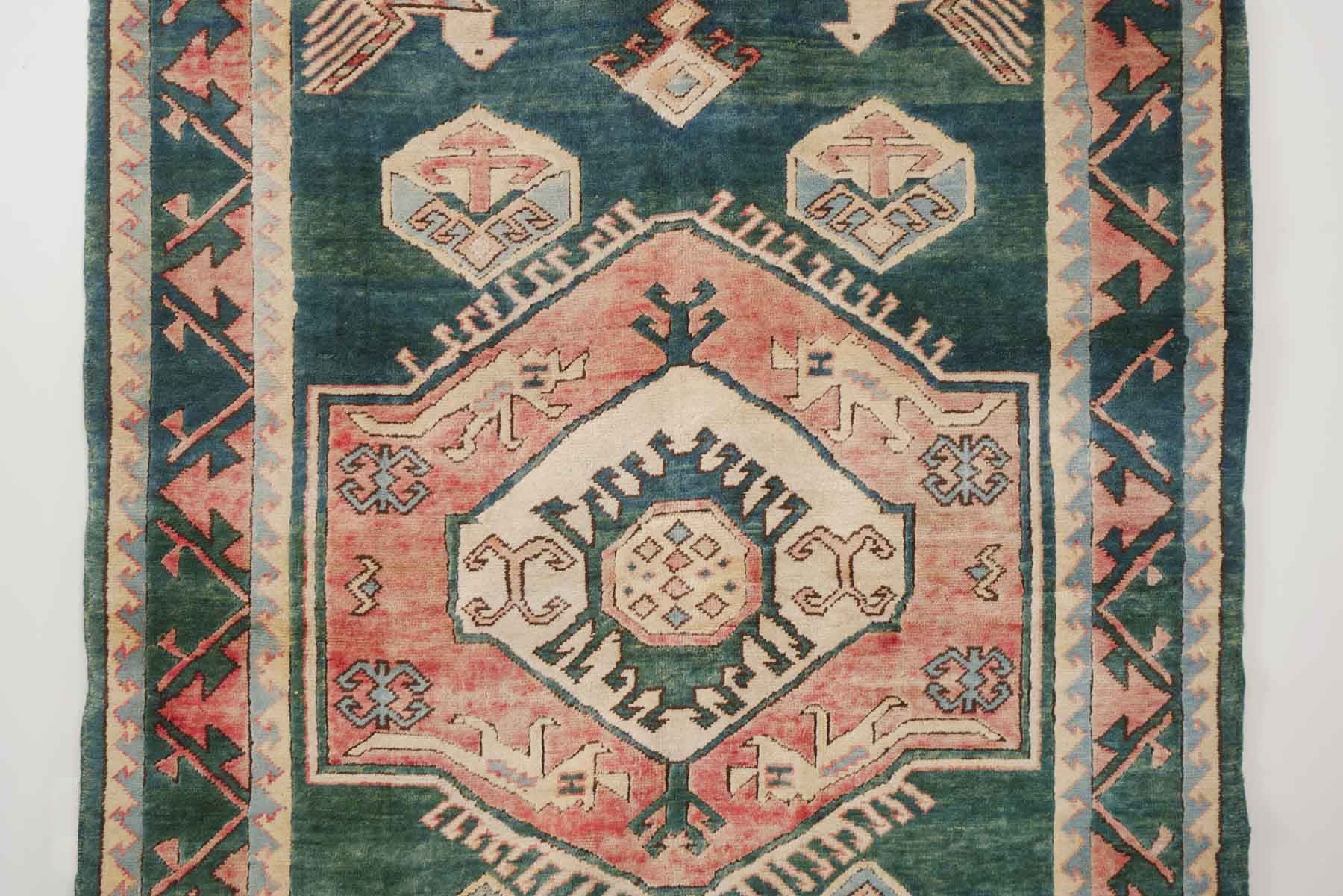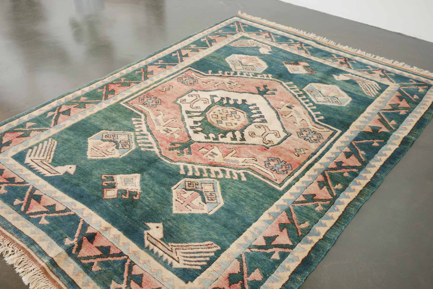 name: Ertemorigin: Turkeystyle: rug, carpet material: hand knotted woolcolors: green, pink, blue, cream, brown, gray age: vintagecondition: good, age related wear / small hole - see pictures