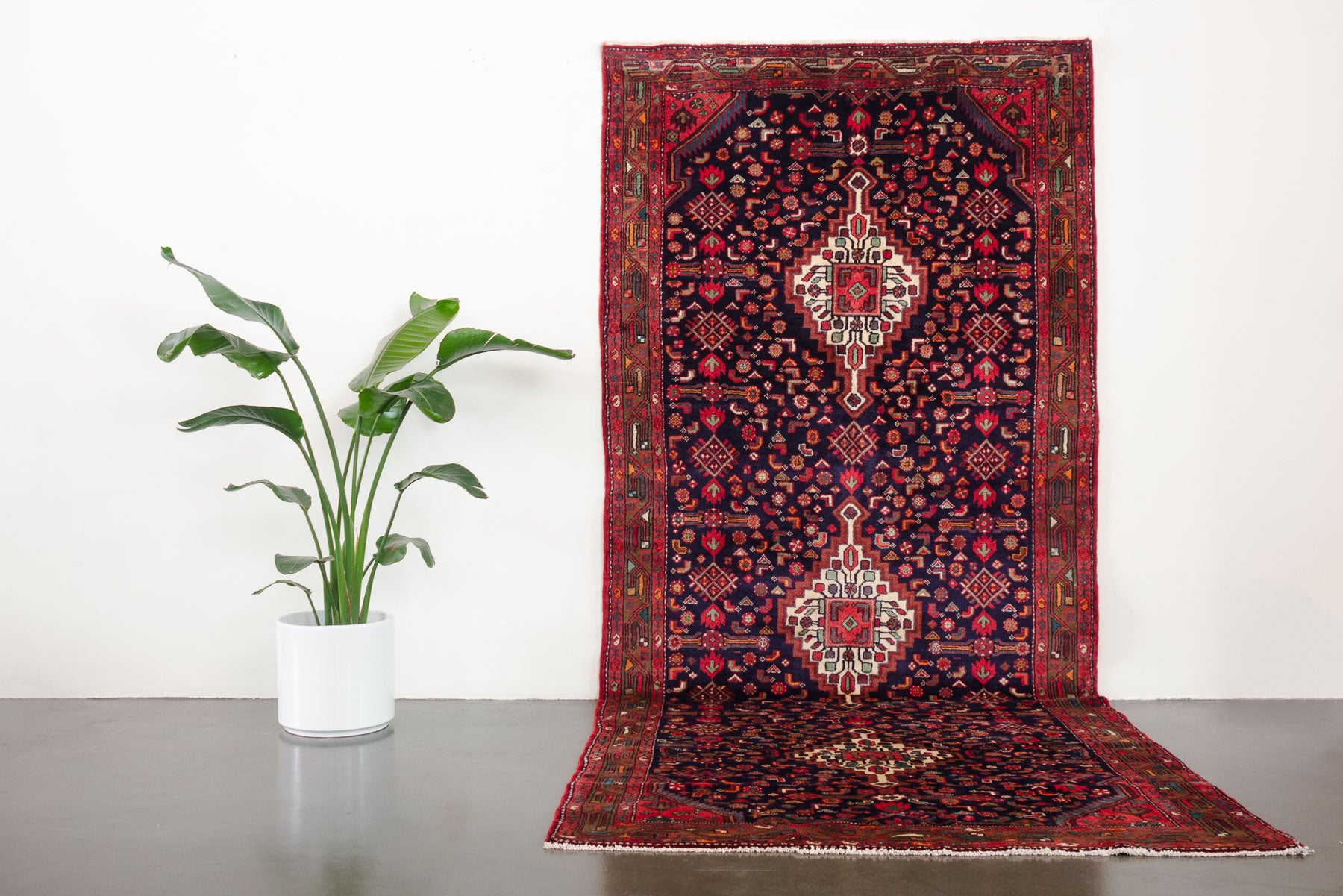 name: Soshiantorigin: Iran (Persian), Koliaistyle: rug, carpetmaterial: hand knotted woolcolors: navy, red, pink, green, blues, orange, browns, creamage: vintage, 1940-1970condition: good, age related wear - see picturesappraised value: $2,340