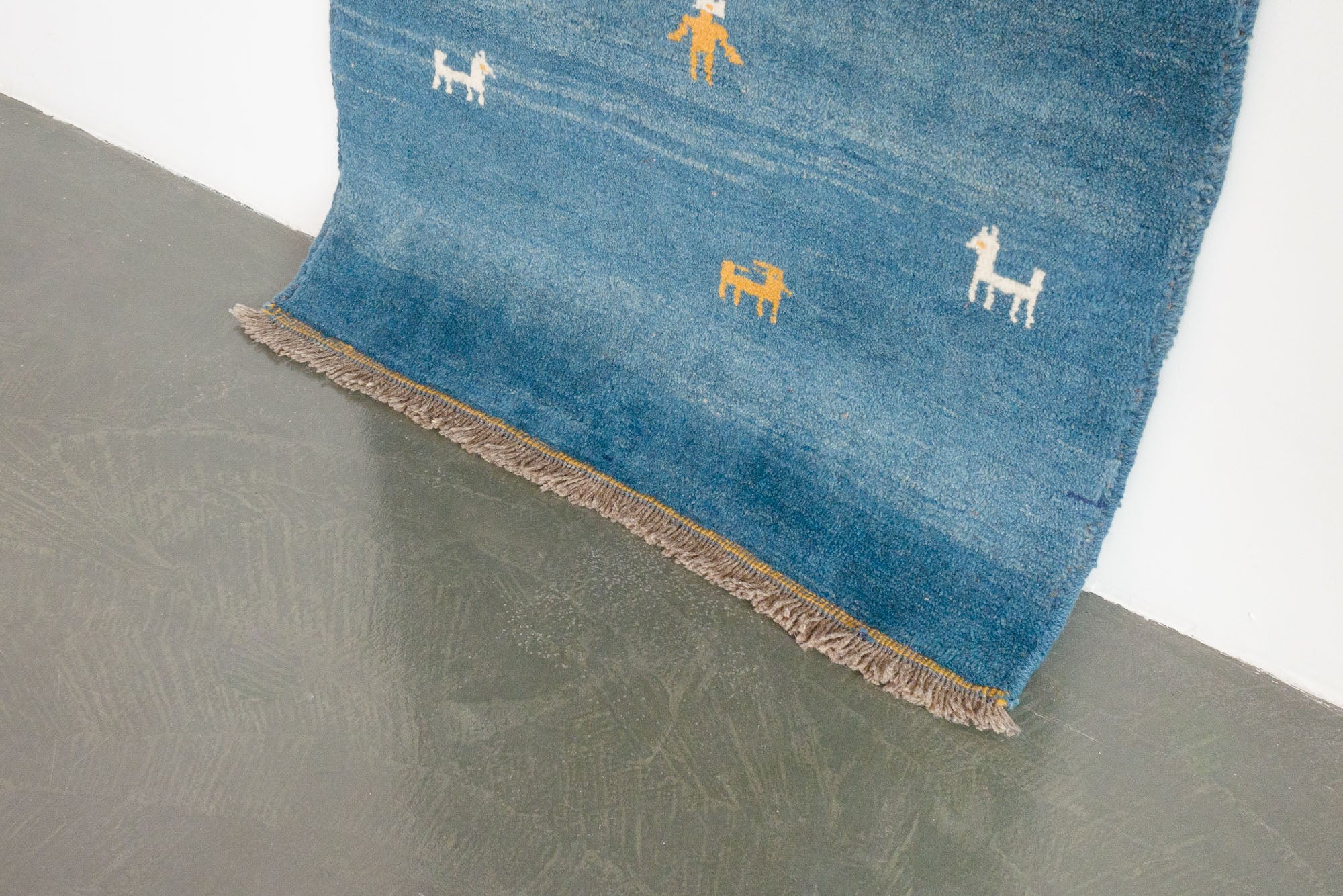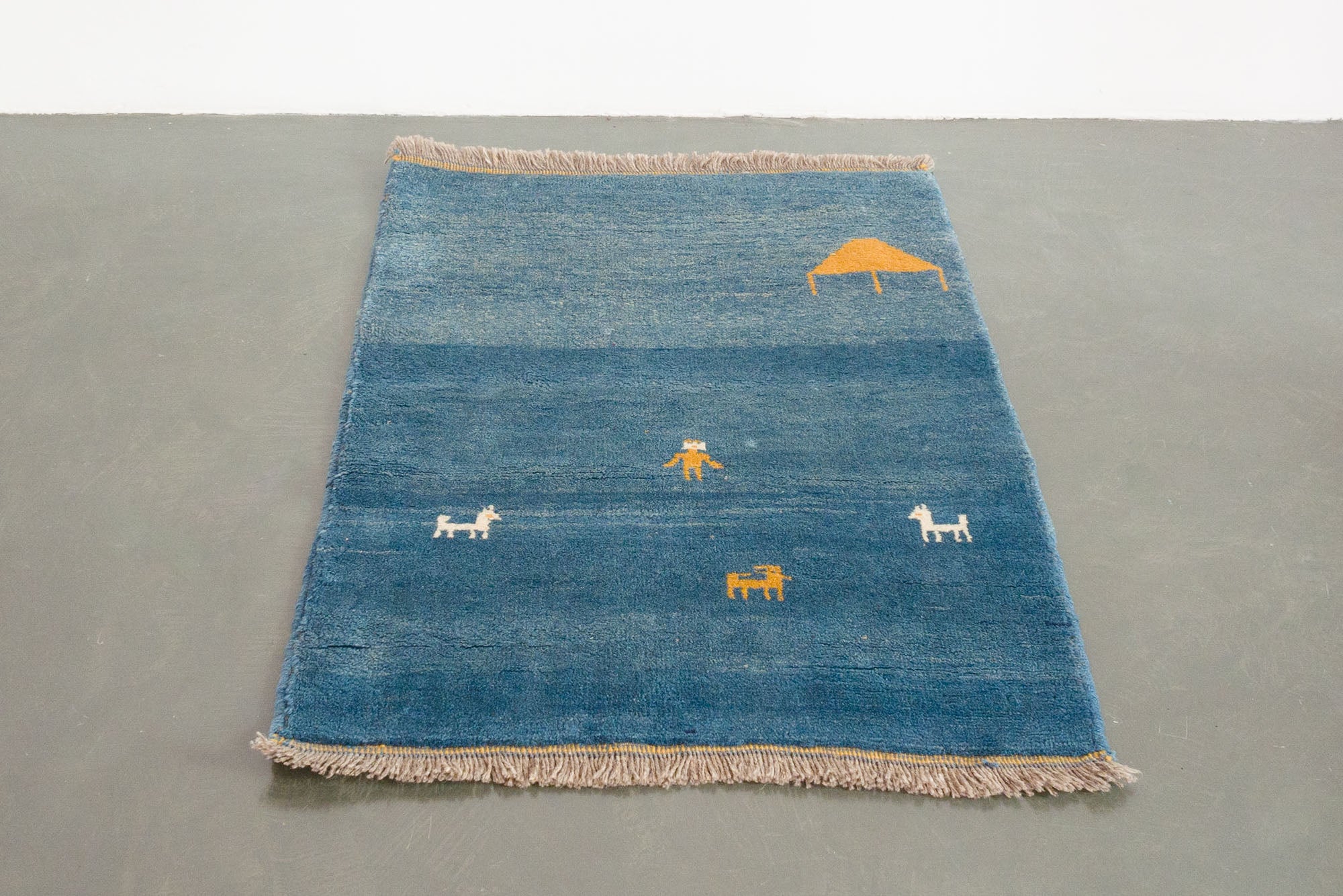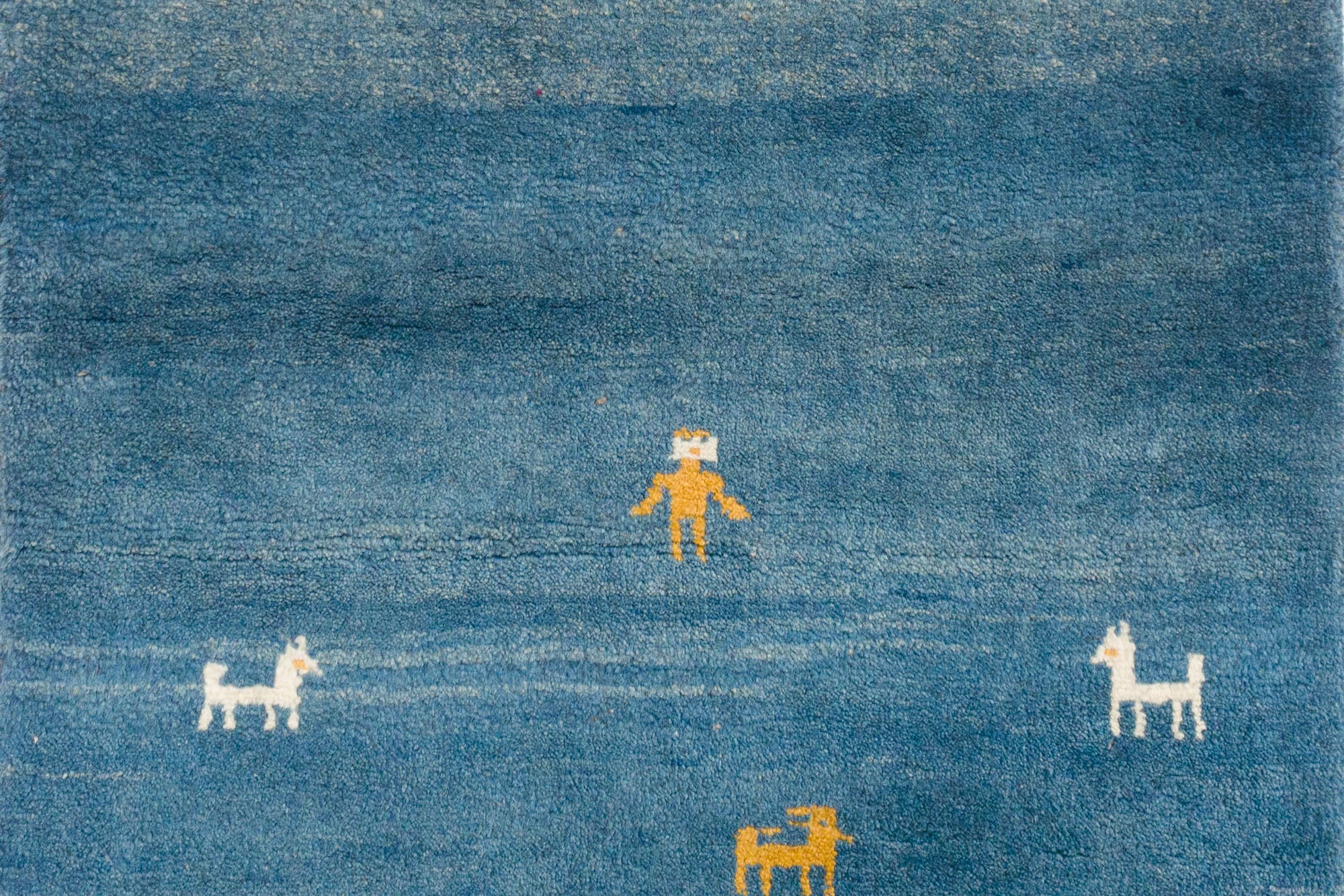 name: Hurdadorigin: Persian (Iran)style: gabbeh, traditional, figural, rug, carpetmaterial: hand knotted woolcolor: blue, yellow, creamage: vintage (1940-1969)condition: good, age related wear - see picturesappraised value: $876