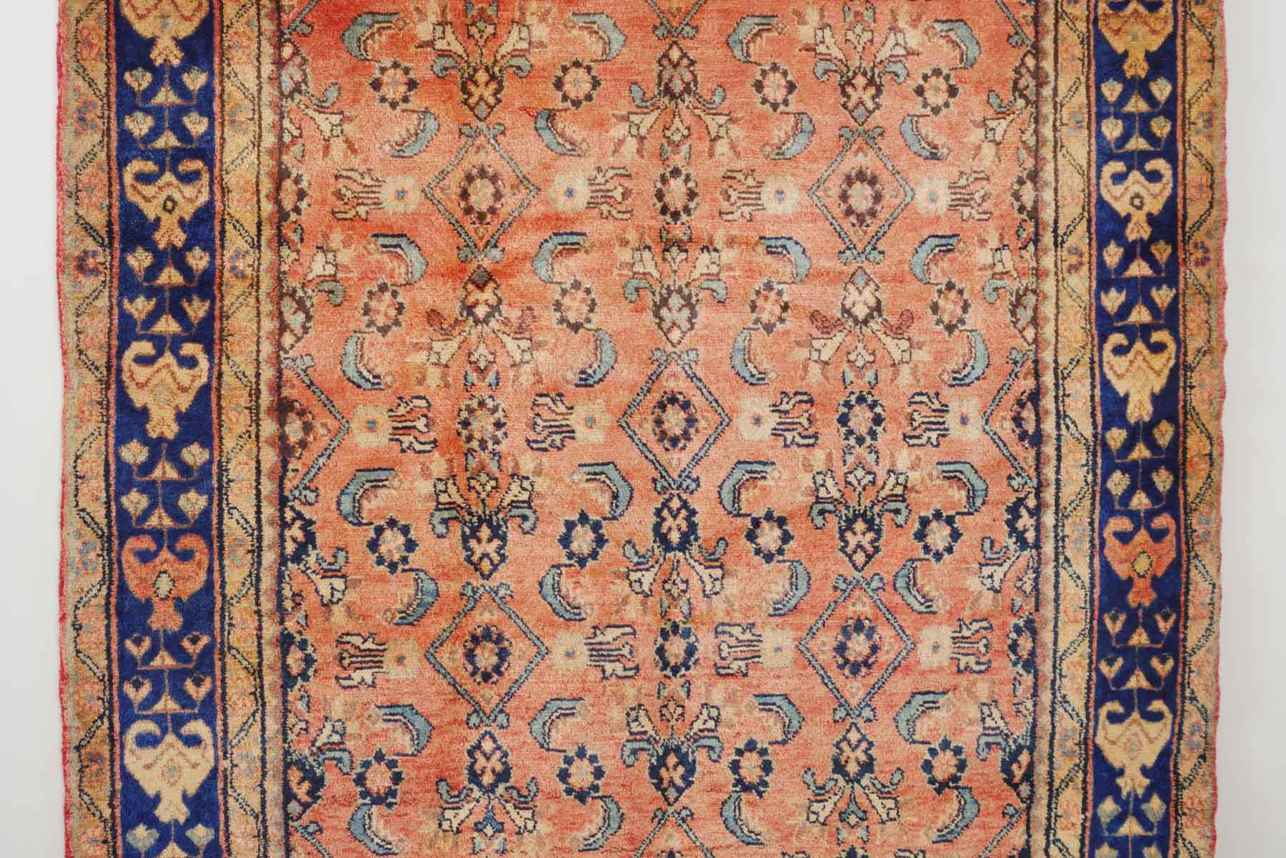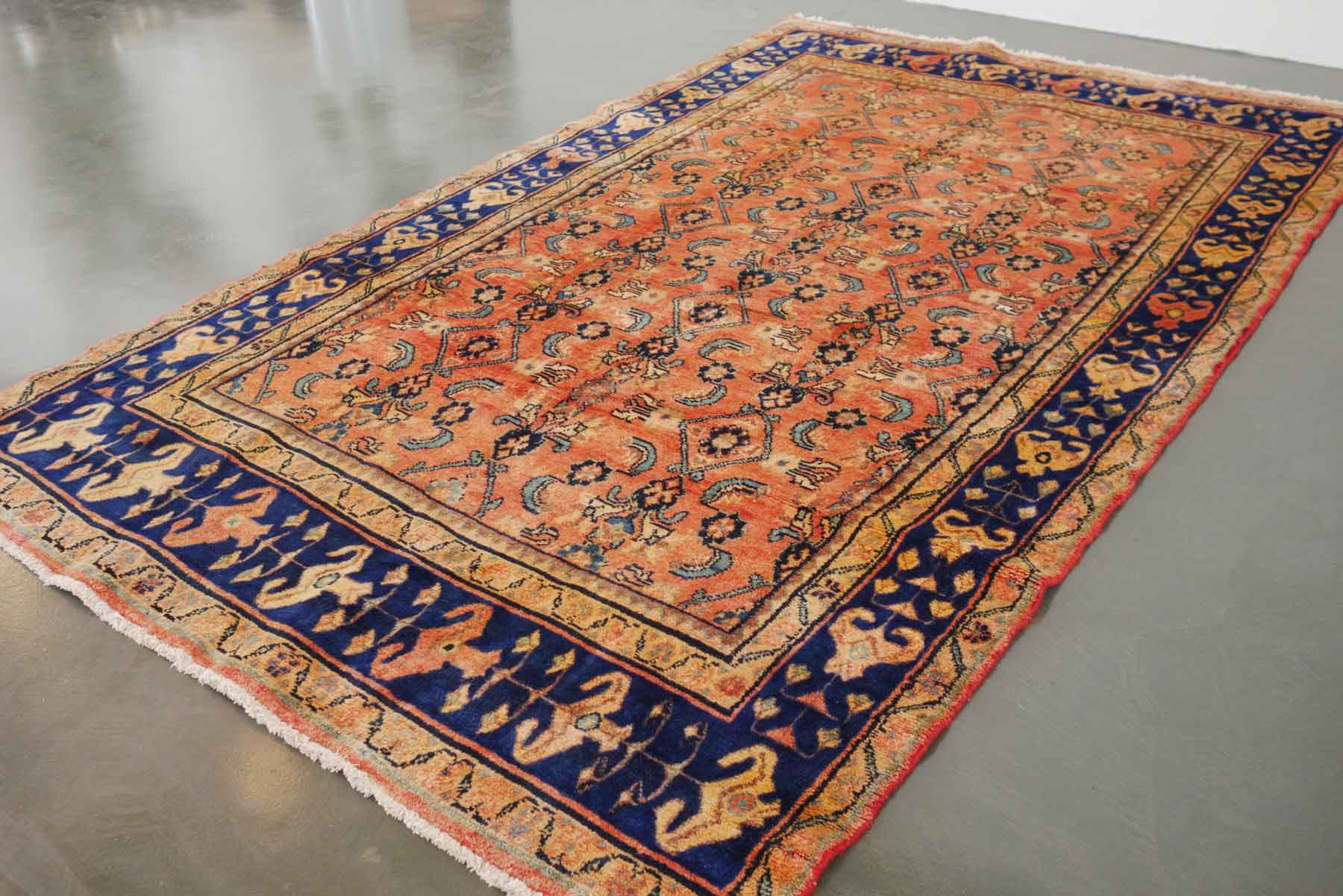 name: Nezamstyle: hand knotted, Persian, rug, carpet material: woolcolors: peach, gold, blue, grey age: vintage condition: good, age related wear - see pictures