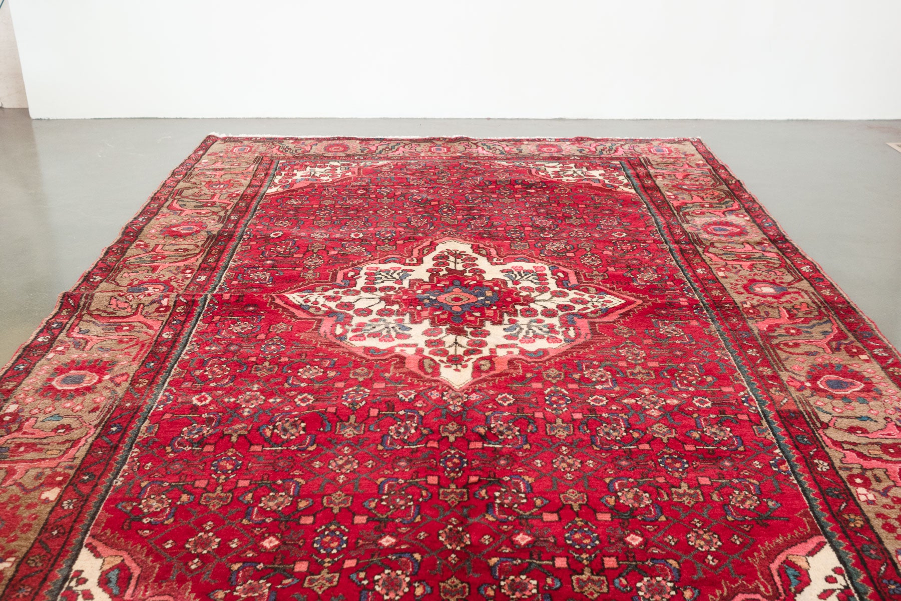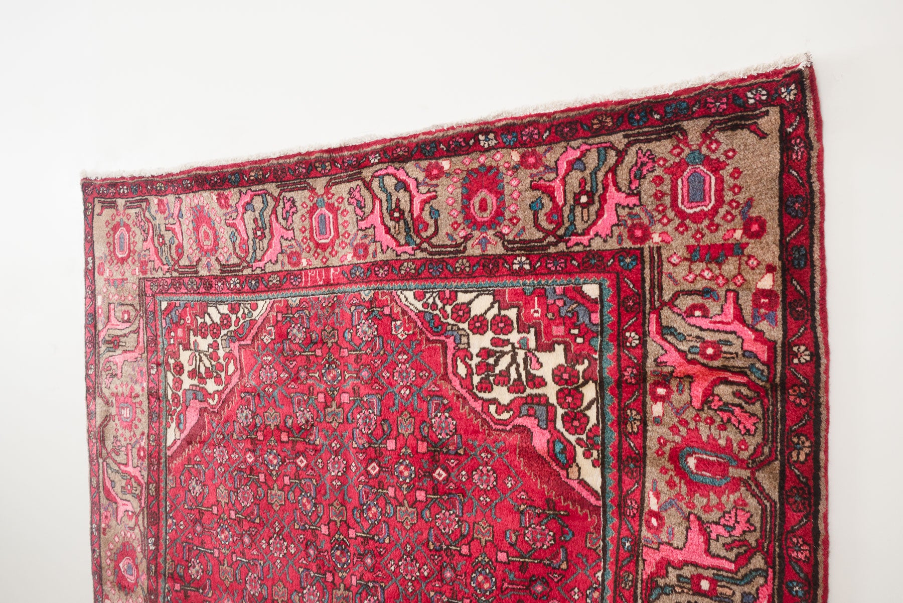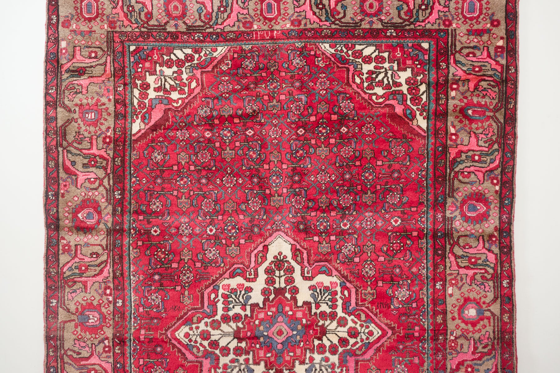 name: Tiraborigin: Iran (Persian), Hamadan style: rug, carpetmaterial: hand knotted woolcolors: red, pink, blues, cream, black, brown, grayage: vintage 1940-1970condition: good, age related wear - see pictures