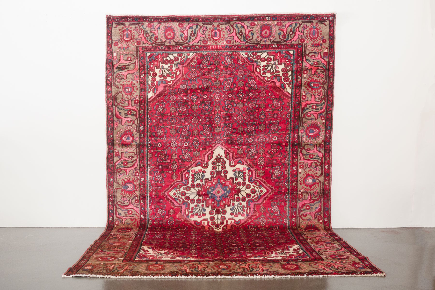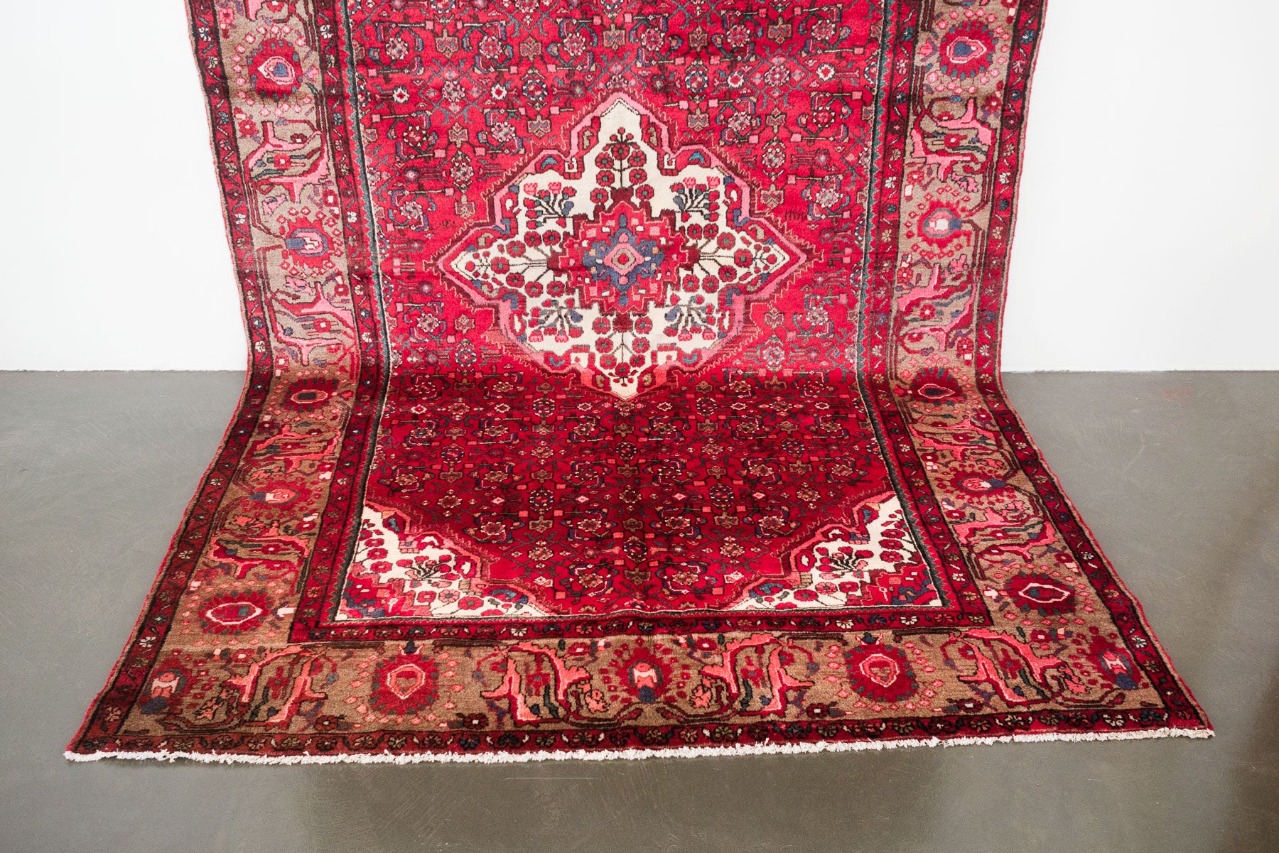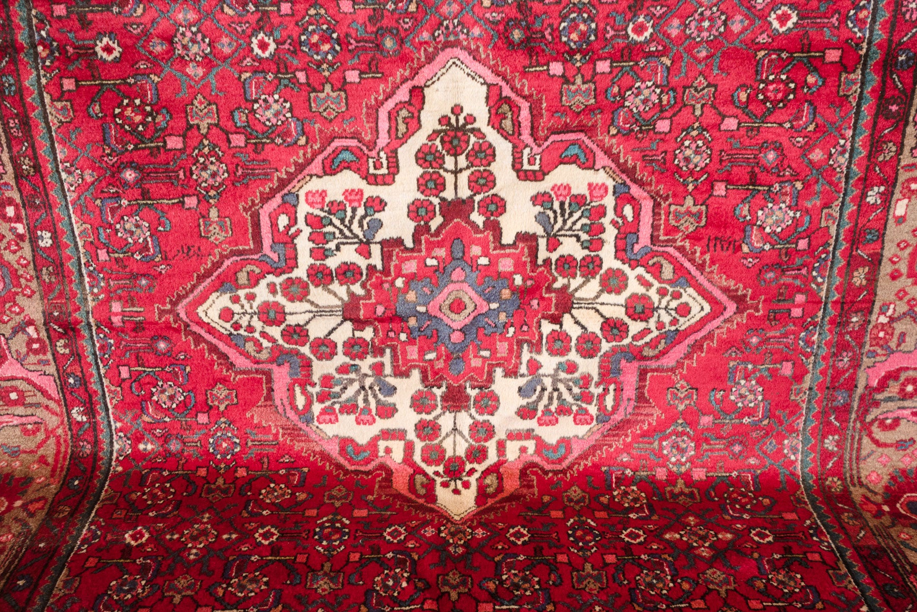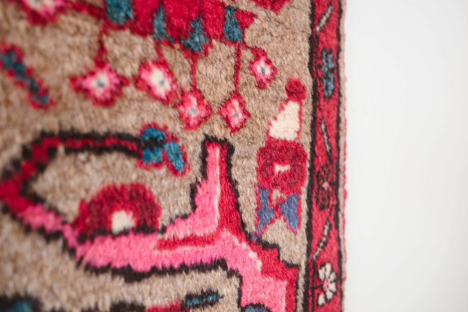 name: Tiraborigin: Iran (Persian), Hamadan style: rug, carpetmaterial: hand knotted woolcolors: red, pink, blues, cream, black, brown, grayage: vintage 1940-1970condition: good, age related wear - see pictures
