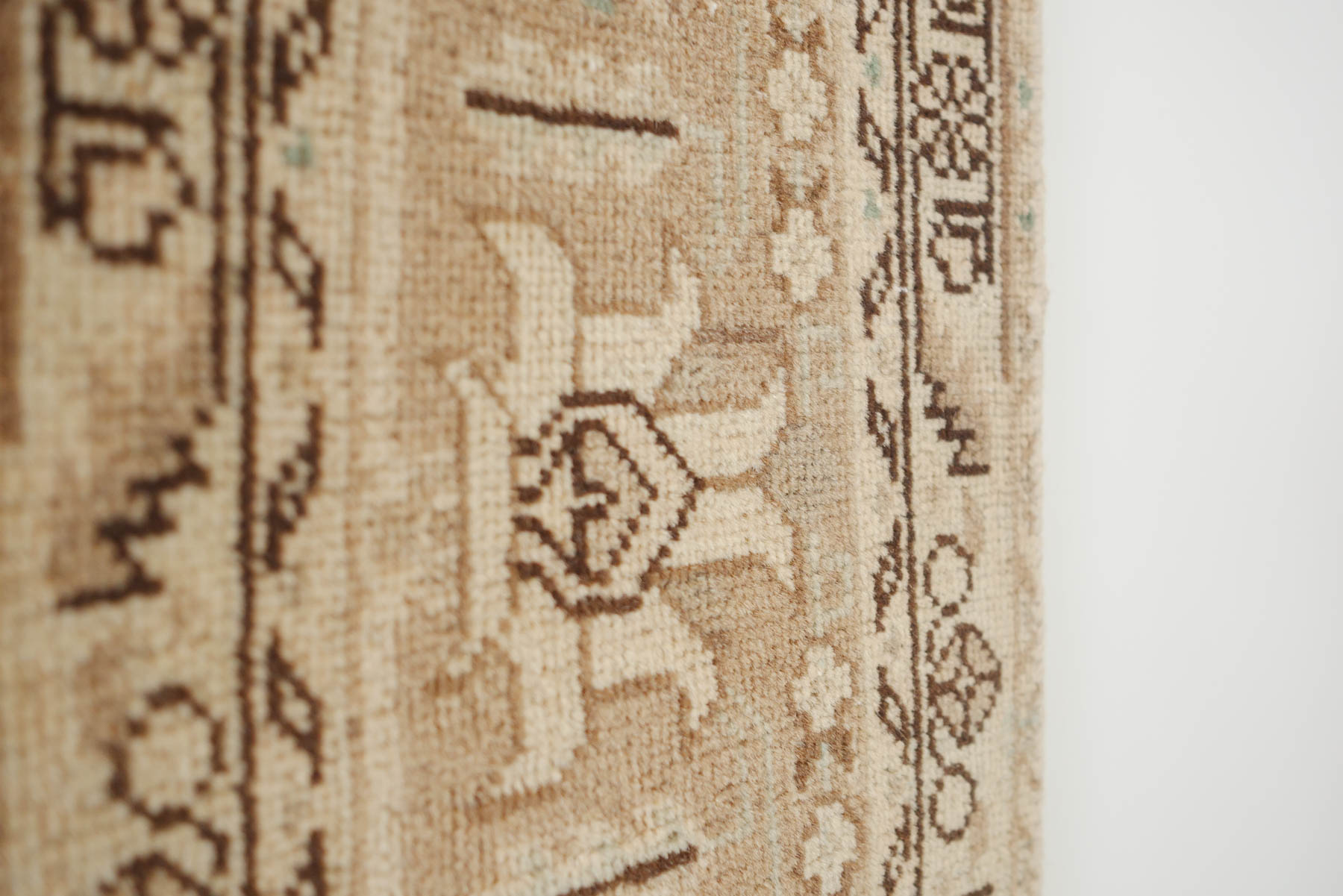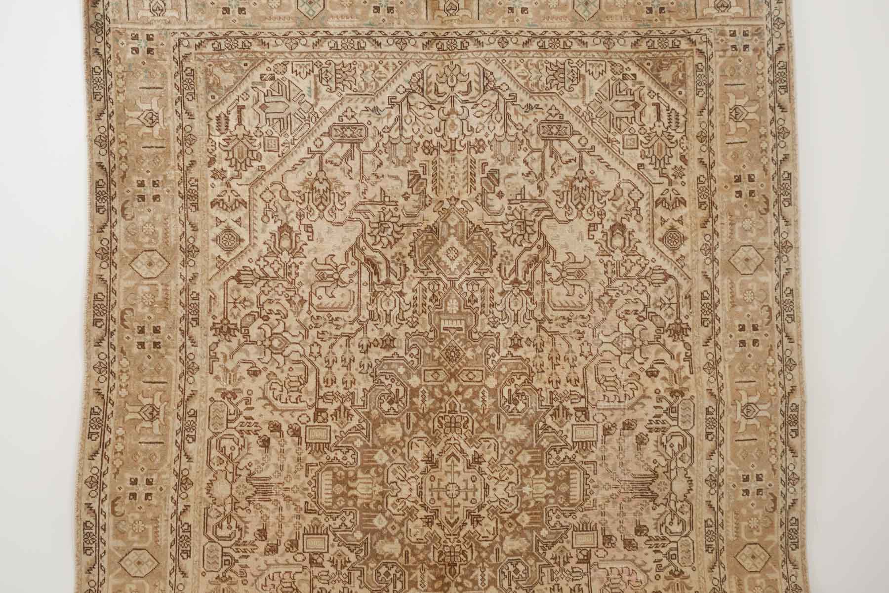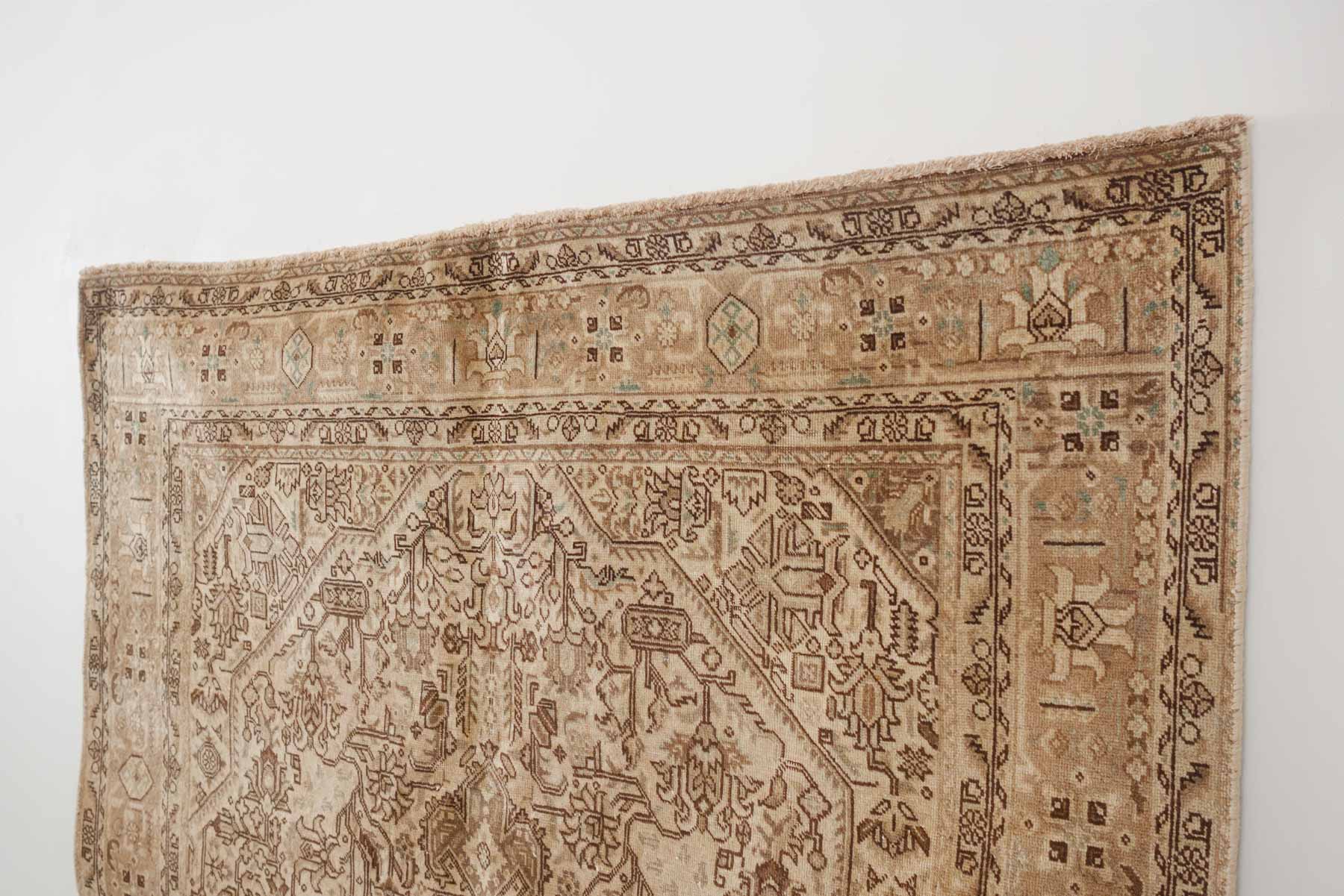 name: Nikav style: hand knotted, Persian, sunwashed, rug, carpet material: wool colors: cream, dark brown, tan, mint age: vintage condition: good, age related wear - see pictures