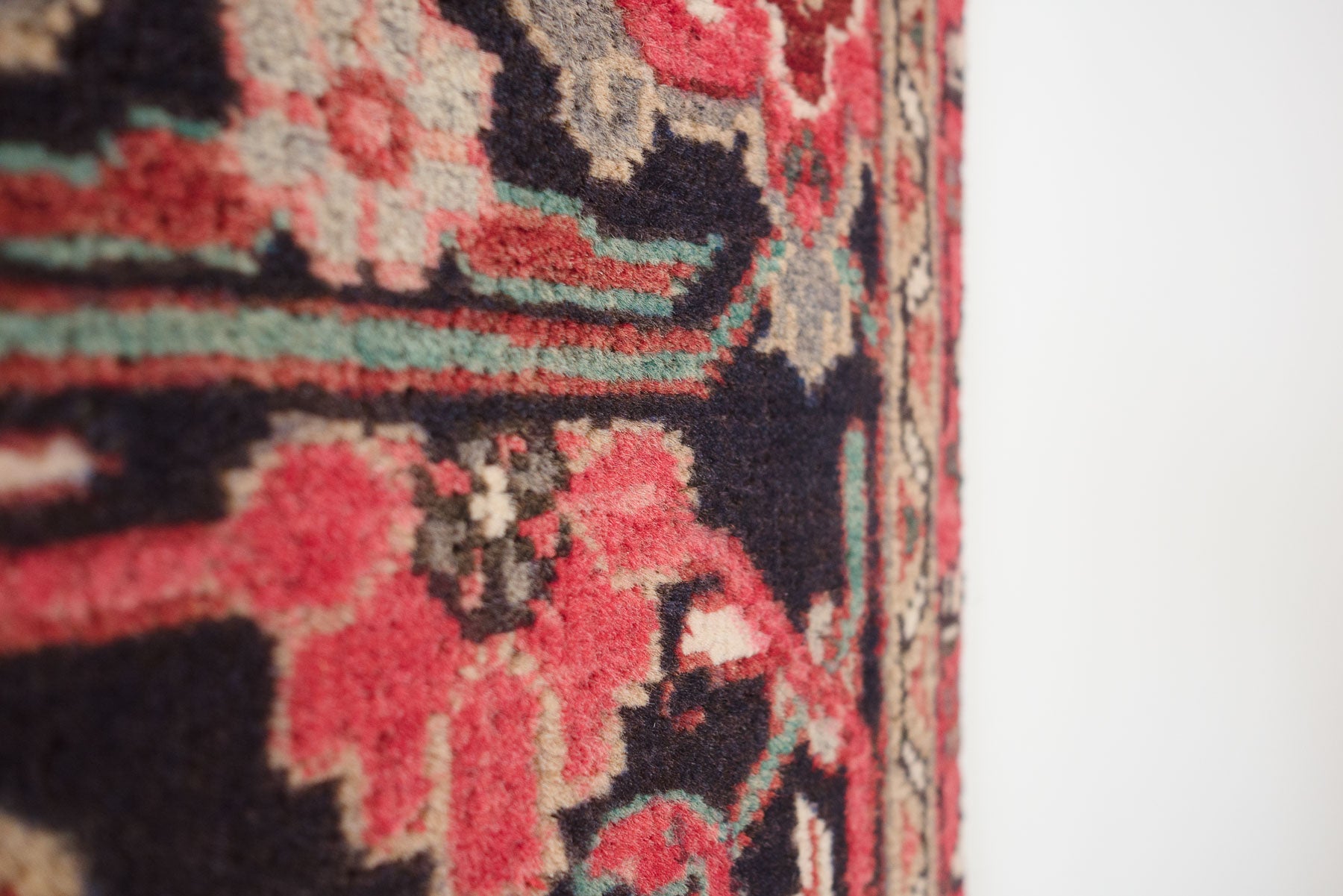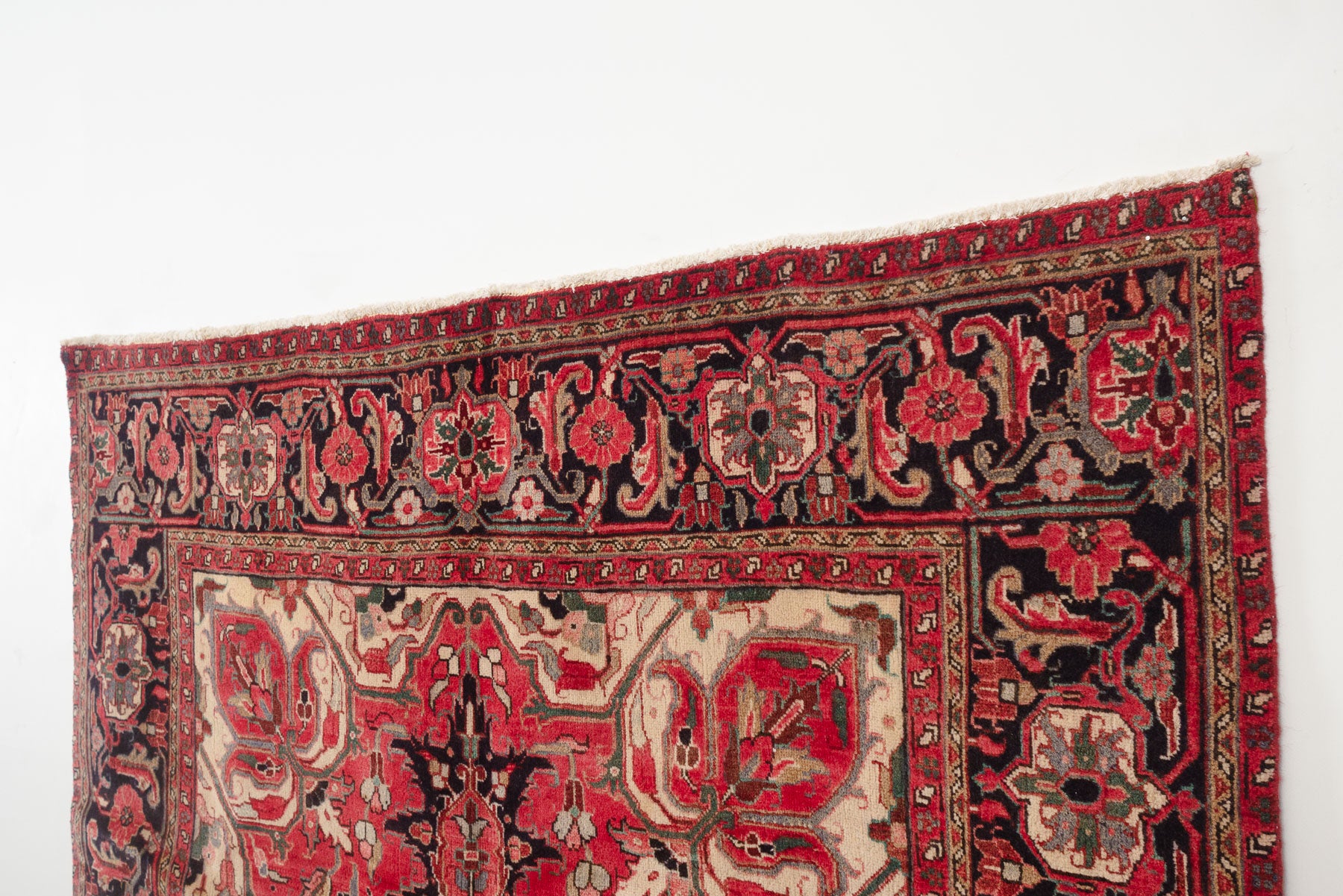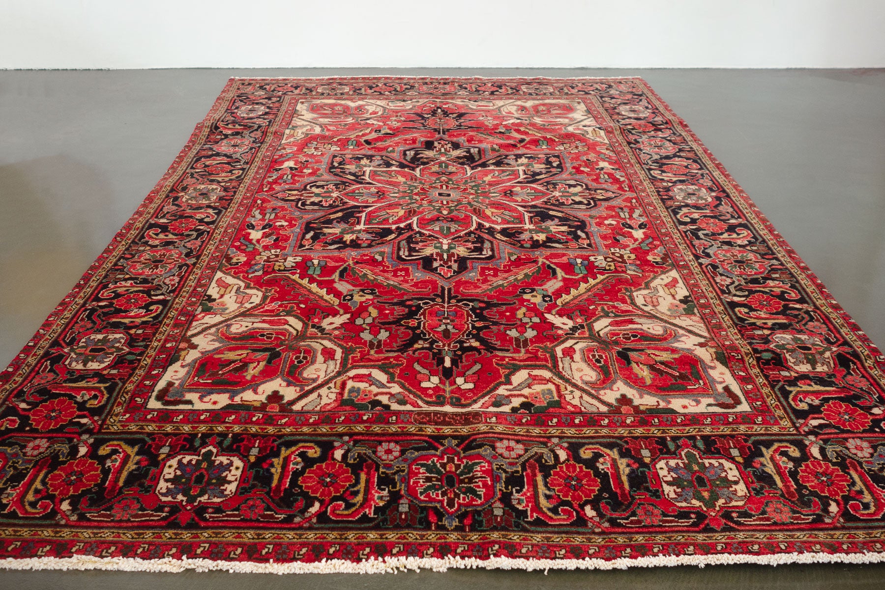 name: Soheilorigin: Iran (Persian), Heriz style: rug, carpetmaterial: hand knotted woolcolors: reds, black, cream, green, blues, navy, camel, greyage: vintage, 1940-1970condition: good, age related wear - see picturesappraised value: $3,852