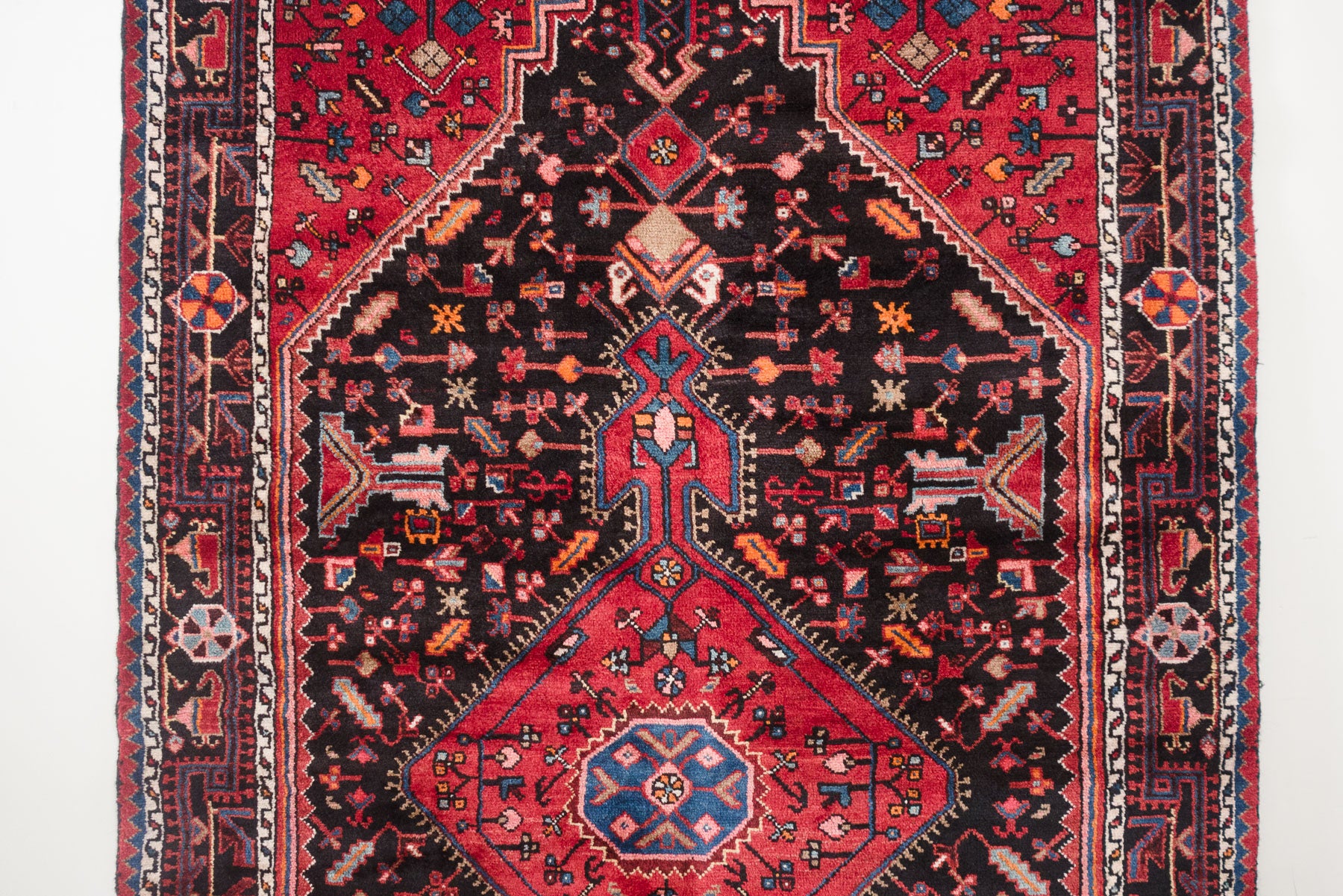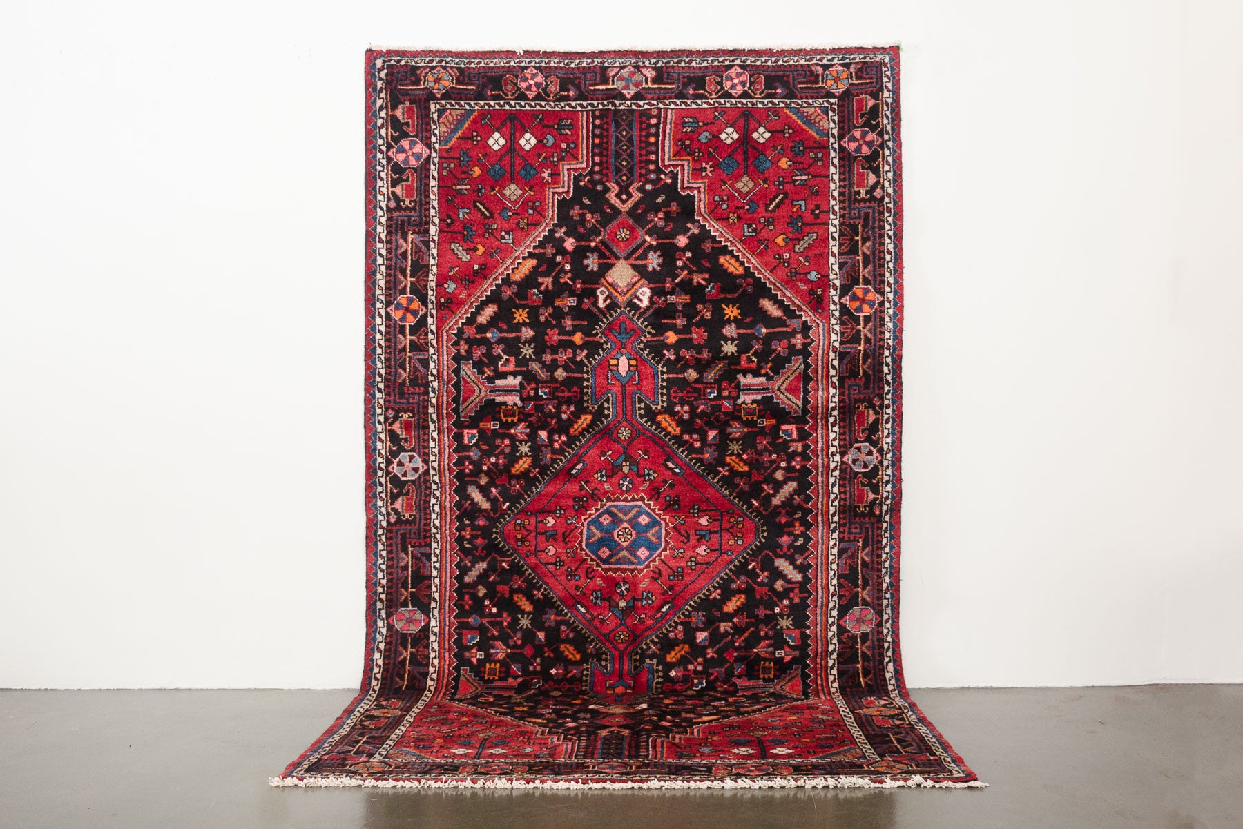 name: Toorhaorigin: Iran (Persian), Hamadan style: rug, carpetmaterial: hand knotted woolcolors: red, black, pink, blues, cream, navy, yellow, orange, camel age: vintage, 1980scondition: good, age related wear - see pictures