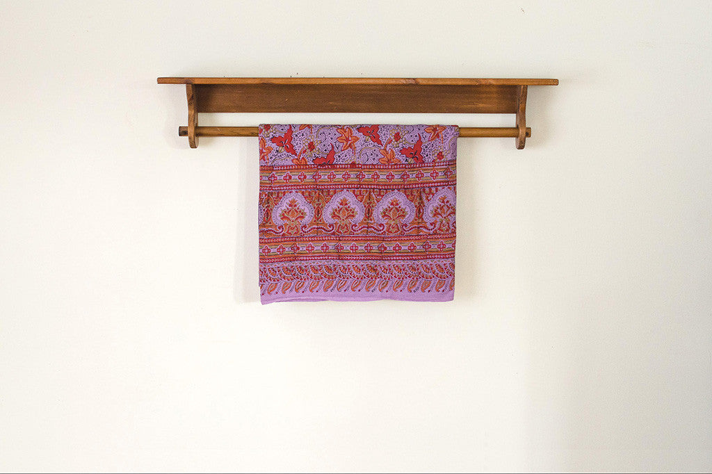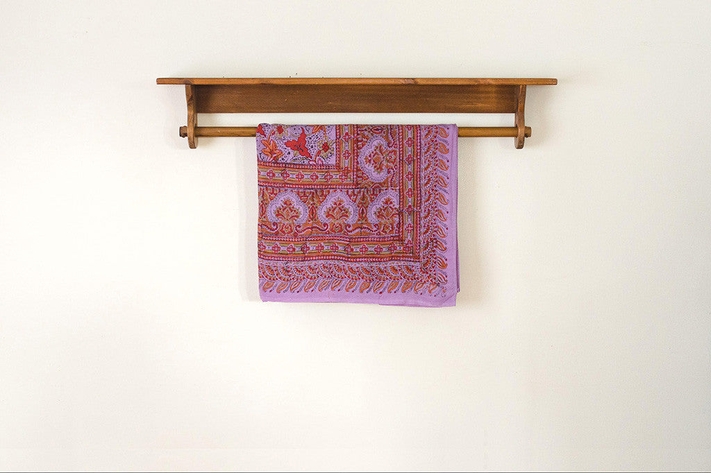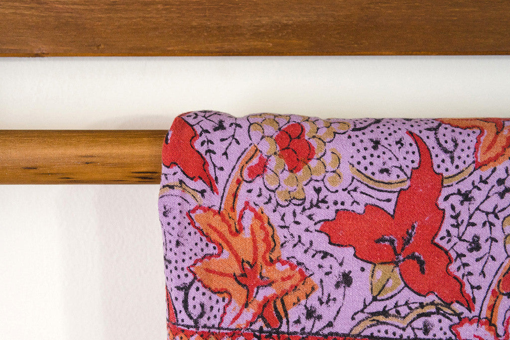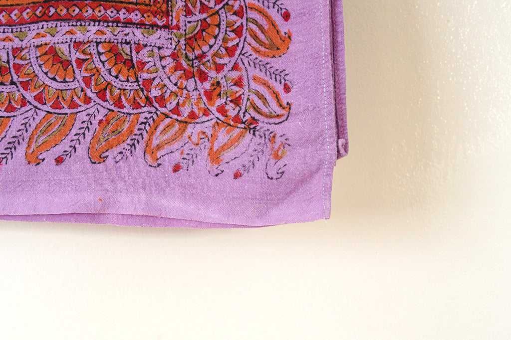 This light-weight vintage blanket is a purple, orange, red, green and black floral and paisley print on cotton. It's in excellent shape and is machine washable. Perfect for picnics, the beach or as a bedspread. Please see pictures for detailed condition of this piece.
