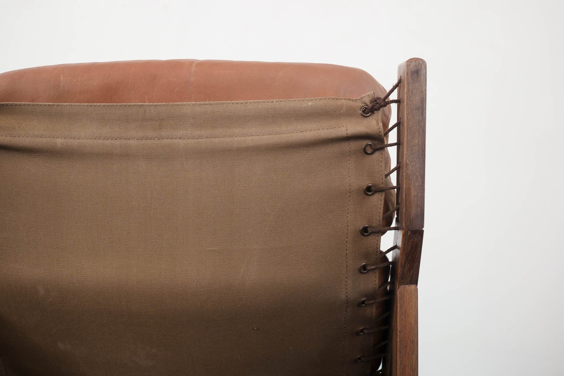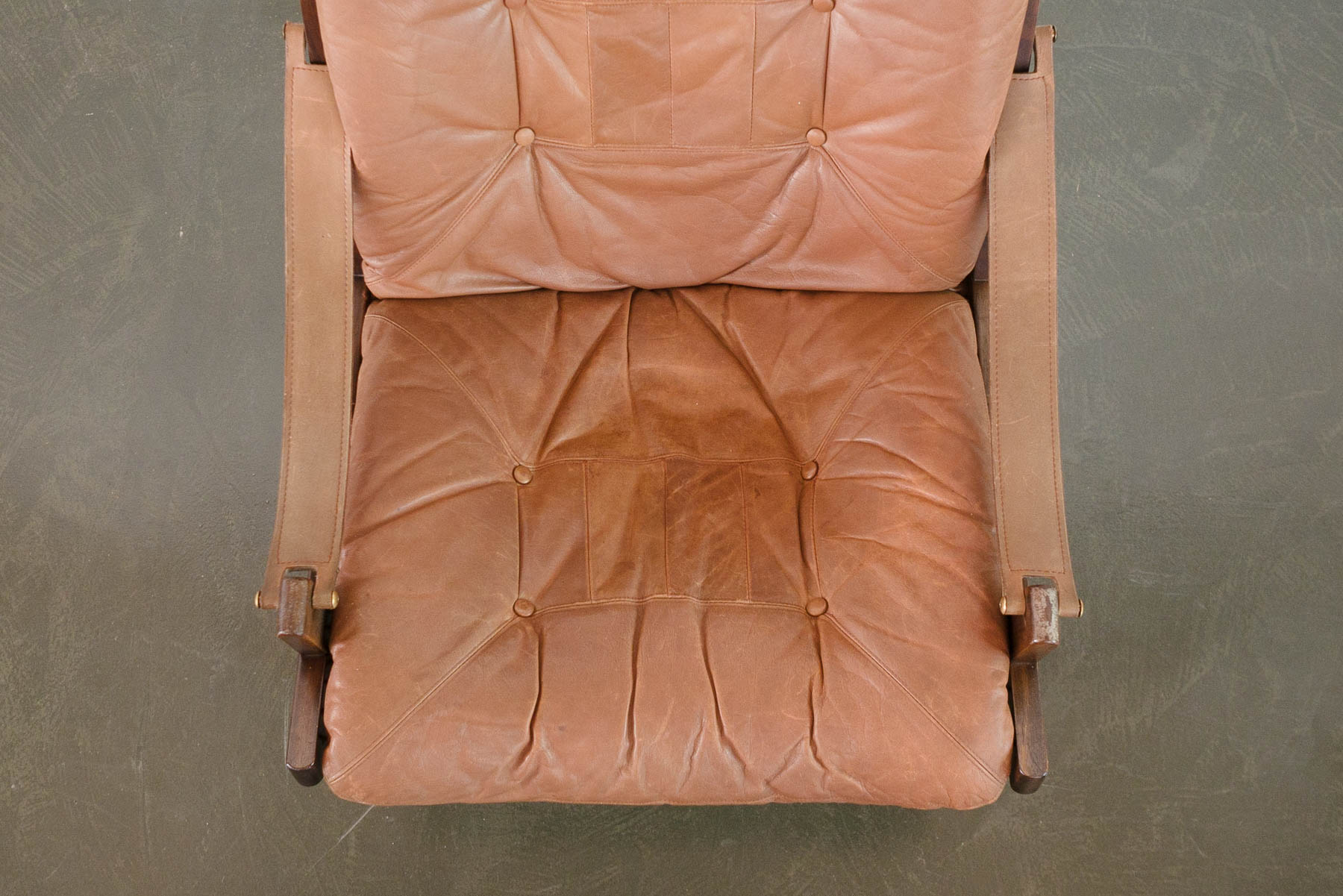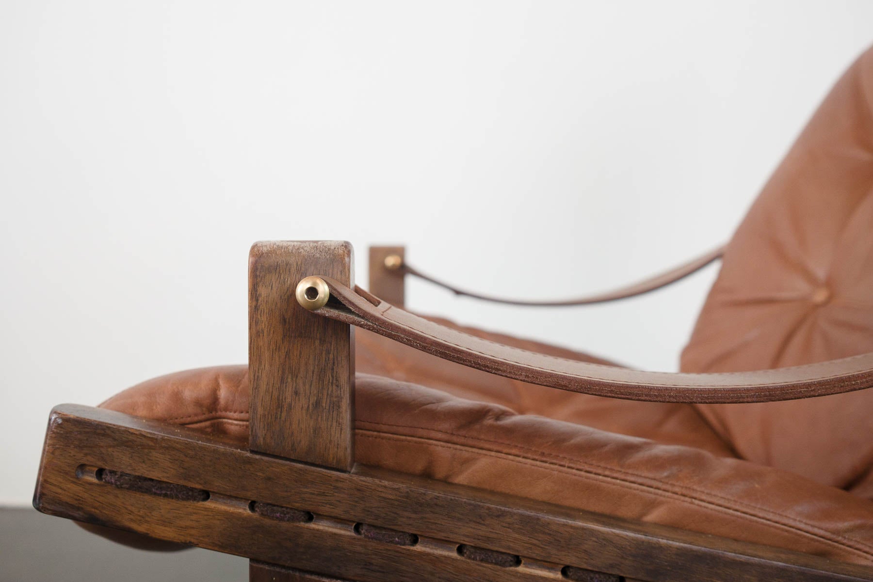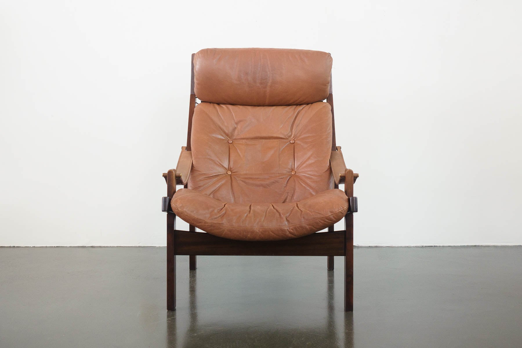 style: modern, high back, tufted, sling, lounge chairmaterial: wood (rosewood), leather (brown chestnut), canvas, ropebrand: Bruskbo, Hunter Chairdesigner: Torbjørn Afdalage: vintage, Mid Centurycondition: good, age related wear - see pictures 26.5" wide x 29.5" deep x 37.5" high 15" seat height x 20" seat depth x 17" arm height