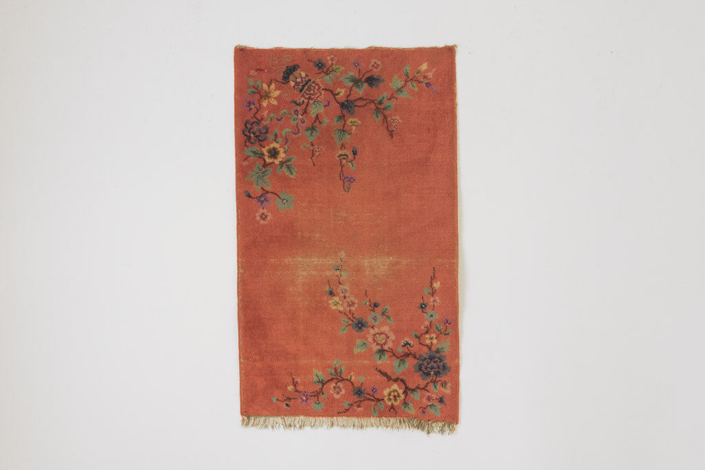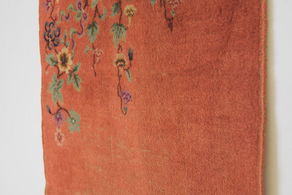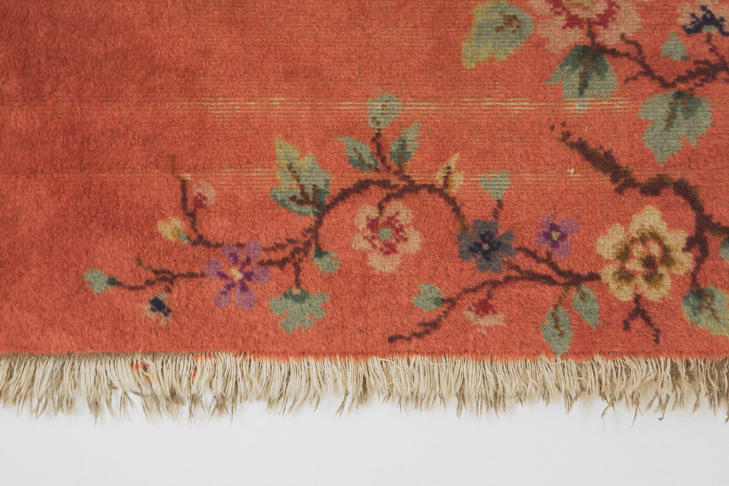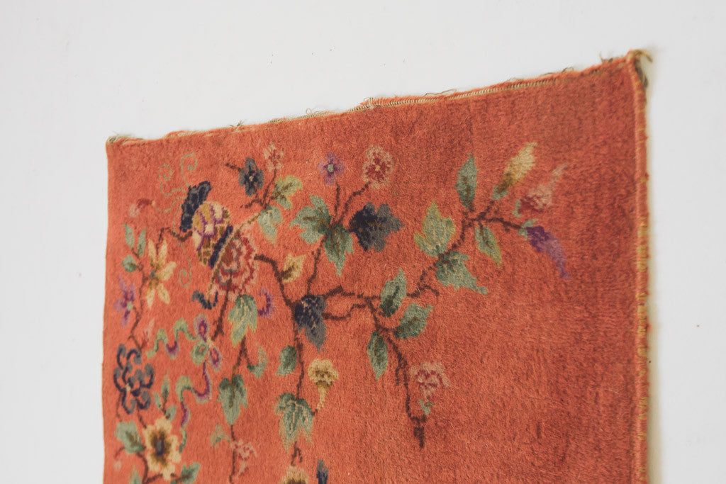 This vintage Deco era rug has a salmon base with blue, green, brown, yellow and purple accents. It's in good shape with age related wear. See pictures for detailed condition.