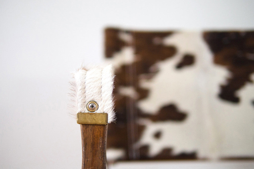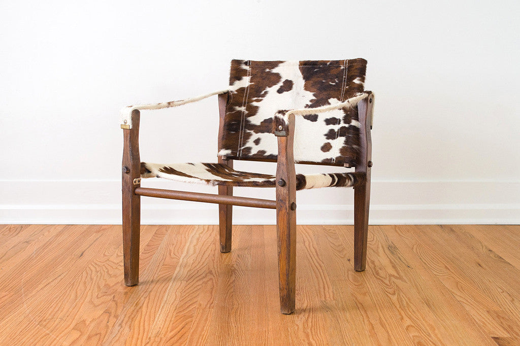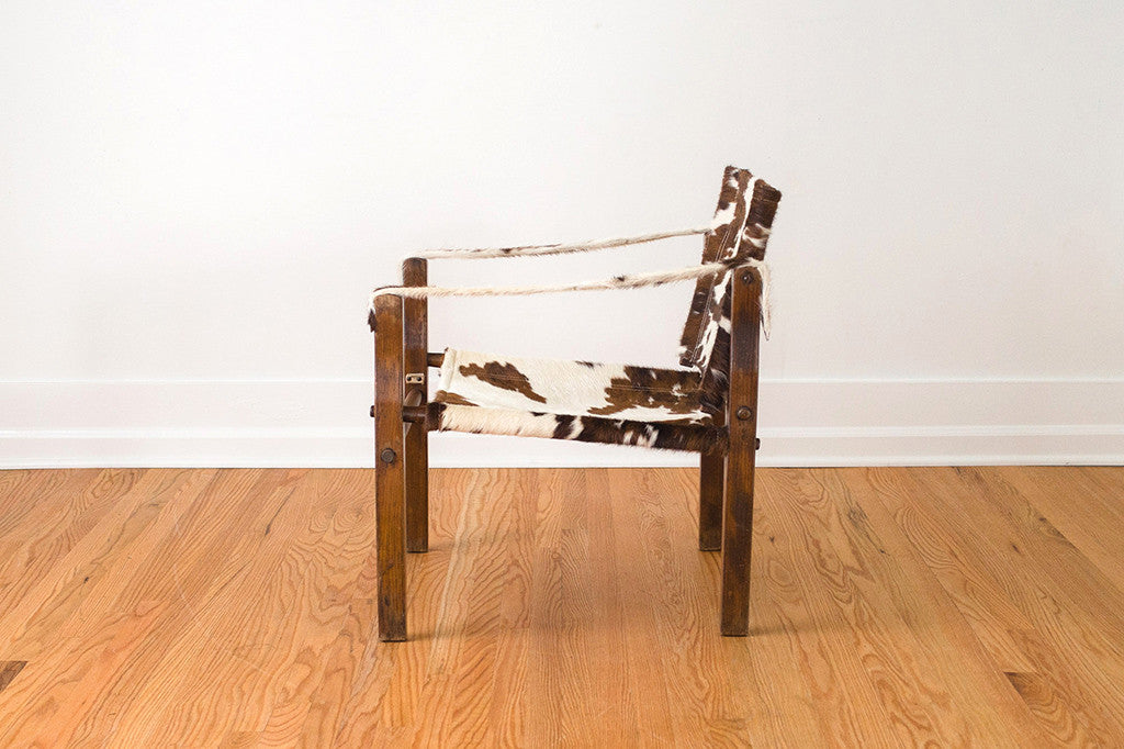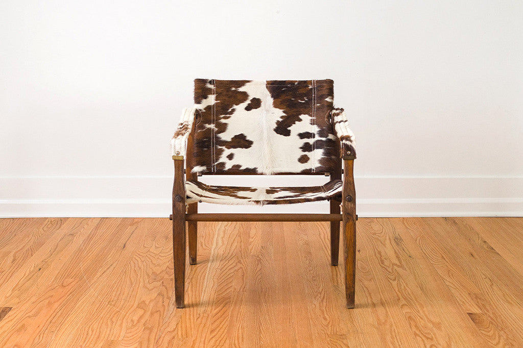 This campaign chair was manufactured by Gold Medal Folding Furniture Co. in Racine, WI. We had it upholstered in vintage cowhide with white contrast stitching. It's very sturdy and is still able to be disassemble as originally intended. The wood frame shows age related wear and the hide has natural wear. Please see pictures for detailed condition of this piece.