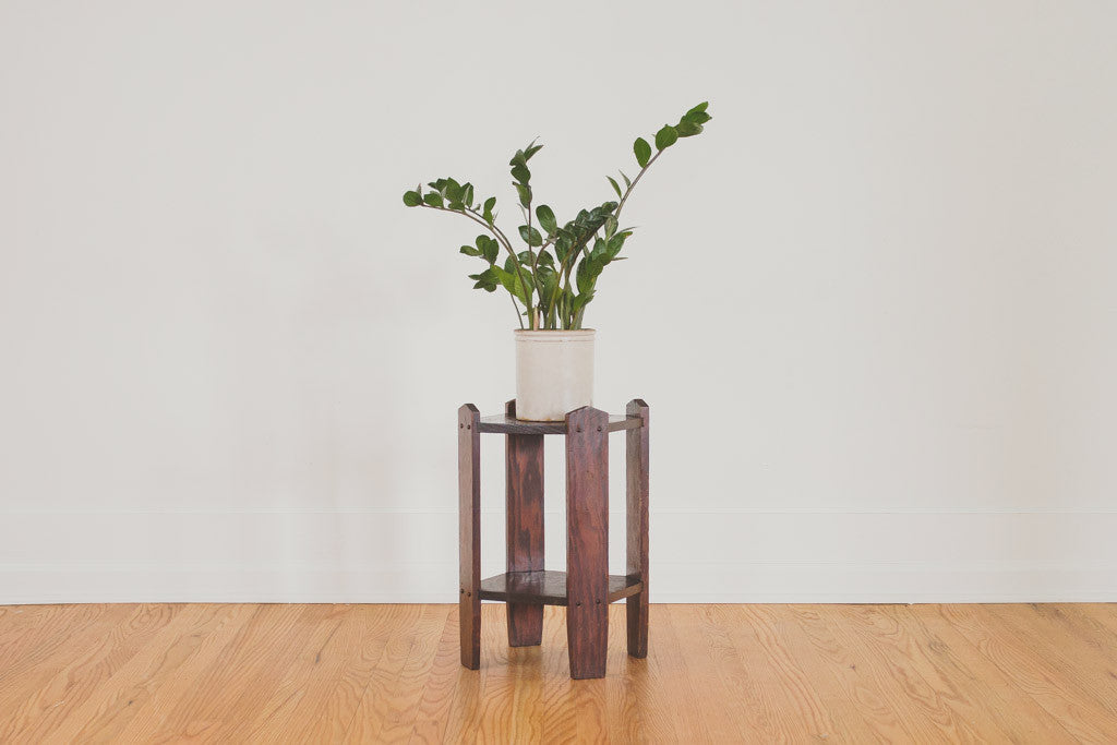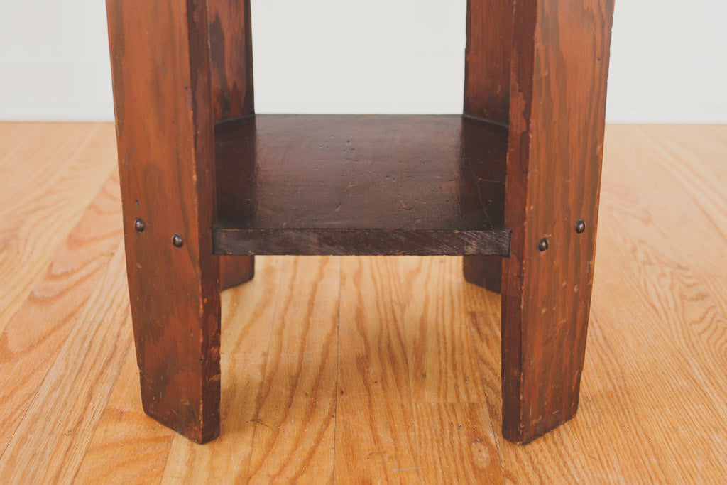 This craftsman style dark wood side table has two shelves. It's in good shape with age related wear and would also make a nice plant stand. Please see pictures for detailed condition.