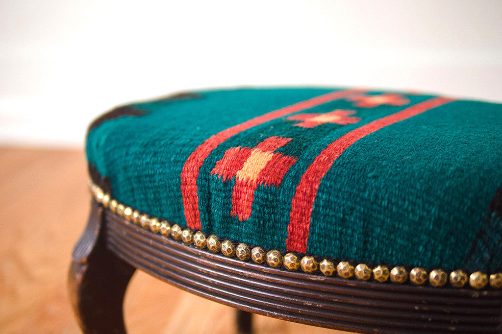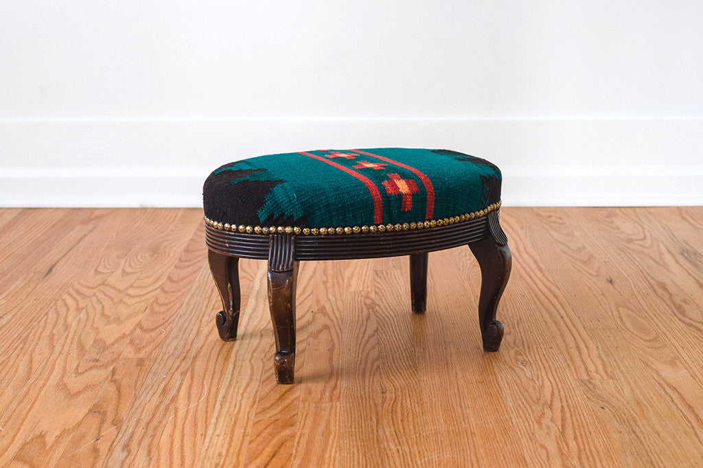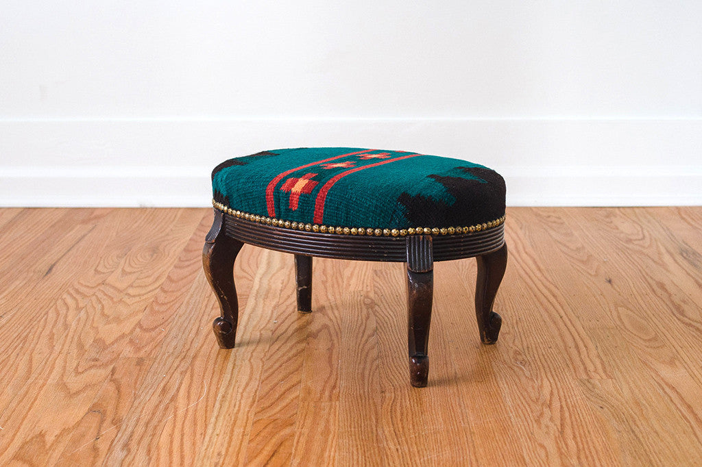 We had this antique footstool reupholstered with a small kilim rug. It turned out perfectly. The kilim has a teal base with black, yellow and orange accents. The legs on this piece are a dark carved wood with brass nailhead trim. This stool is in overall excellent shape with some age related wear to the legs. Please see pictures for detailed condition of this piece.