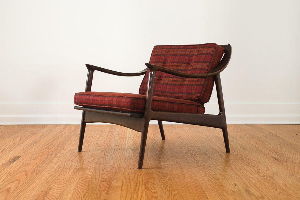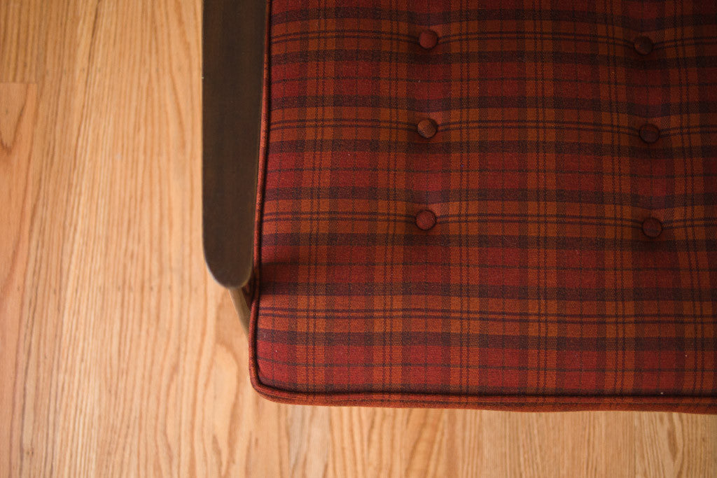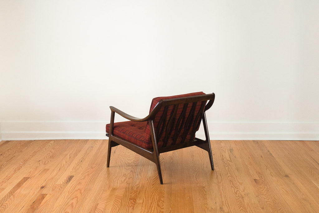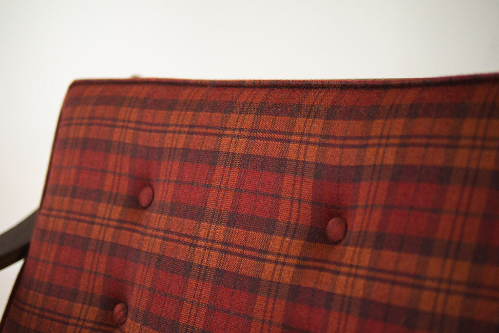 Rare Mid Century chair made in Yugoslavia with a dark wood frame. It has swooping arms, patterned dowel details on the back and new Pirelli rubber straps. The tufted cushions have new foam and custom vintage plaid upholstery. It's very comfortable and in excellent shape besides some light wear to the frame.