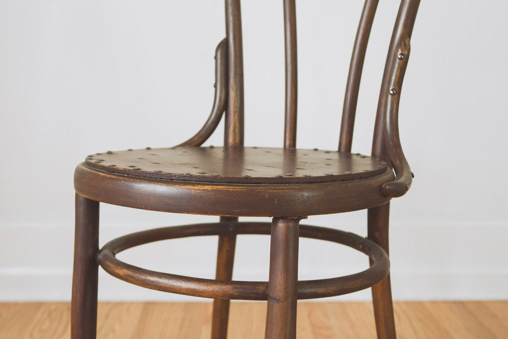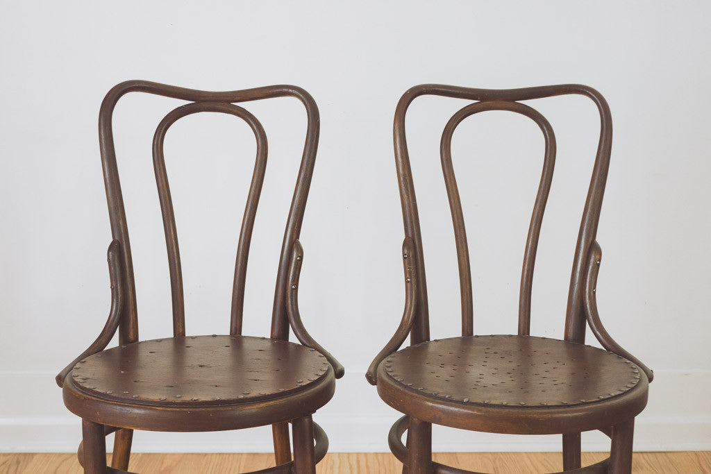 This pair of vintage bentwood chairs were manufactured in Vienna, Austria pre-1914 when Kohn merged with Thonet. They have a dark stain, solid seats and are in good shape with age related wear. They aren't an exact match but are nearly identical. See pictures for detailed condition. Price is for the pair.
