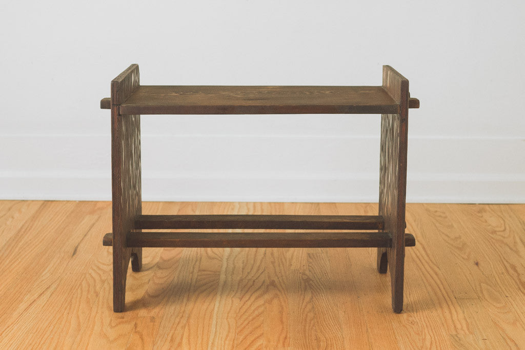 This vintage hand crafted rustic bench is dark stained oak. It's sturdy and in good shape with age related wear. Perfect for an entryway or bathroom. See pictures for detailed condition.