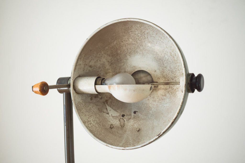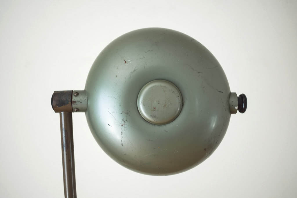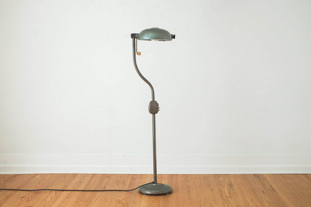 This Deco era industrial steel lamp has a heavy circular base and grey body with a double adjustable shade. It was manufactured in the USA by Hill-Rom Co. It works and is in good shape with age related wear. See pictures for detailed condition.