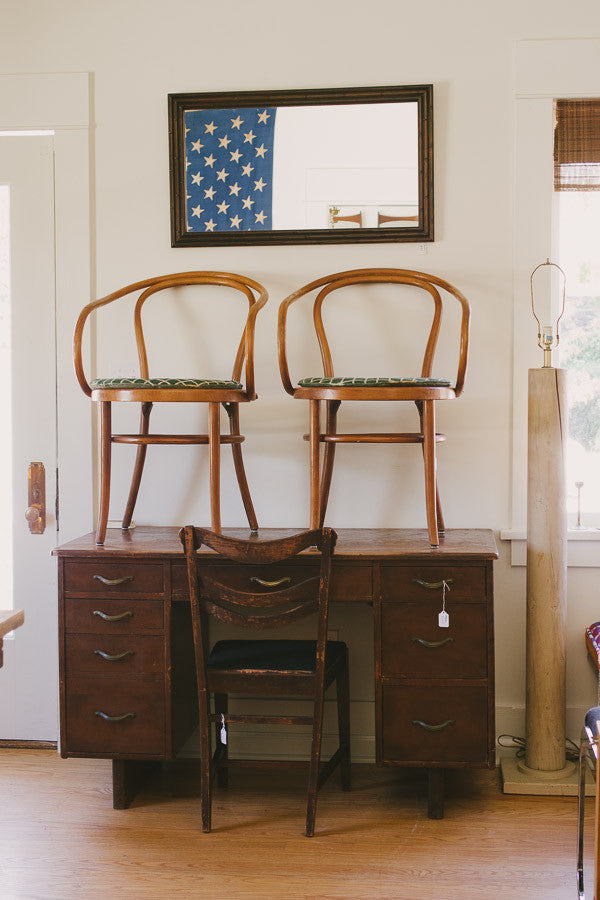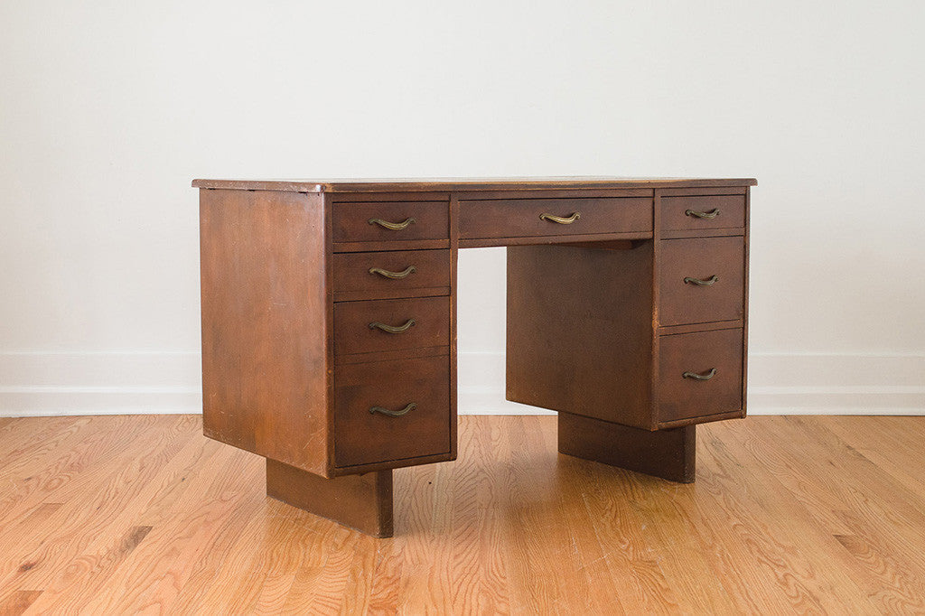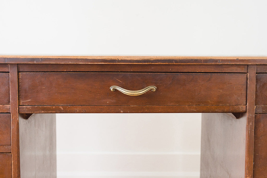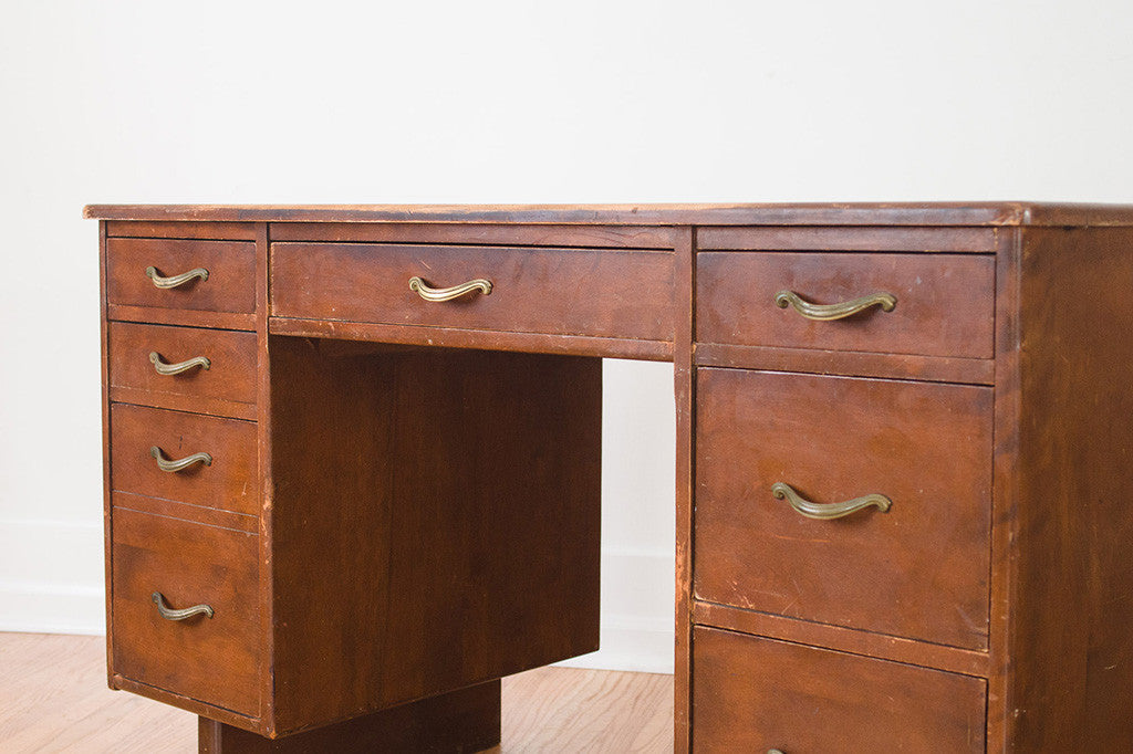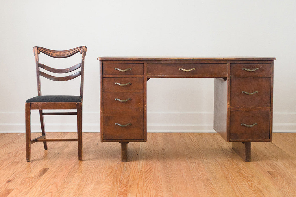 This vintage walnut desk has a beautifully distressed patina and brass art deco era hardware. It comes with a coordinating chair that's also naturally distressed and was recently reupholstered in gray wool. This set would be nice in a study or library. This desk is very heavy, it will have to be shipped freight. Please see pictures for detailed condition of these pieces.